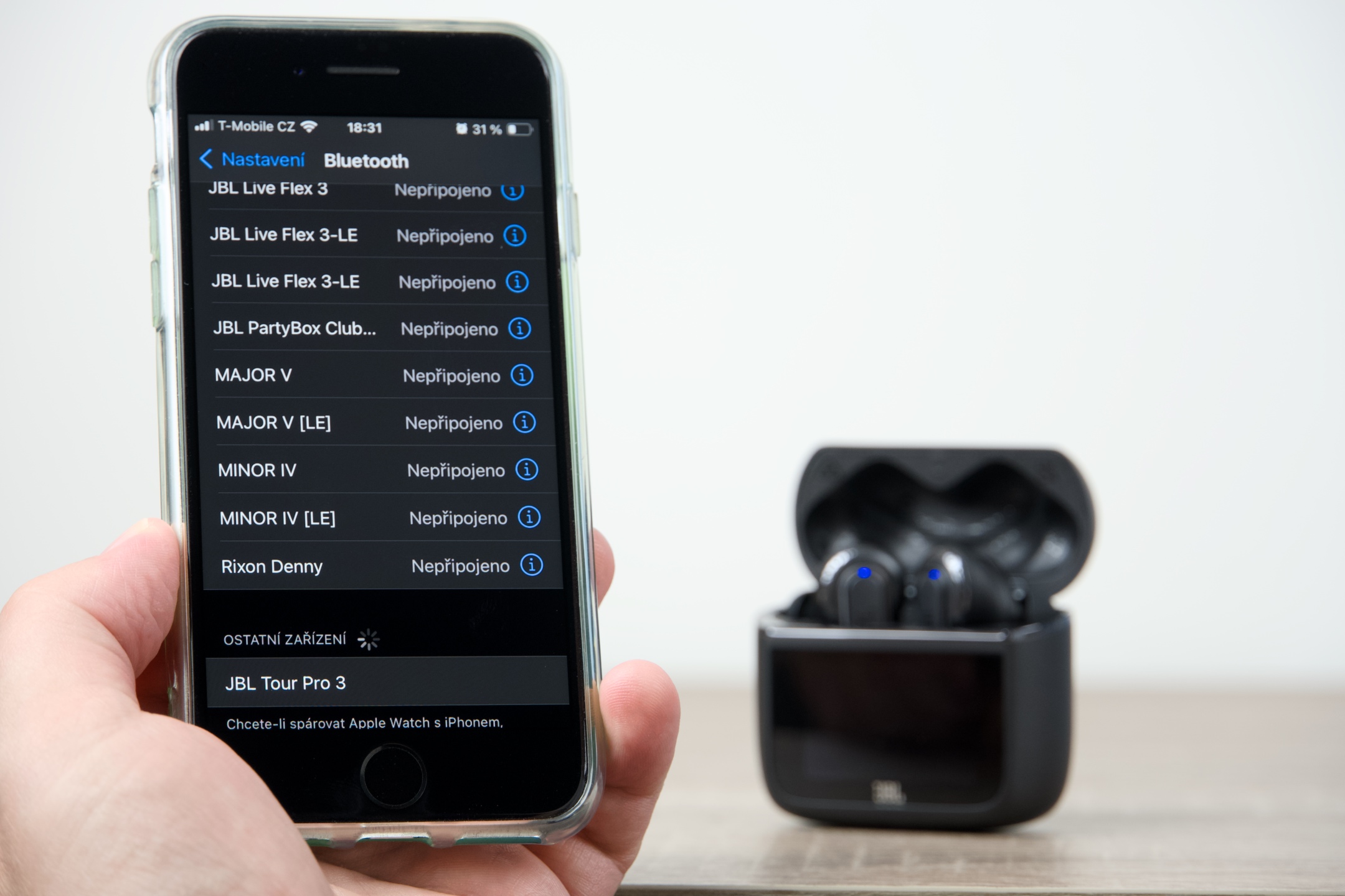 Zprovoznění bezdrátové komunikace probíhá klasicky přes systémové rozhraní, kde po otevření casu v seznamu dostupných zařízení stačí vybrat JBL Tour Pro 3. V rámci procesu párování budete vyzváni k povolení přijímat oznámení z iPhonu, což je nutné provést, chcete-li tuto funkci na displeji pouzdra využívat. Nyní již nastává čas zaměřit pozornost k aplikaci JBL Headphones, jež zdarma stáhnete v App Store nebo na Google Play.