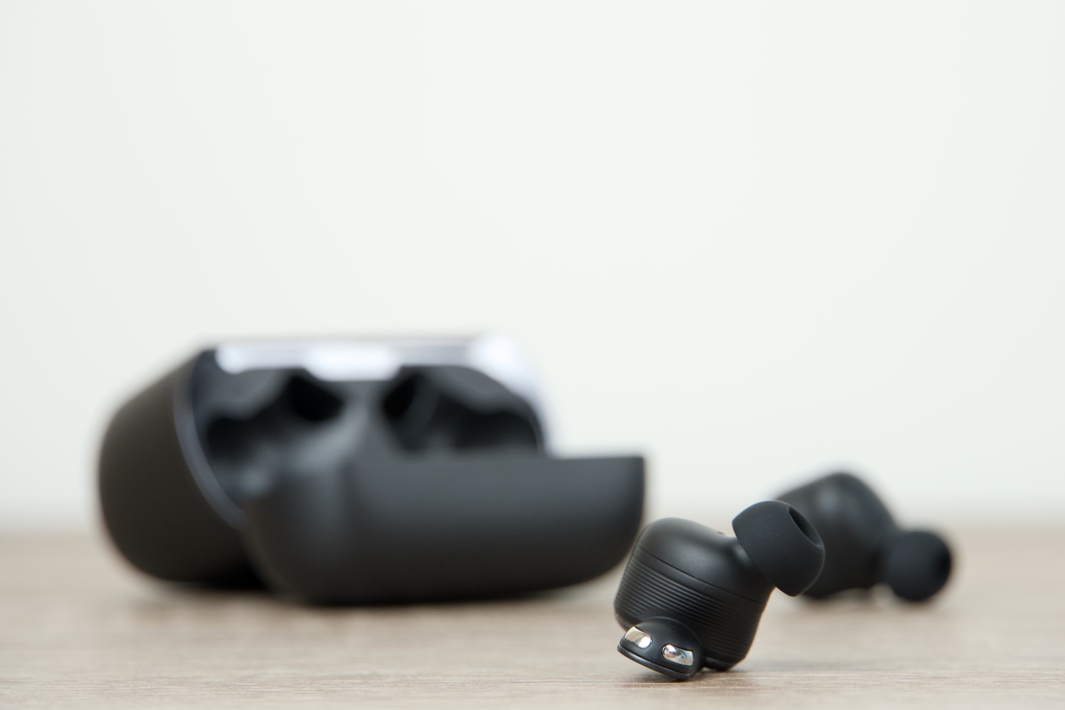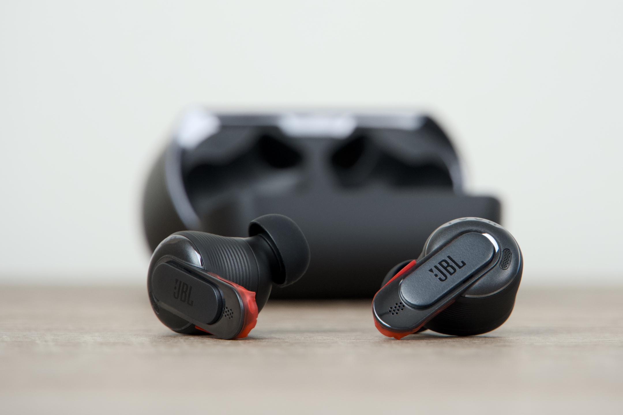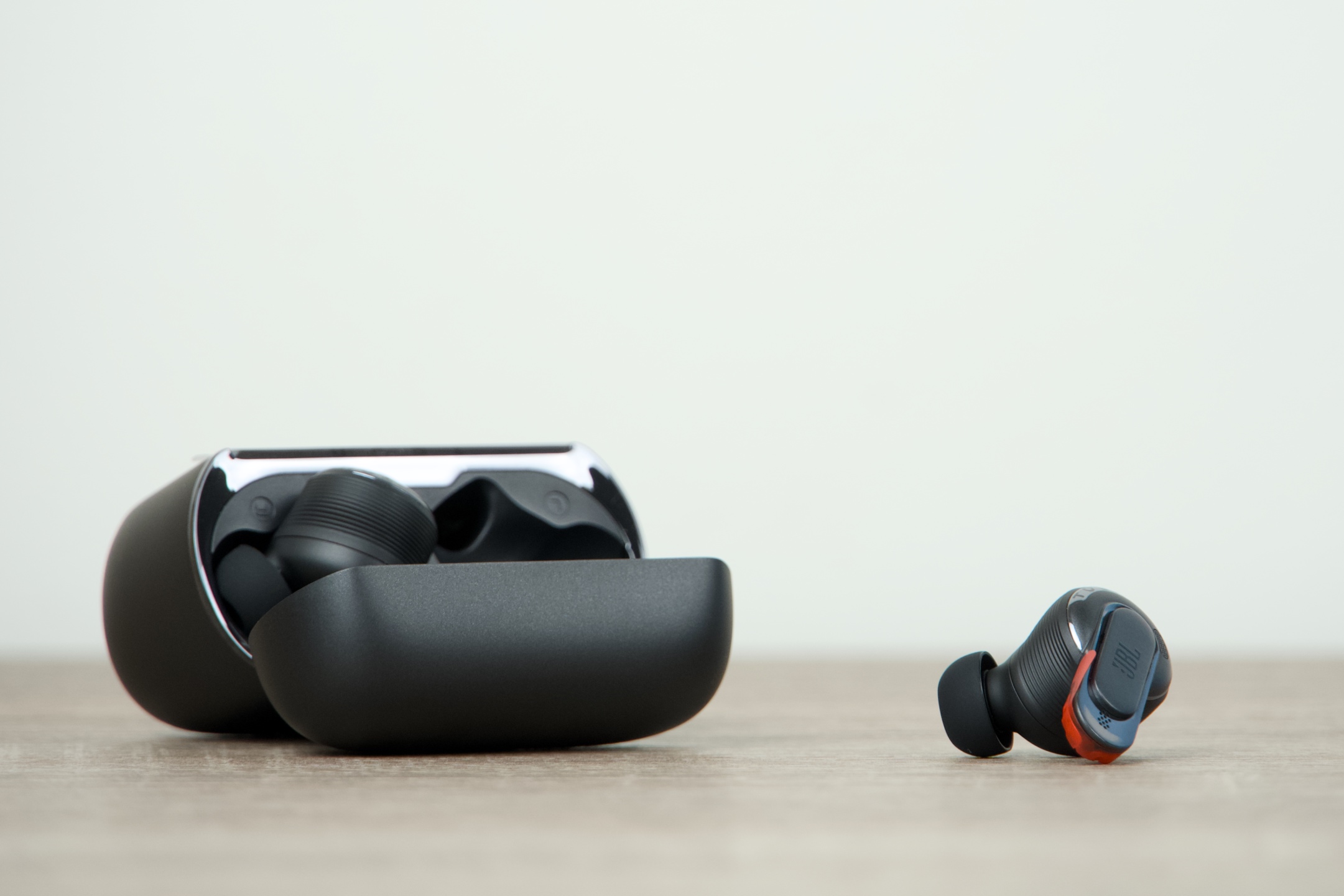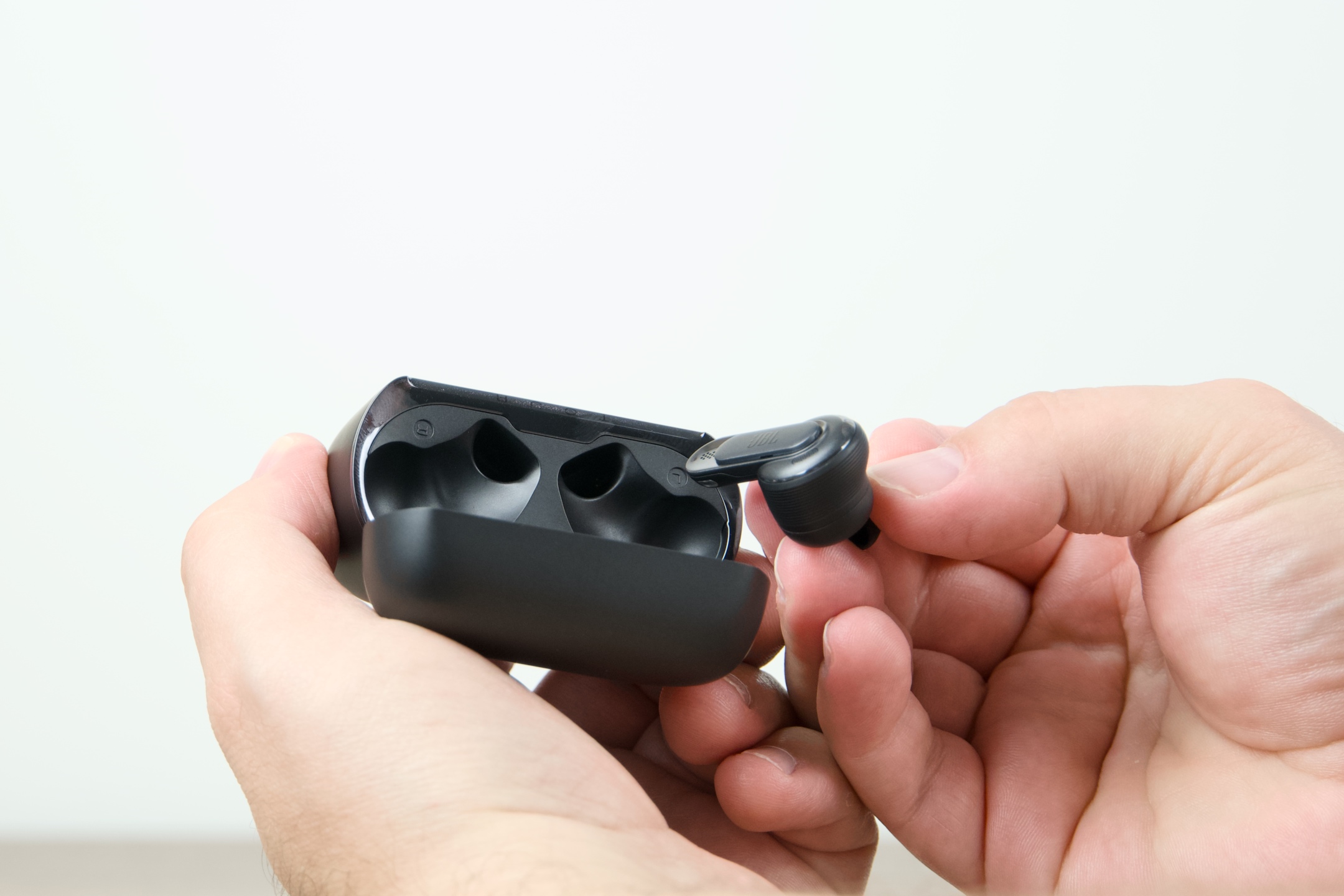 Tvar samotných sluchátek, jež do svých lůžek magneticky zapadají, se směrem k vnějšímu zvukovodu ucha zužuje, ovšem po zasunutí do sluchového orgánu vidíte kruh, na který navazuje relativně tenká stopka s ovládací plochou nahoře, logem a vespod opatřená kontaktními body pro nabíjení. Její viditelný přesah k lalůčku je něco málo přes 1 cm, takže působí na pohled velmi decentně. Jak bylo zmíněno úvodem, hmotnost se JBL podařilo ještě o něco snížit, pročež klesla z 6,1 g na kus k 5,6 g. Většina případných nečistot ulpívá díky umístění a podobě vyměnitelných nástavců právě na nich, což do značné míry eliminuje riziko jejich potenciálního proniknutí k reproduktorům.