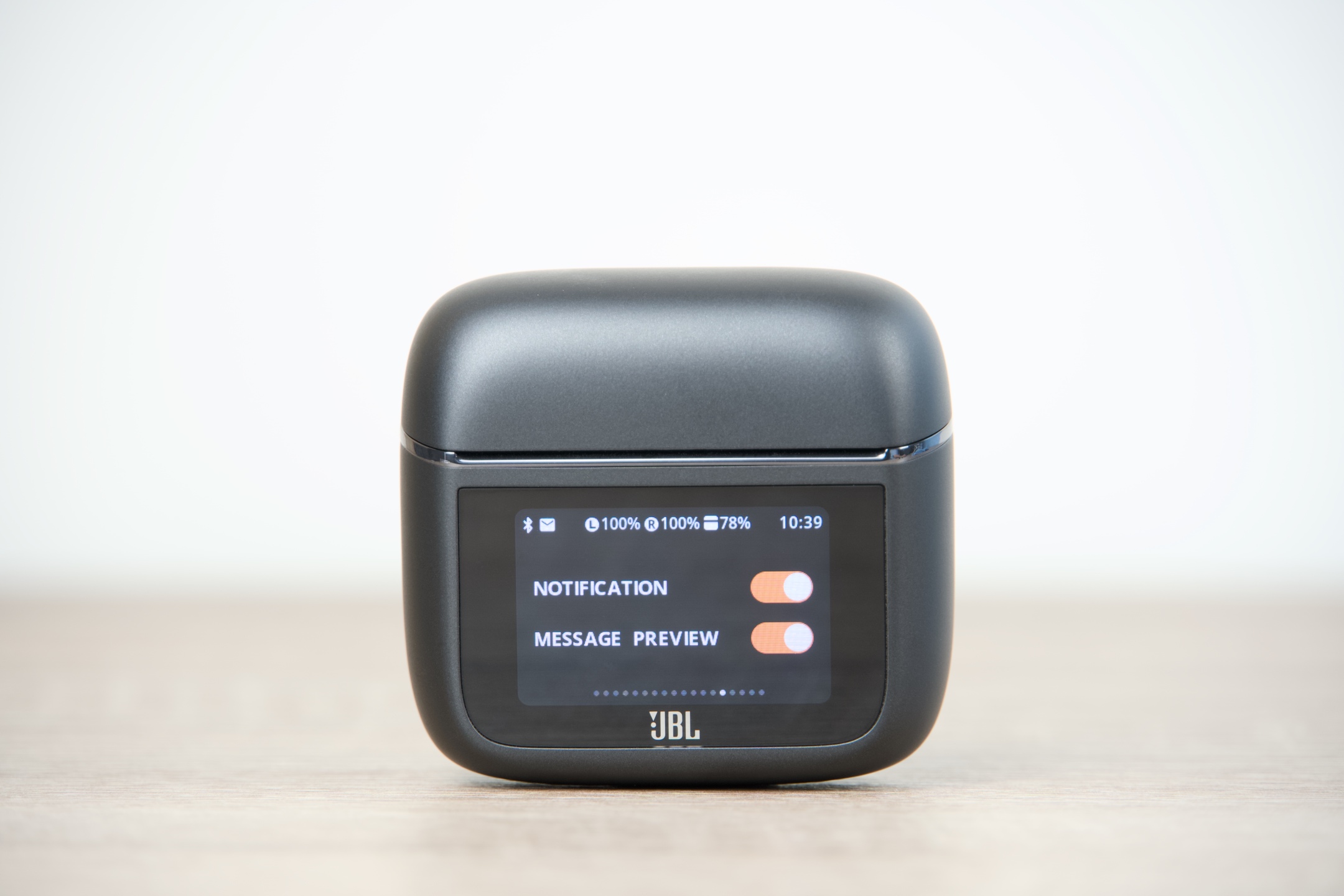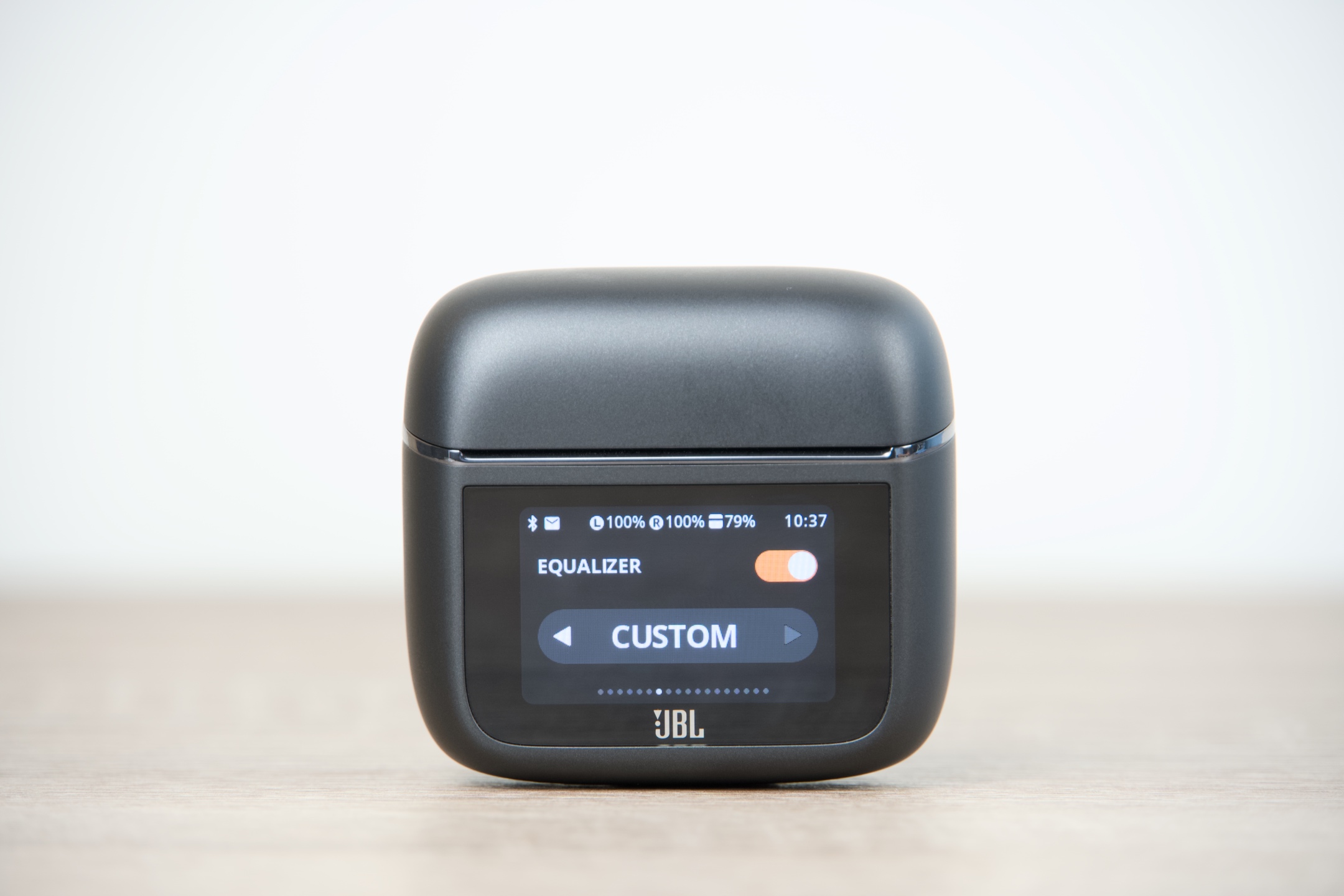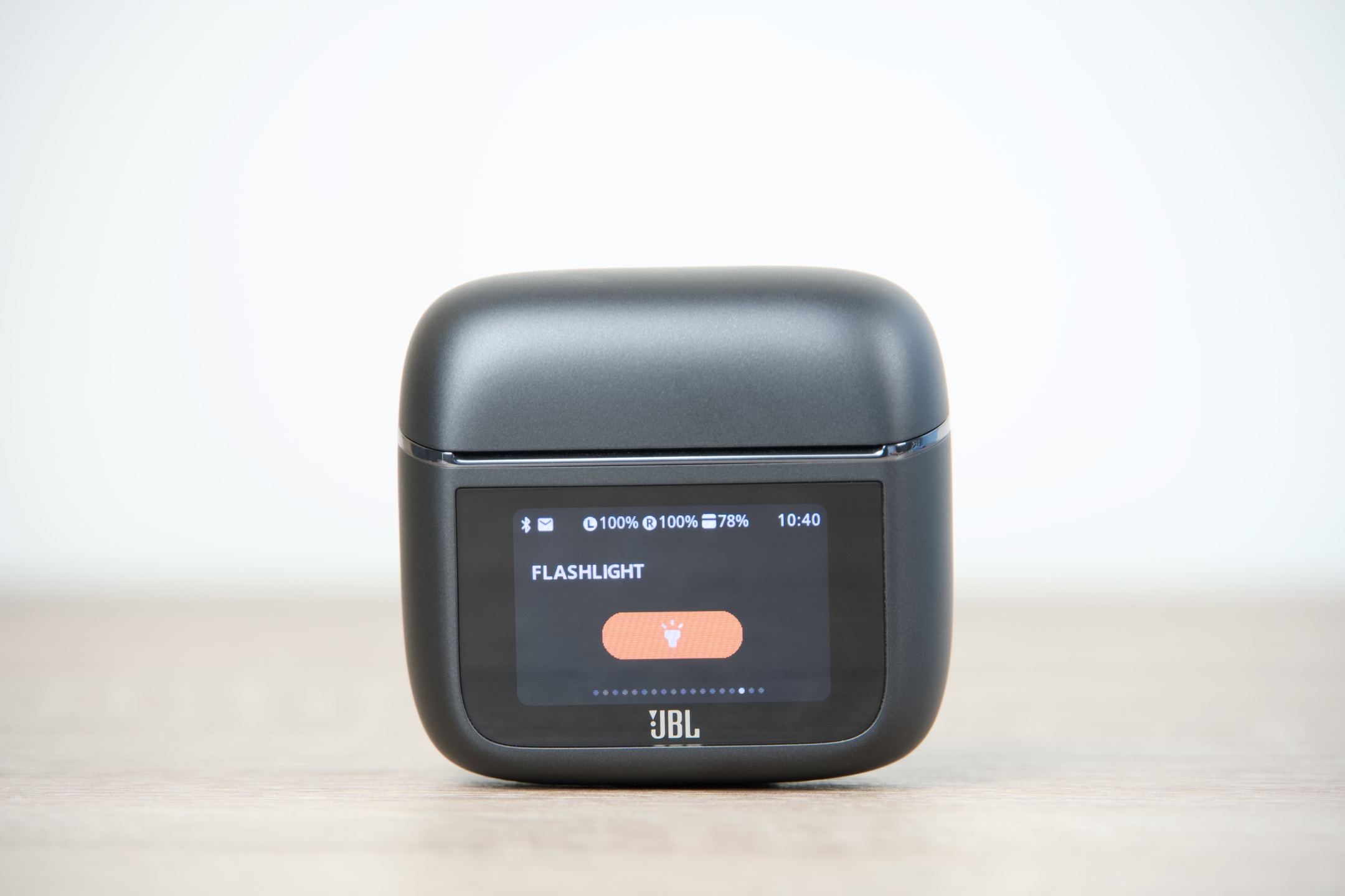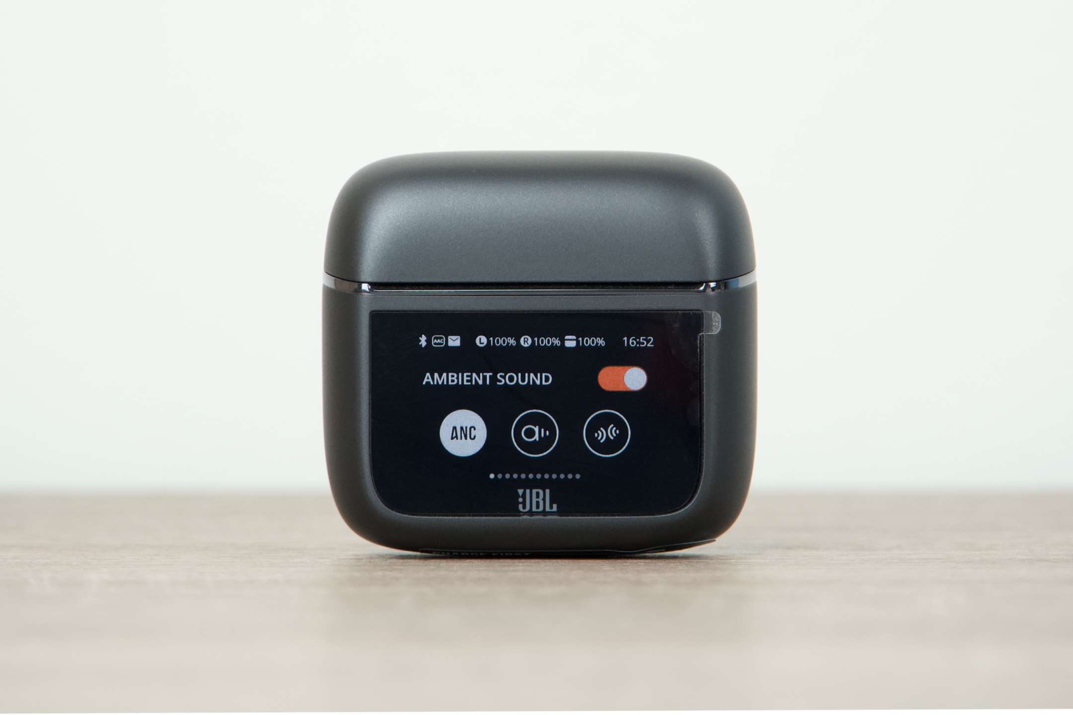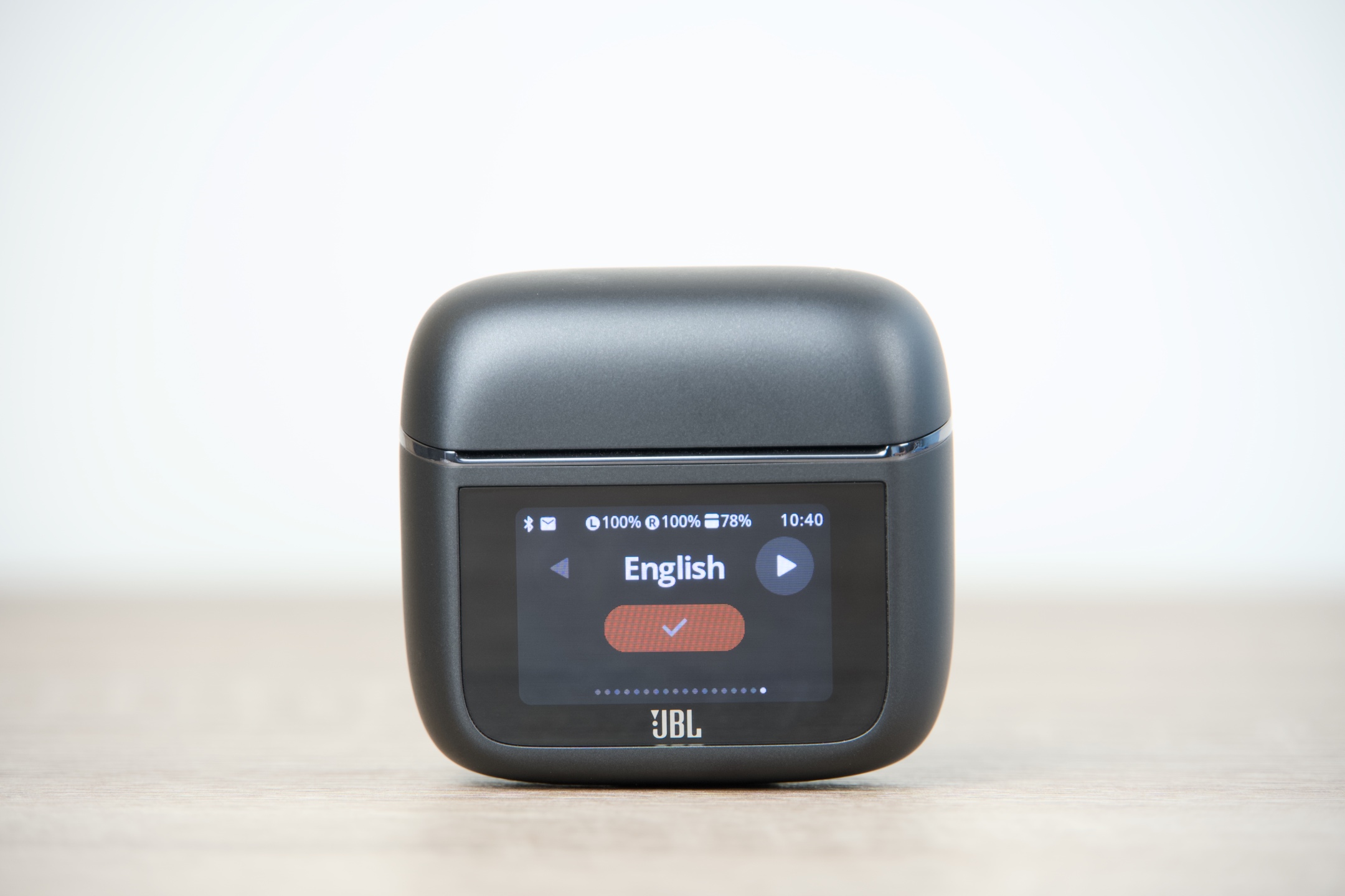 JBL Tour Pro 3 jsou k dispozici ve dvojím provedení – černém Black a béžovém Latte, čemuž vyjma kabelů odstínem odpovídají všechny jejich součásti. Pouzdro má s šířkou 6 cm, výškou 5,5 a hloubkou 2,8 cm v podstatě ideální rozměry, takže se bez problémů vejde do každé kapsy či přihrádky v zavazadle, ve kterém jej s 71,8 g z hlediska hmotnosti prakticky nezaznamenáte. Dotykový displej obdélníkového tvaru s úhlopříčkou 3,7 cm oproti předchozí generaci narostl o 30 %, což činí jeho používání ještě o něco pohodlnějším. Zadní plocha s protiskluzovou úpravou pak snadno poslouží pro potřeby bezdrátového dobíjení.
