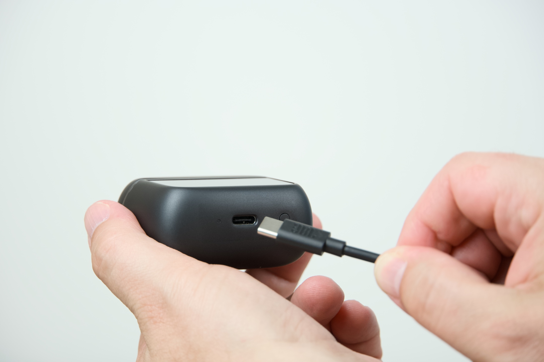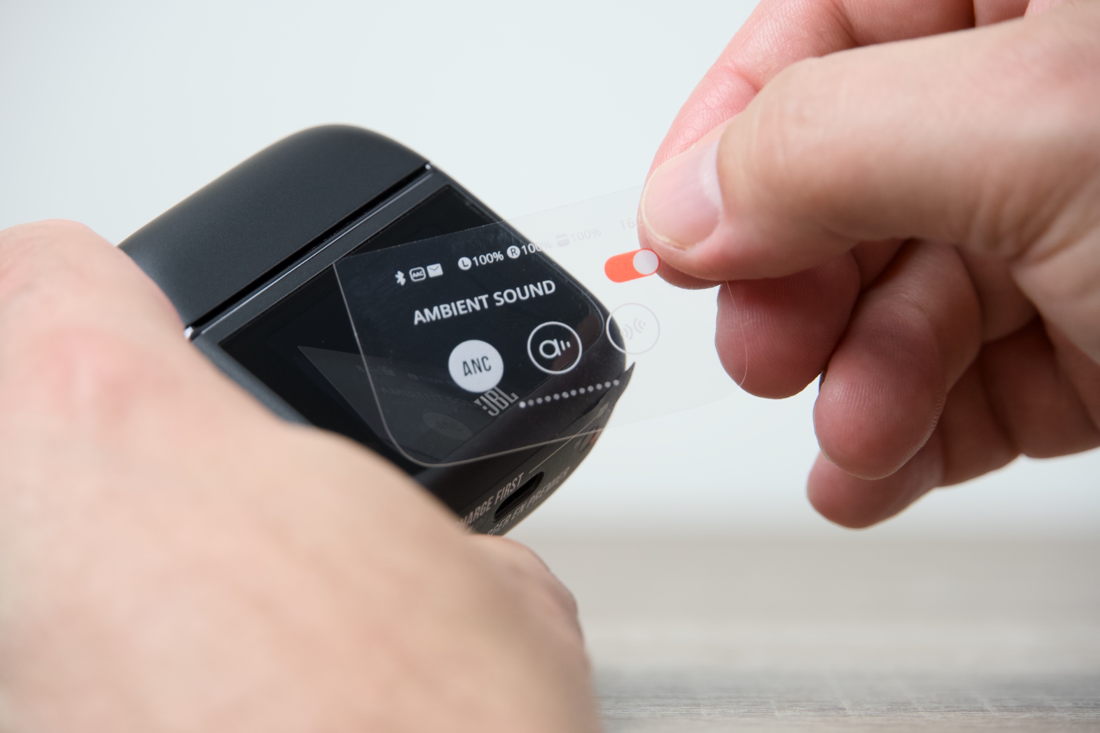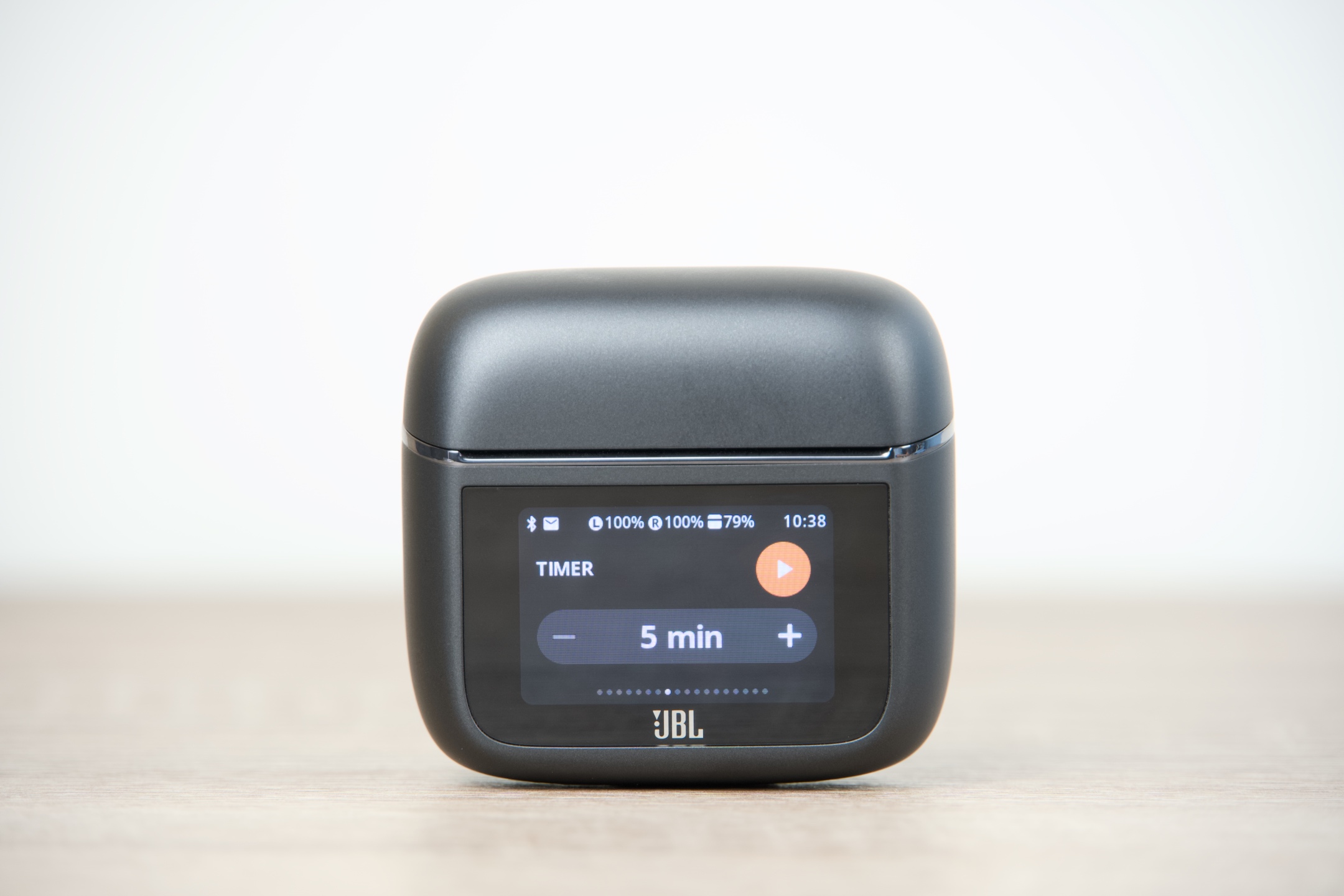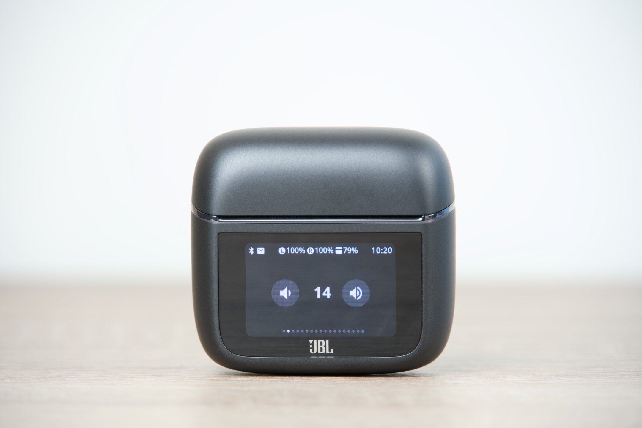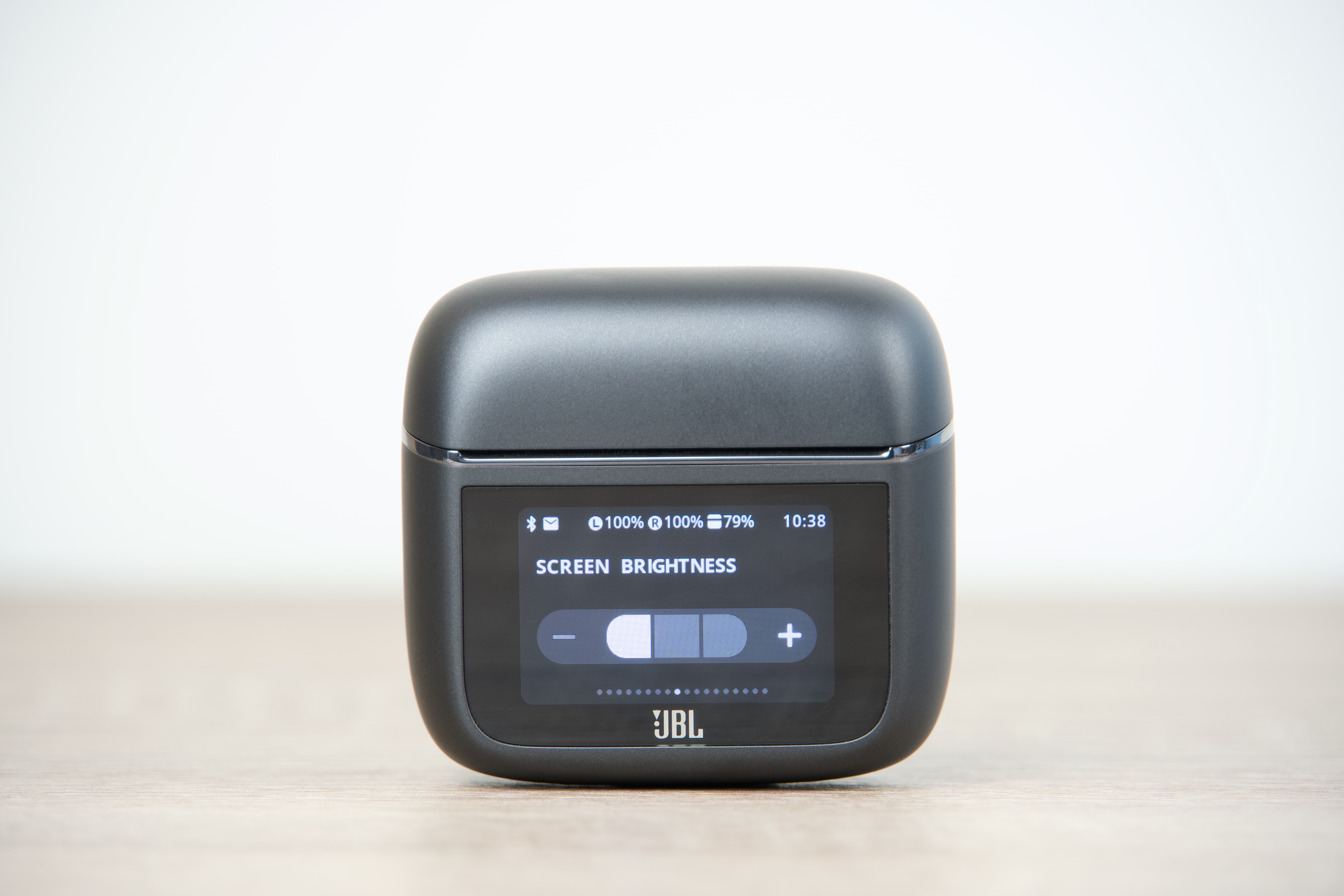 JBL Tour Pro 3 jsou k dispozici ve dvojím provedení – černém Black a béžovém Latte, čemuž vyjma kabelů odstínem odpovídají všechny jejich součásti. Pouzdro má s šířkou 6 cm, výškou 5,5 a hloubkou 2,8 cm v podstatě ideální rozměry, takže se bez problémů vejde do každé kapsy či přihrádky v zavazadle, ve kterém jej s 71,8 g z hlediska hmotnosti prakticky nezaznamenáte. Dotykový displej obdélníkového tvaru s úhlopříčkou 3,7 cm oproti předchozí generaci narostl o 30 %, což činí jeho používání ještě o něco pohodlnějším. Zadní plocha s protiskluzovou úpravou pak snadno poslouží pro potřeby bezdrátového dobíjení.