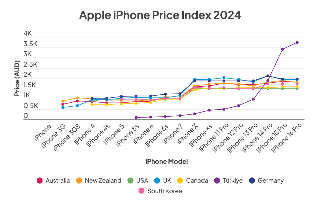 • Zatímco v roce 2010 bylo nejdražší zemí pro nákup iPhonu 4 Německo, nyní se místo něj stalo nejdražší zemí Turecko, kde iPhone 16 stojí od 2 925 AU$ nebo chcete-li od 3 735 USD za iPhone 16 Pro – což je více než dvojnásobek ceny ve Spojených státech a Kanadě.