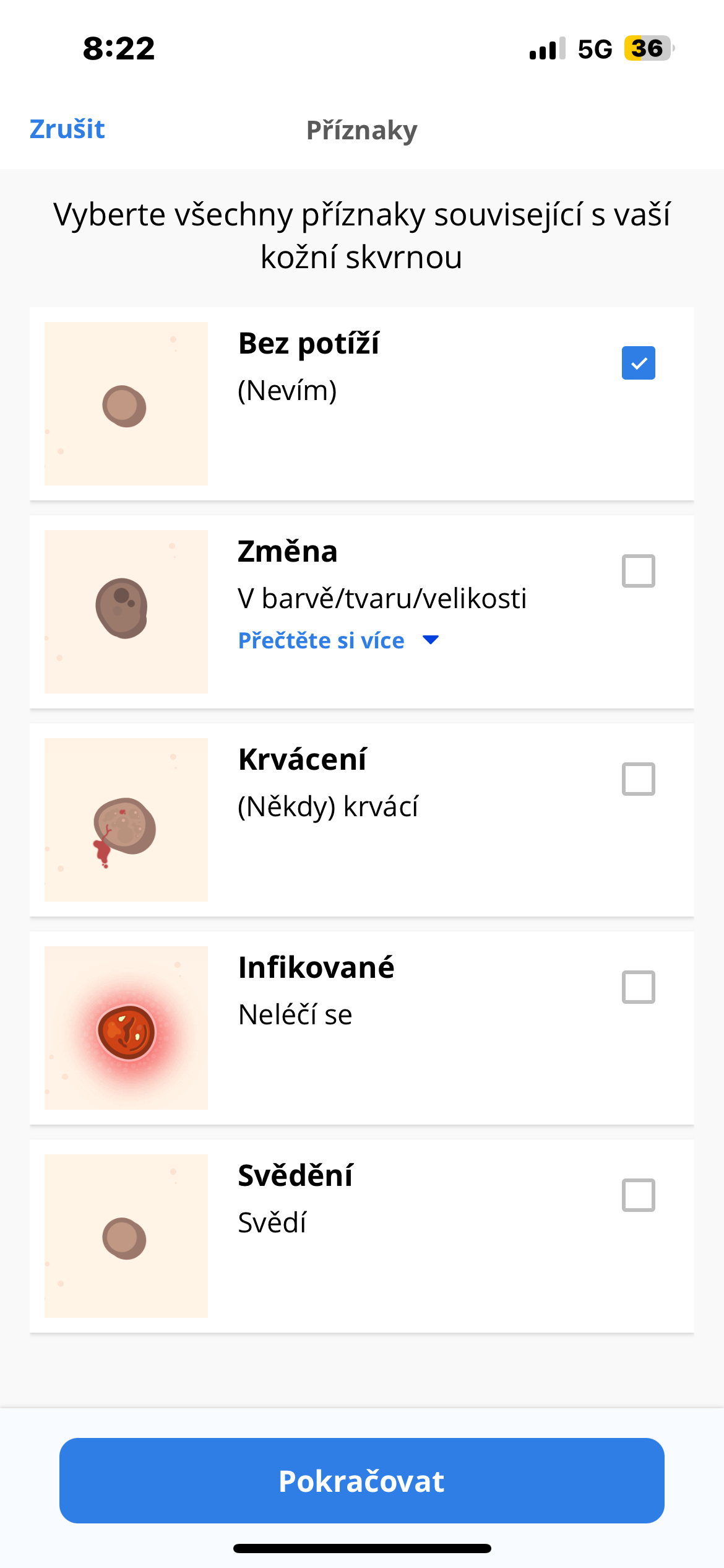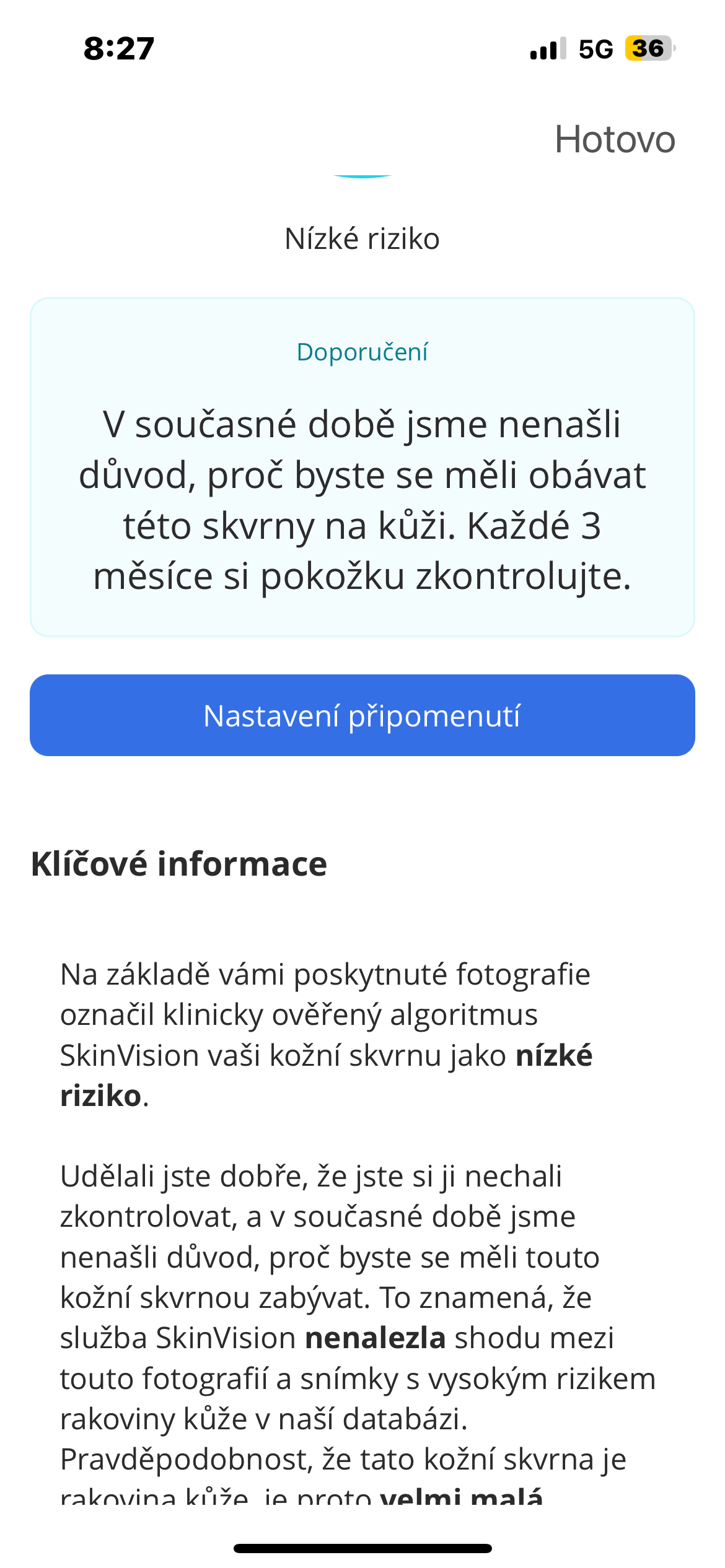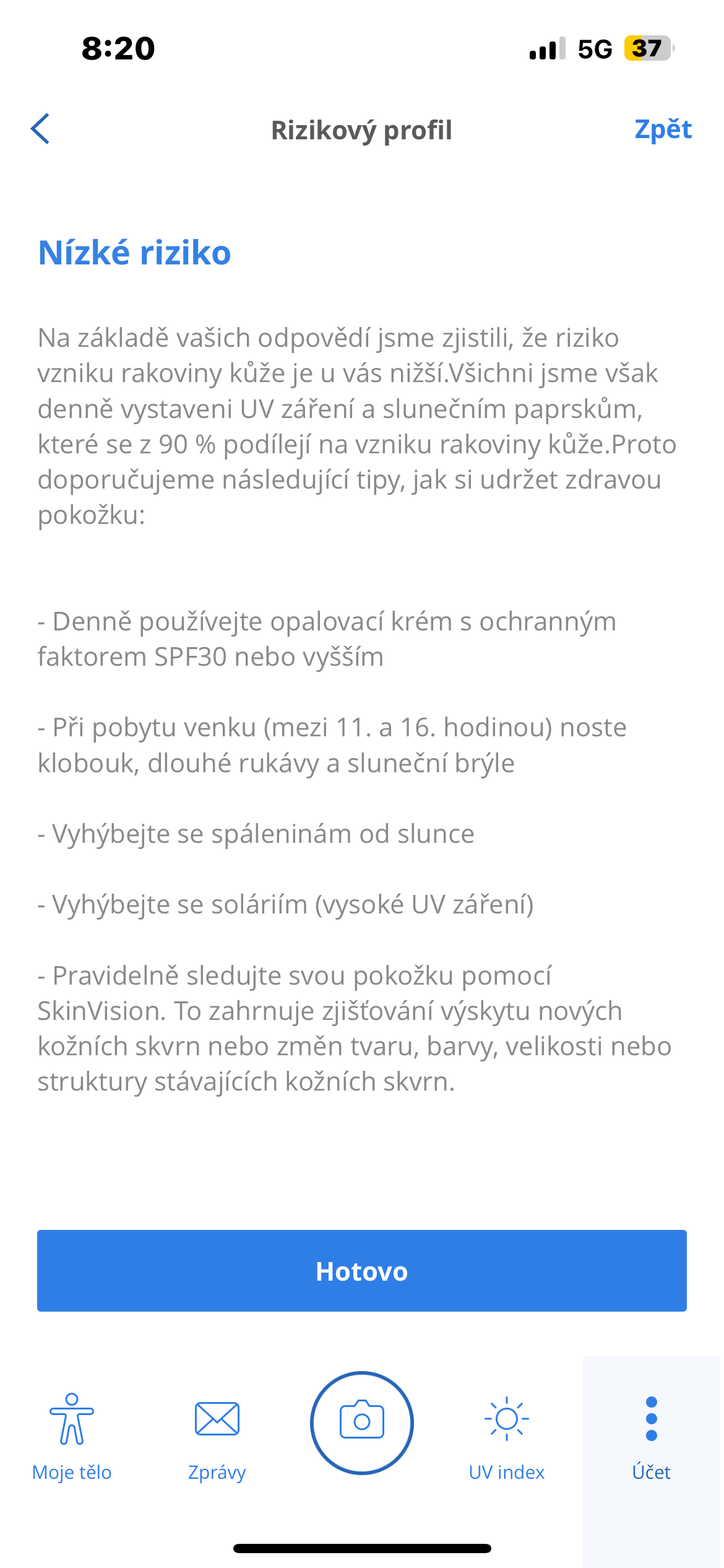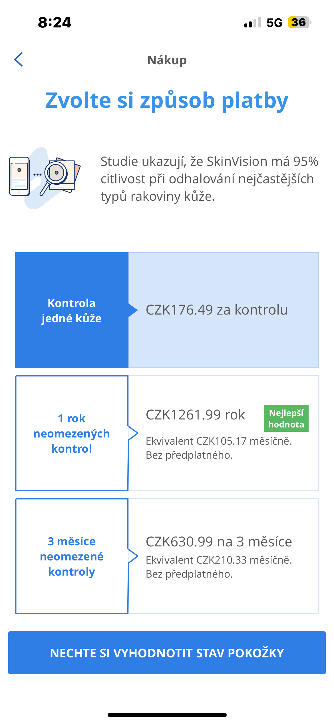 Jak funguje aplikace SkinVision a jak s ní pracovat? Po stažení aplikaci jednoduše spustíte a provedete jednoduchou, relativně rychlou registraci. V rámci registrace zadáváte mimo jiné datum vašeho narození – aplikace je určena pro uživatele starší 18 let. Domovská obrazovka aplikace může na první pohled působit matoucím dojmem, rychle se ale zorientujete. Můžete si udělat test typu pleti, vytvořit rizikový profil, nastavit připomínku kontroly znamének, ale především – naskenovat postupně jednotlivá znaménka. Ohledně skenování znamének vás aplikace spolehlivě naviguje. Přestože aplikace jako taková je zcela zdarma, kontrola znamének bohužel bezplatná není. Jedná se o vysoce kvalitní službu, na jejímž poskytování se podílí odborníci. Jedna kontrola vás vyjde na necelých 180 korun, za cca 1260 korun si zajistíte celý rok neomezených kontrol. Podle dostupných informací by použití aplikace měla zpětně proplácet OZP, časem se možná přidají i další české pojišťovny.