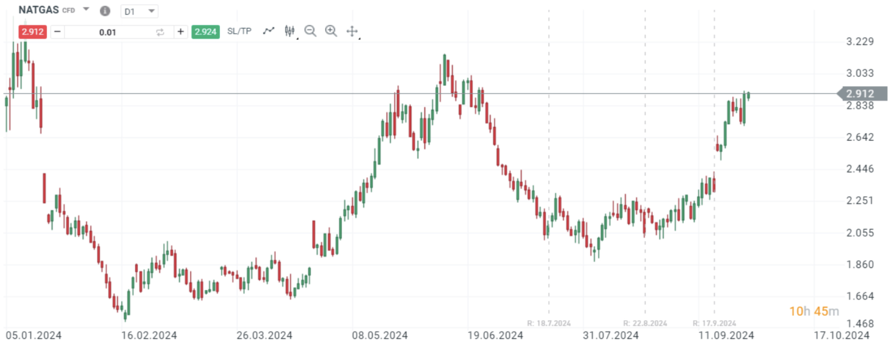 Růst zažívá také americký zemní plyn (NATGAS), jehož cena se od srpna zvedla už o více než 50 %. V tomto případě se jedná o očekávaný jev z důvodu sezónnosti. Díky blížící se topné sezóně se očekává nárůst poptávky po zemním plynu. Cenu také paradoxně v posledních měsících tlačilo nahoru i nadprůměrně teplé počasí v USA. Plyn se totiž spotřebovává i k pohonu klimatizací. Zásoby zemního plynu sezónně rovněž rostou, nicméně celkově jsou zásobníky méně plné než v předchozích letech. Nabídku na trhu navíc ovlivňuje hurikán Hellen, který v nedávné době zasáhl USA.