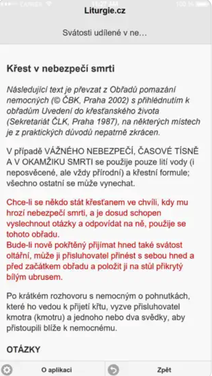 Pokud nejste kněz (pokud jste kněz, pak tento článek nejspíš ani nečtete, protože vše potřebné si vždy nosíte s sebou ve fyzické podobě a jedinou aplikací, bez které se neobejdete, je Kalendář – a možná také některá z relaxačních aplikací), bude pro vás aplikace LiturgieCZ spíše jakousi zajímavostí a vhledem do „kněžské praktické práce“. Najdete zde totiž popis jednotlivých obřadů, svátostí a úkonů, a to včetně příslušných textů. Pokud se třeba poprvé chystáte do (římskokatolického) kostela a chtěli byste vědět, co vás se vším všudy čeká, může se vám LiturgieCZ hodit.