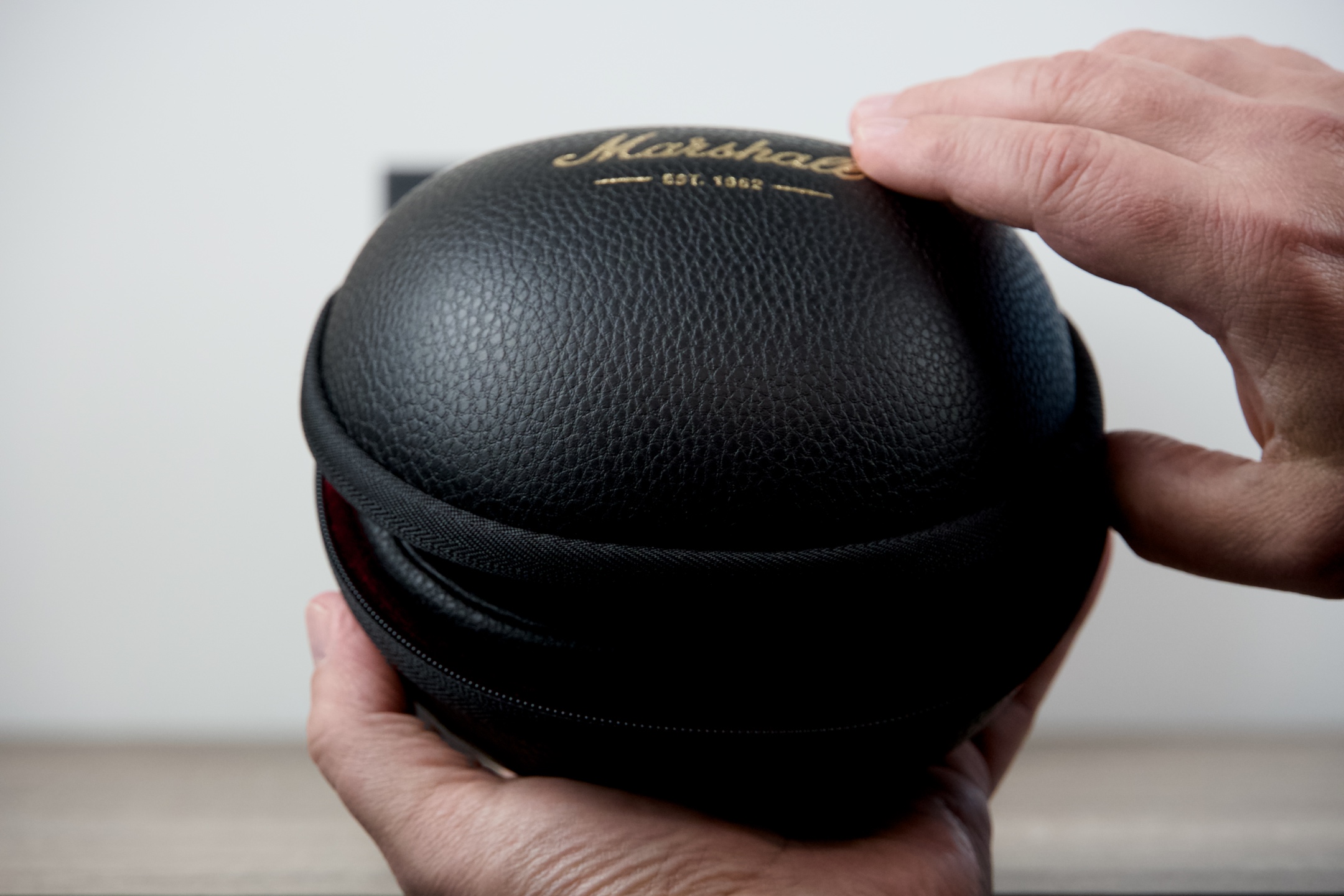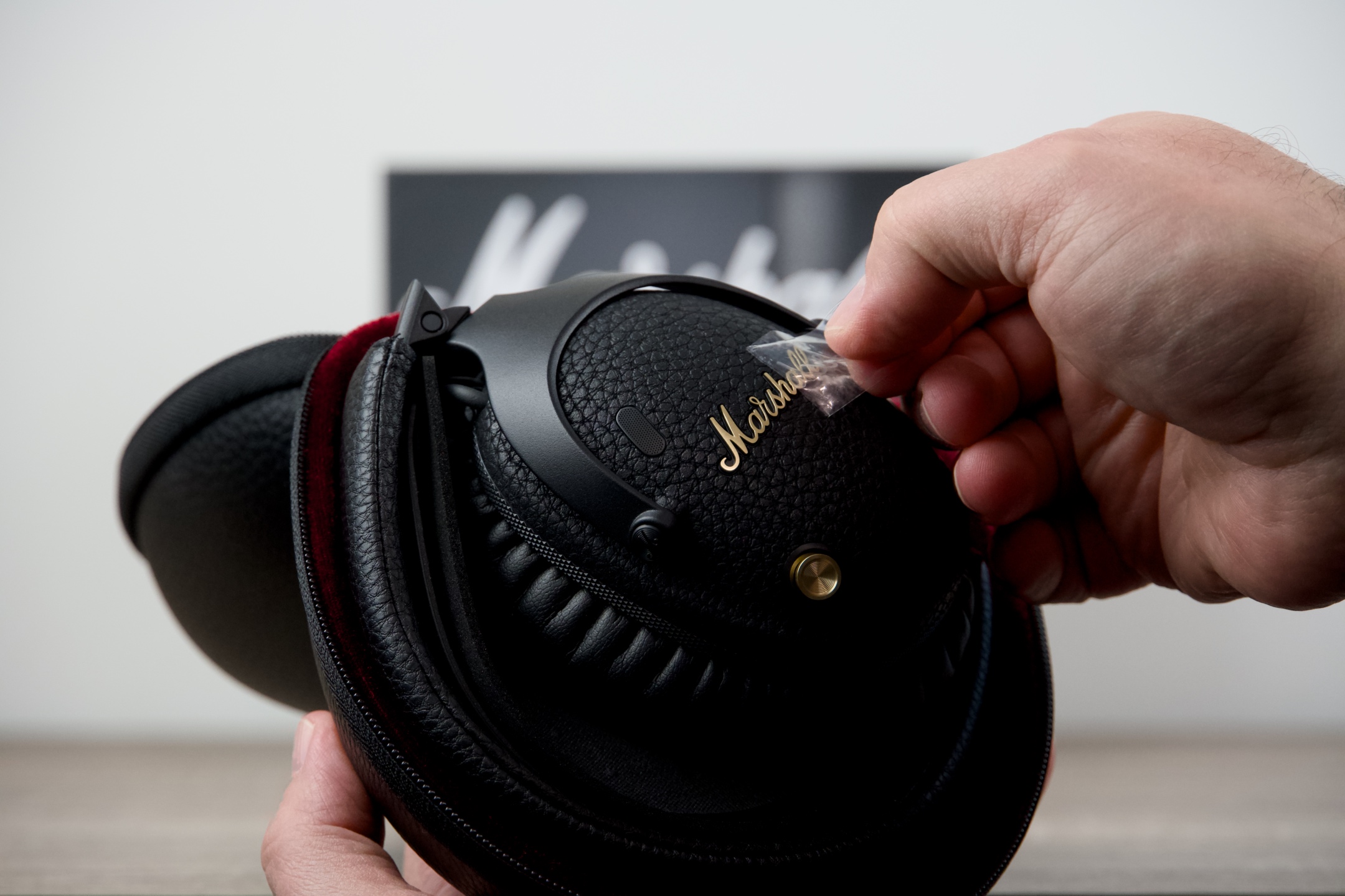 Do typicky černé krabice s potiskem proniknete sejmutím přelepek na spodní straně a vysunutím. Poté se před vámi objeví pouzdro se zlatým nápisem Marshall, které stačí uchopit za poutko, rovněž s vyraženým názvem značky, a vytáhnout jej z lůžka, v němž je zasazeno.