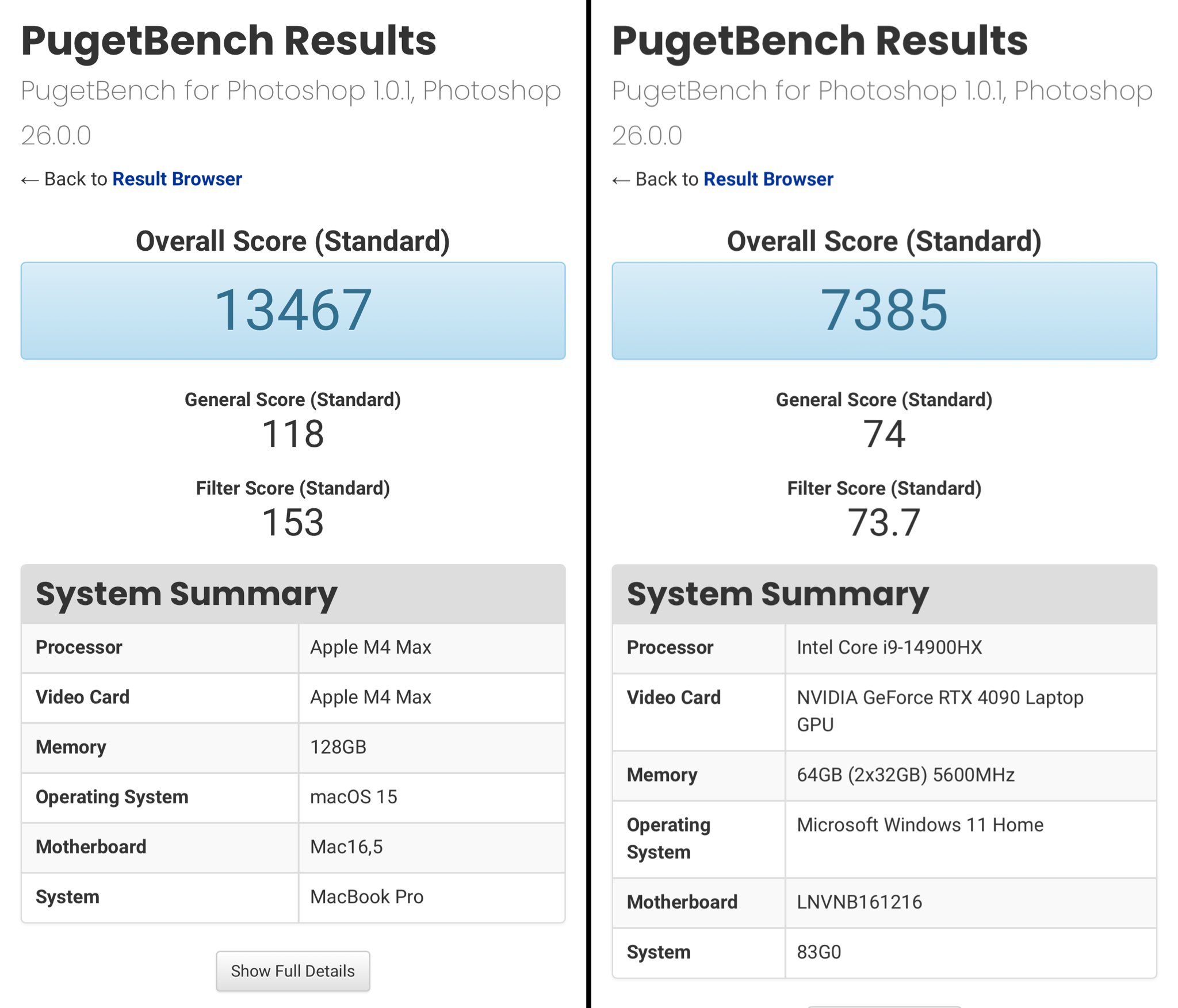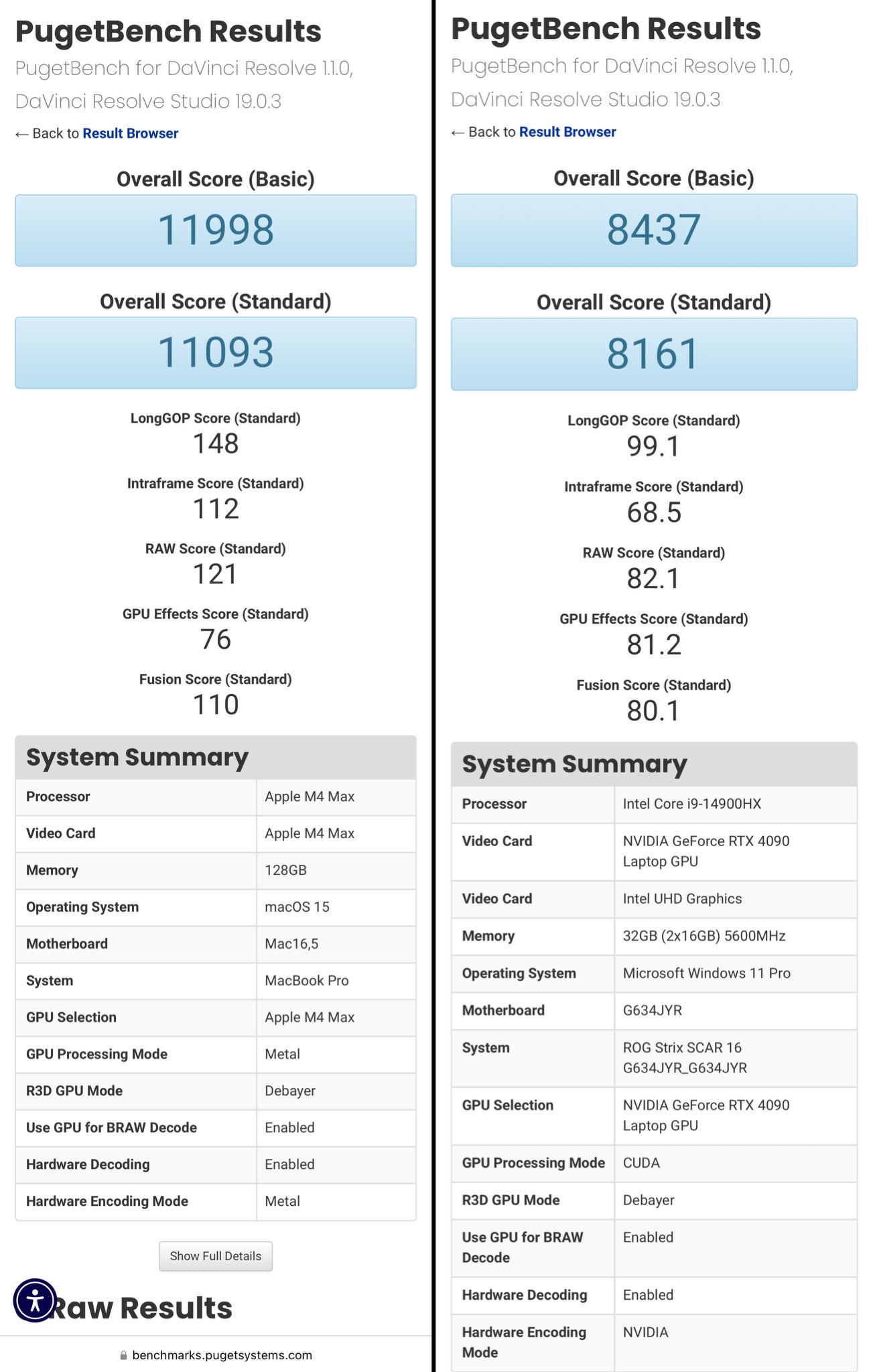 Když Apple minulý týden světu představil novou generaci Pro verze čipů Apple Silicon, dost jejich výkonnostními testy zaujal. Někteří uživatelé sice čísla, která Apple zveřejnil, zpochybňovali, nicméně čím blíž je zítřejší start prodejů těchto strojů a tedy se na světlo světa dostává více a více informací o strojích, tím se zdá být výkon čipů impozantnější. Na X se například nyní objevil benchmarková měření přes PugetBench ukazující, jak si vede M4 Max ve srovnání s procesorem Intel Core i9-14900HX v kombinaci s grafikou NVIDIA GeForce RTX 4090. Jak můžete sami na výsledném skóre níže vidět, výkonnostně je od této kombinace čip M4 Max neuvěřitelně odskočený a je tedy jasné, že práce s ním bude pro uživatele hotová pohádka.