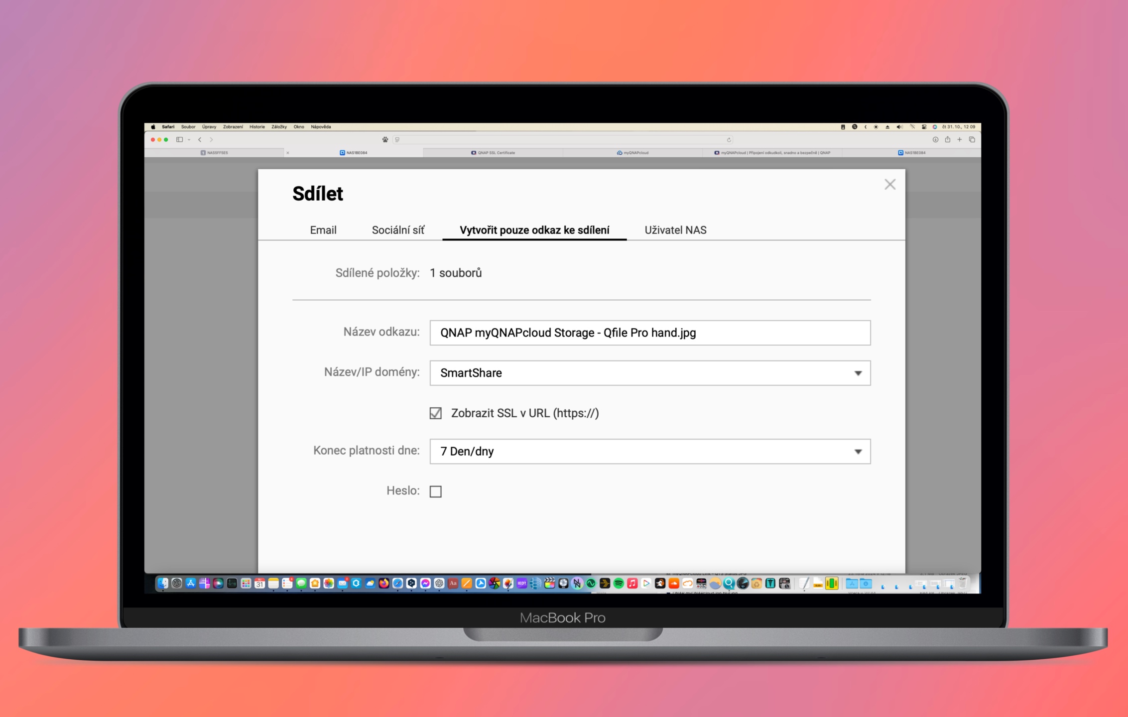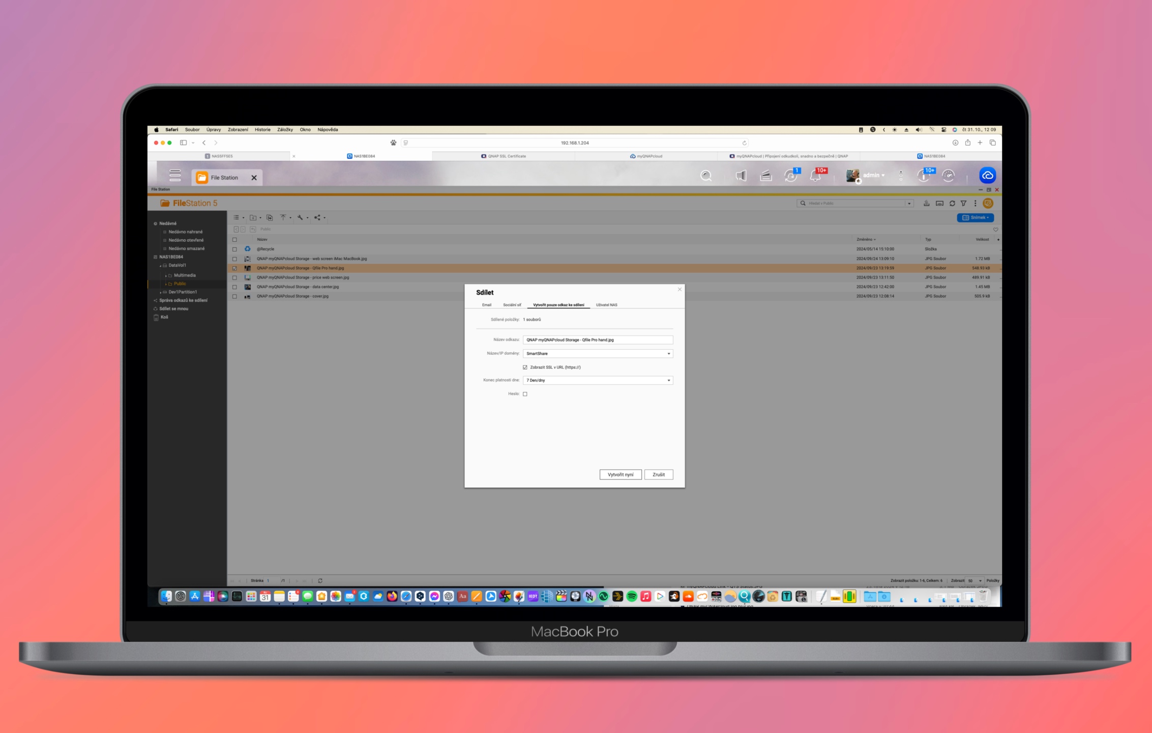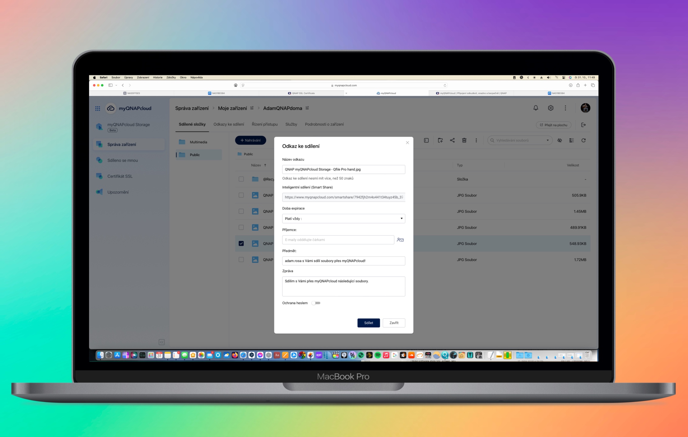 Kliknutím na ikonu zařízení v seznamu na myQNAPcloud a přihlášením uživatele NAS se můžete odkudkoliv pohybovat složkami i organizovat soubory, včetně jejich sdílení, přičemž o tomto svém záměru můžete příjemce informovat předpřipravenou šablonou či vlastním sdělením, nastavit platnost odkazu a ten v případě potřeby též chránit heslem.