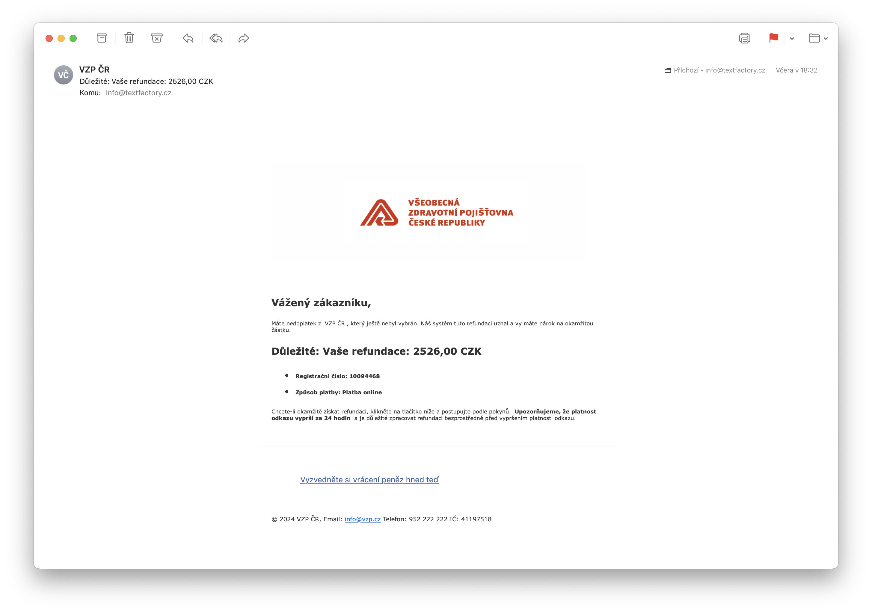 Během posledních dní možná i vám dorazil do mailové schránky email, který vám nabízí refundaci od VZP. Jedná se o scam, který se z vás snaží vylákat přístupové údaje k vaší platbní kartě. Odkaz směřující na vyzvednutí údajné refundace je podvodný stejně jako celý email a pokud jej obdržíte, smažte jej. Email se na první pohled tváří jako od VZP, ovšem již po zobrazení hlavičky emailu nebo samotného mailu odesilatele zjistíte, že s VZP nemá nic společného. Pokud podobný mail nebo jakýkoli jiný podezřelý mail dostanete, vždy si nejprve zkontrolujte adresu odesilatele, případně pak odkaz, který v mailu najdete tím, že rozkliknete celé URL.