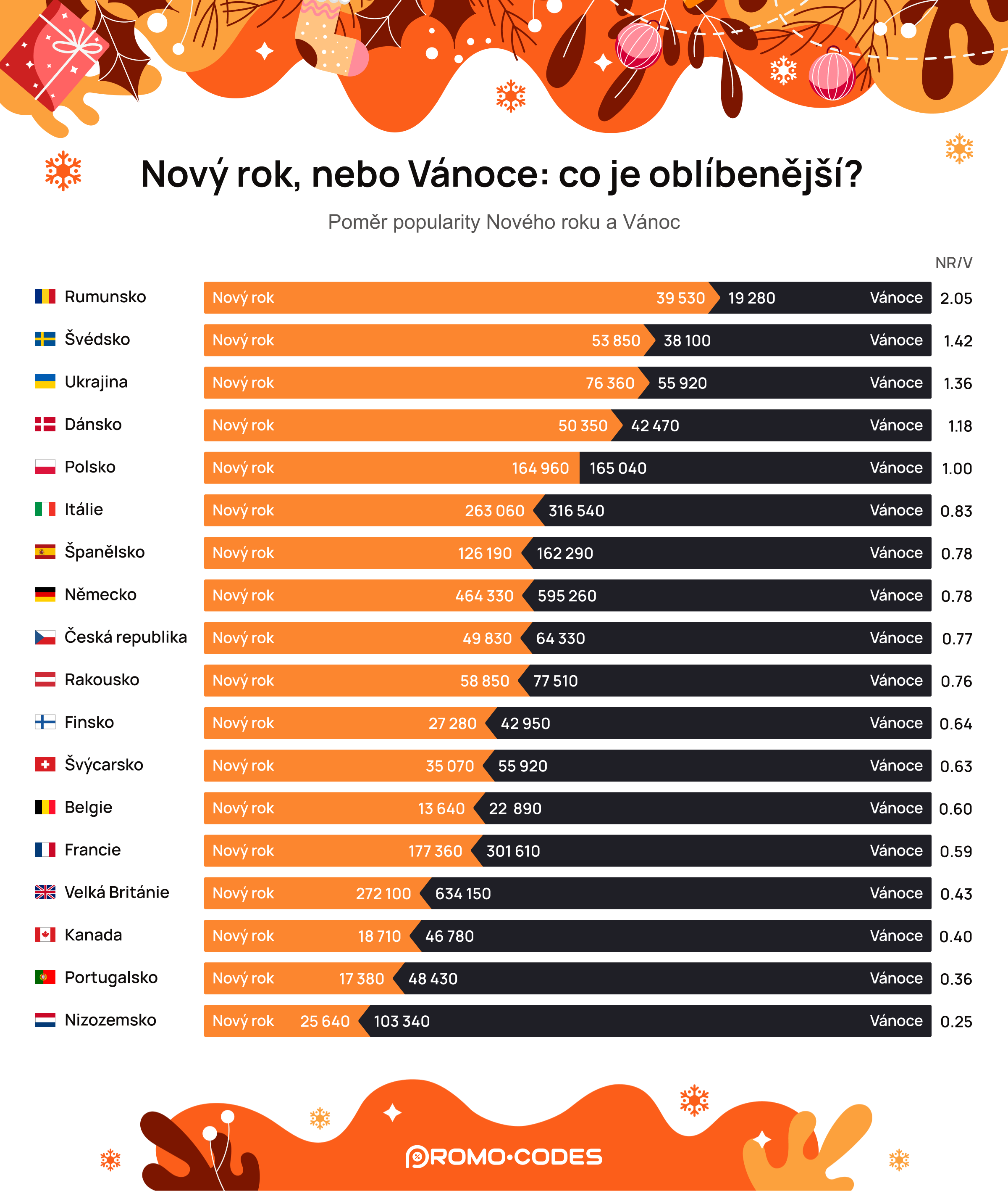 V České republice se Vánoce těší o něco větší oblibě než Nový rok (koeficient oblíbenosti 0,77). Tento poměr je podobný jako v Německu (koeficient 0,78), avšak výrazně se liší od Rumunska, kde je Nový rok populárnější (koeficient 2,05). Zatímco v některých zemích jsou oblíbené bujaré silvestrovské oslavy, Češi dávají přednost poklidným rodinným setkáním, kde na stole nechybí tradiční pokrmy, jako smažený kapr a bramborový salát.