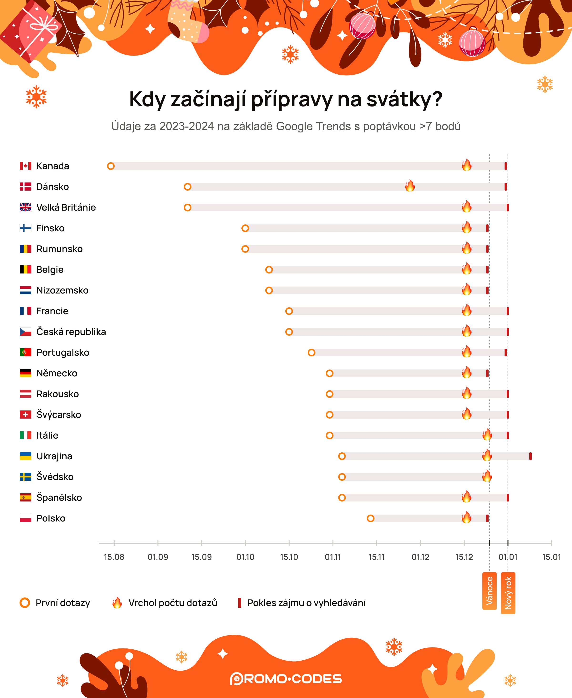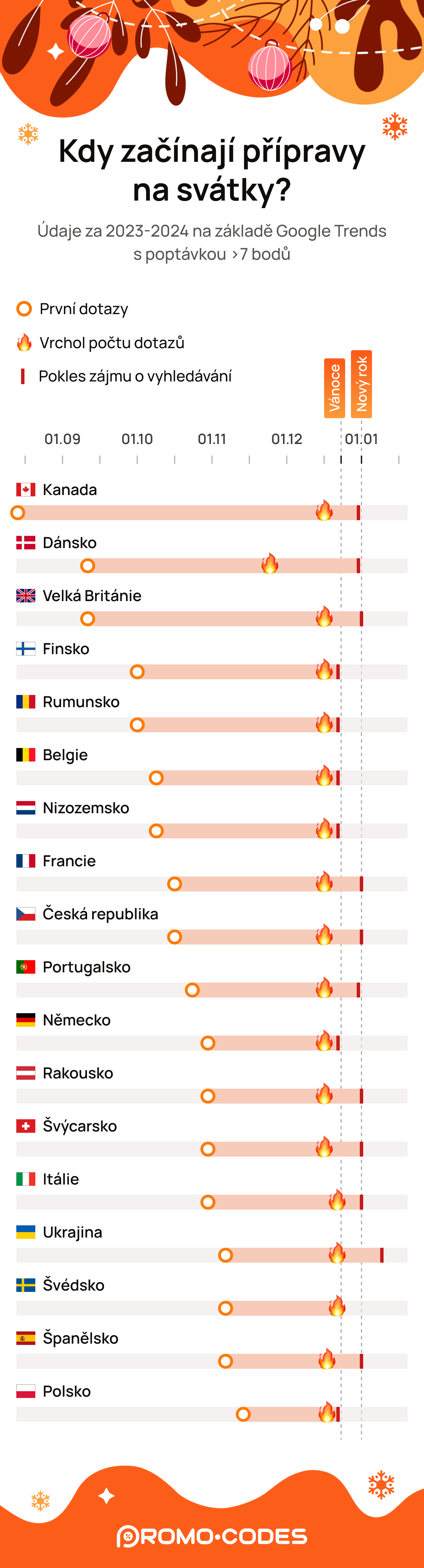 Analýza vyhledávání spojeného s Vánocemi a Novým rokem mezi obyvateli různých zemí ukázala, že Češi se více spoléhají na tradiční způsoby příprav než na internet. Výzkum odhalil, že Češi zadávají méně online dotazů souvisejících s Vánocemi (celkem 1,75 milionu vyhledávání, tedy 0,1621 na obyvatele) ve srovnání se zeměmi jako Francie (0,7843 na obyvatele) nebo Německo (0,3199 na obyvatele). Tento rozdíl ukazuje silně zakořeněnou kulturní tradici, kdy se přípravy na svátky opírají o zvyklosti a zkušenosti předávané z generace na generaci.