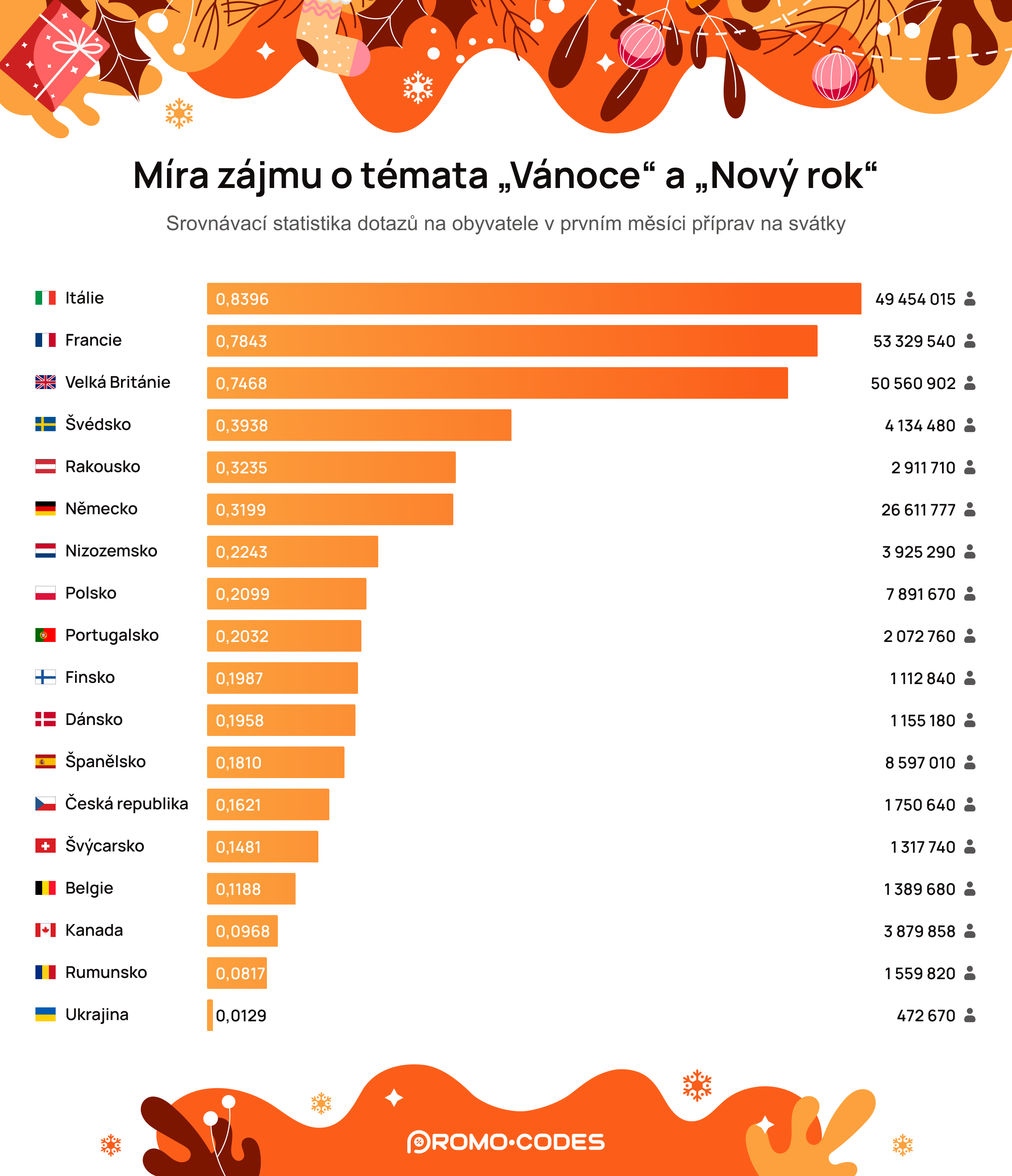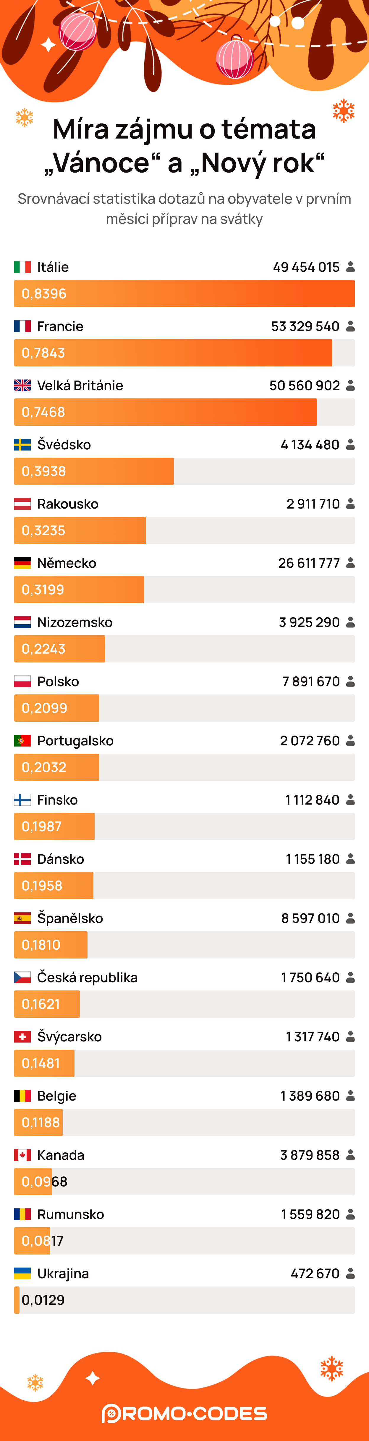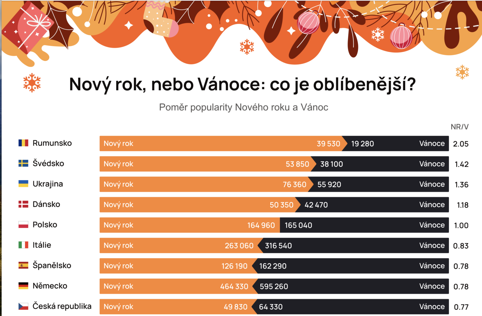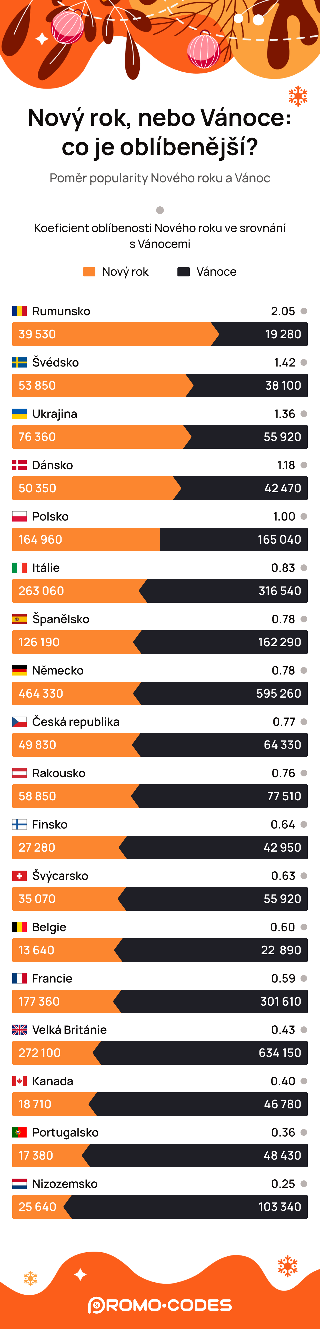 V České republice se Vánoce těší o něco větší oblibě než Nový rok (koeficient oblíbenosti 0,77). Tento poměr je podobný jako v Německu (koeficient 0,78), avšak výrazně se liší od Rumunska, kde je Nový rok populárnější (koeficient 2,05). Zatímco v některých zemích jsou oblíbené bujaré silvestrovské oslavy, Češi dávají přednost poklidným rodinným setkáním, kde na stole nechybí tradiční pokrmy, jako smažený kapr a bramborový salát.