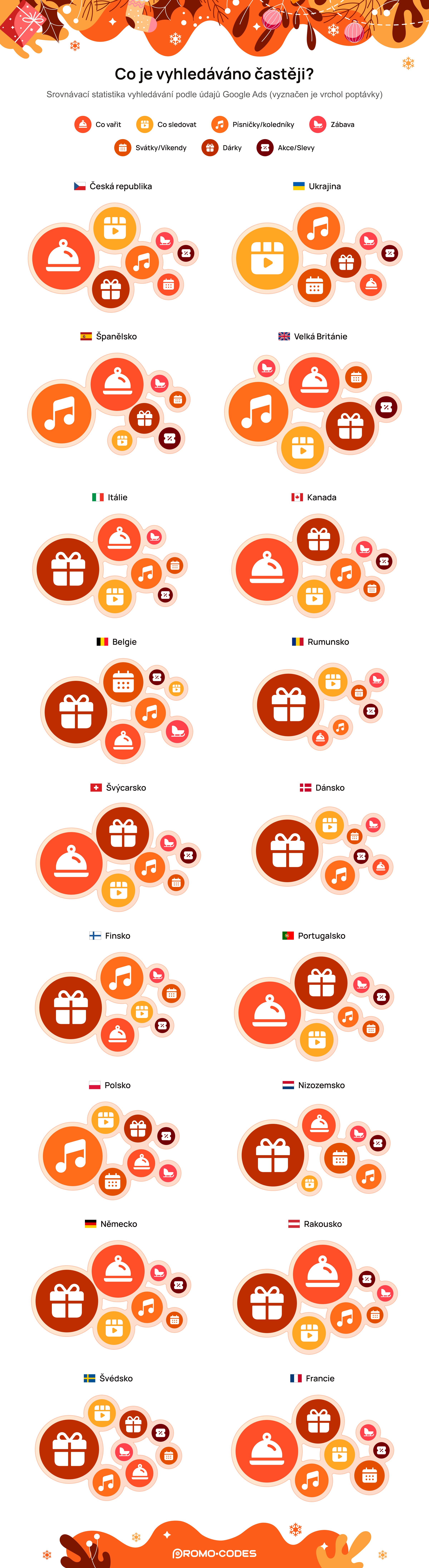 Pokud jde o vyhledávání vánočních dárků, Češi vytvořili 275 560 dotazů, což odráží osobnější přístup zaměřený na obdarování blízkých. Největší podíl těchto dotazů směřoval na dárky pro ženy, zejména matky a manželky, které tvoří 16 % všech vyhledávání souvisejících s dárky. Naproti tomu v Německu se zaměření na rodinu odráží ve 72,66 % dotazů, přičemž 24,03 % je zaměřeno na ženy.