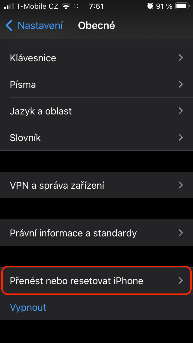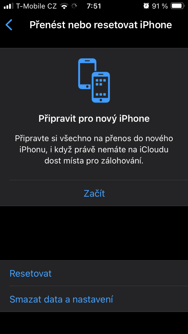 Pokud z nějakého důvodu nastane situace, kdy se Rychlý přenos přeruší nebo dojde k jakýmkoli obtížím, pak je léčbou pro nový iPhone opětovné uvedení do továrního nastavení, po němž můžete postup s klidem zopakovat. Spolu s úspěšným dokončením přenosu budete systémem dotázáni, jak chcete naložit se starým iPhonem, tedy chcete-li v něm ponechat vše ve stávající podobě nebo jej resetovat a telefon tak připravit k případnému odprodání či postoupení někomu z rodiny a podobně. Tuto možnost najdete také v Nastavení, dále Obecné, kde je předposlední položkou v seznamu Přenést nebo resetovat iPhone. Zde získáte přístup ke Smazat data a nastavení, resetování i ručnímu spuštění přenosu do nového iPhonu.