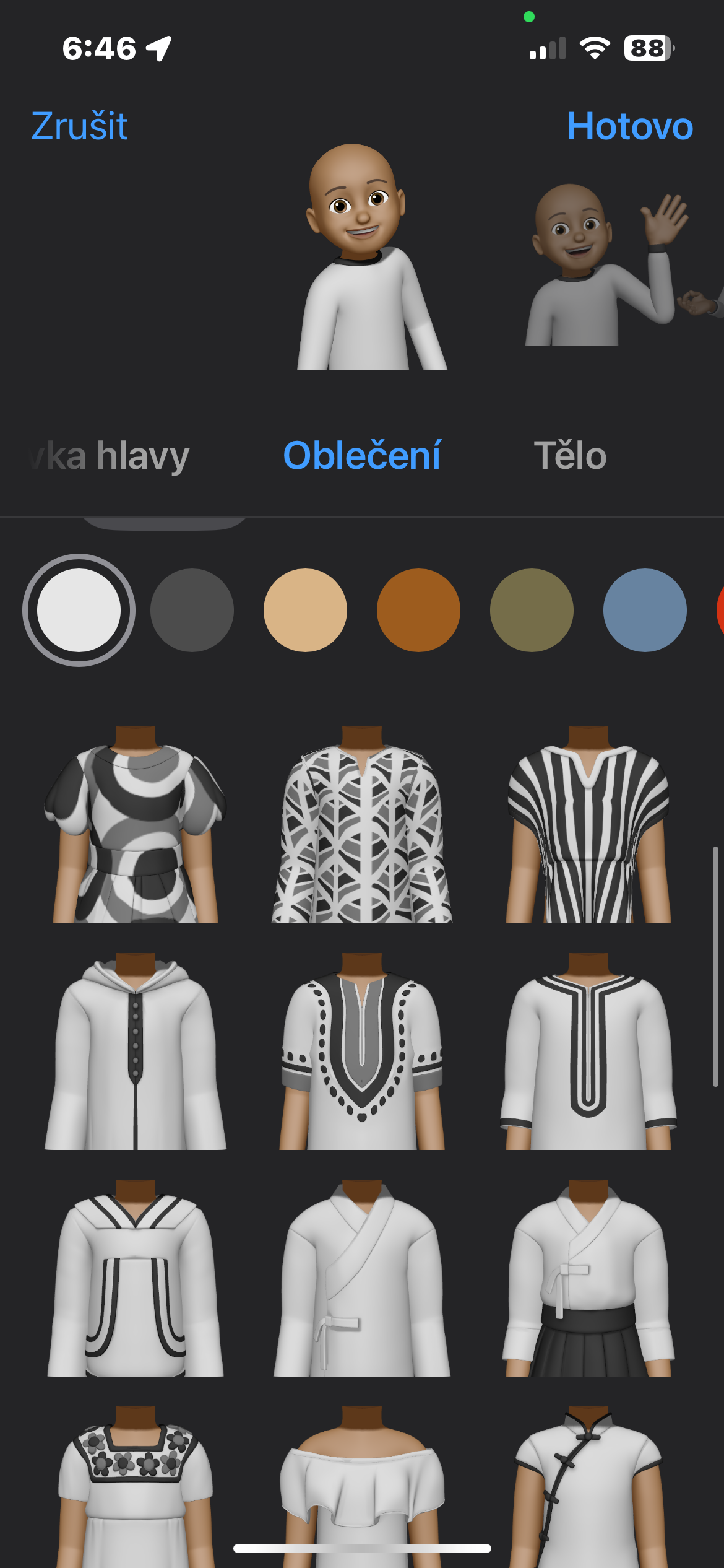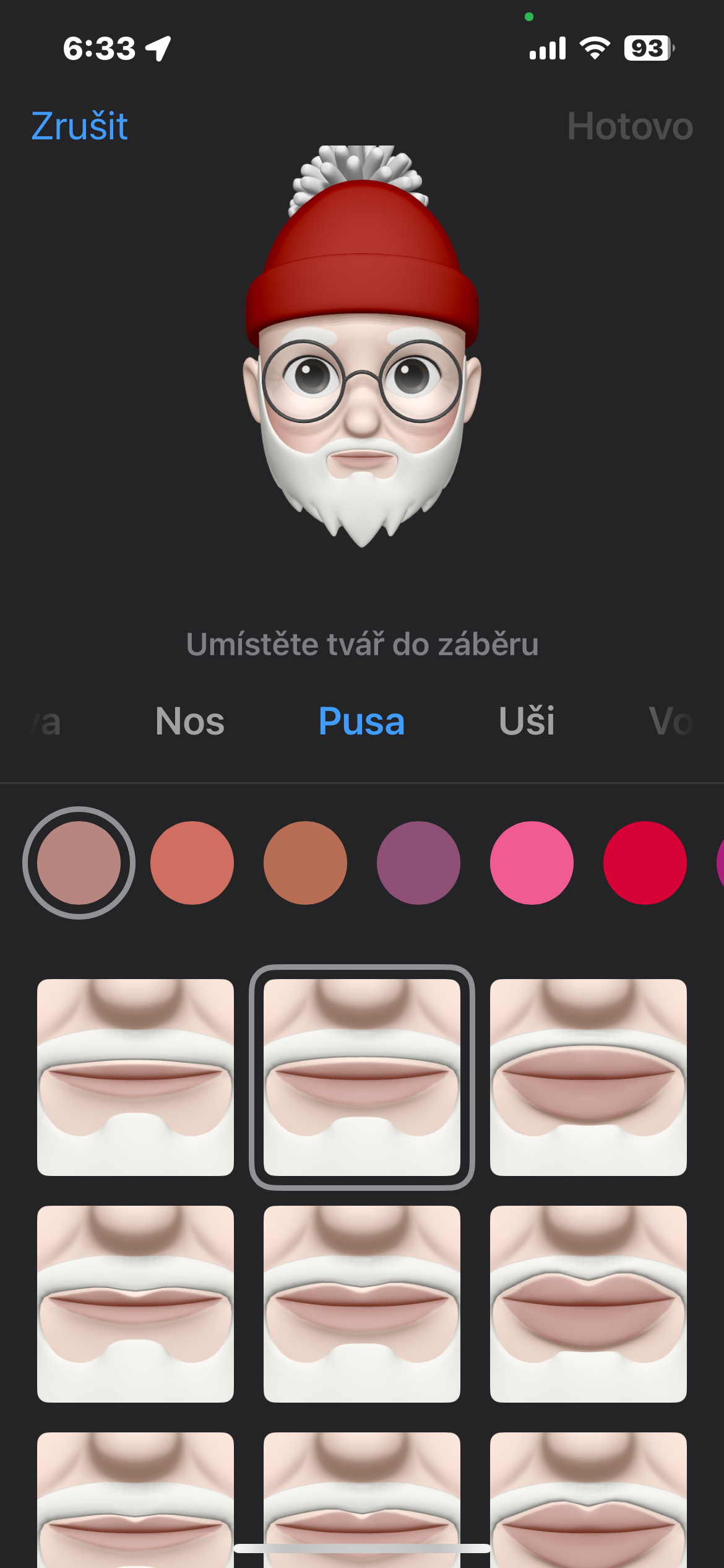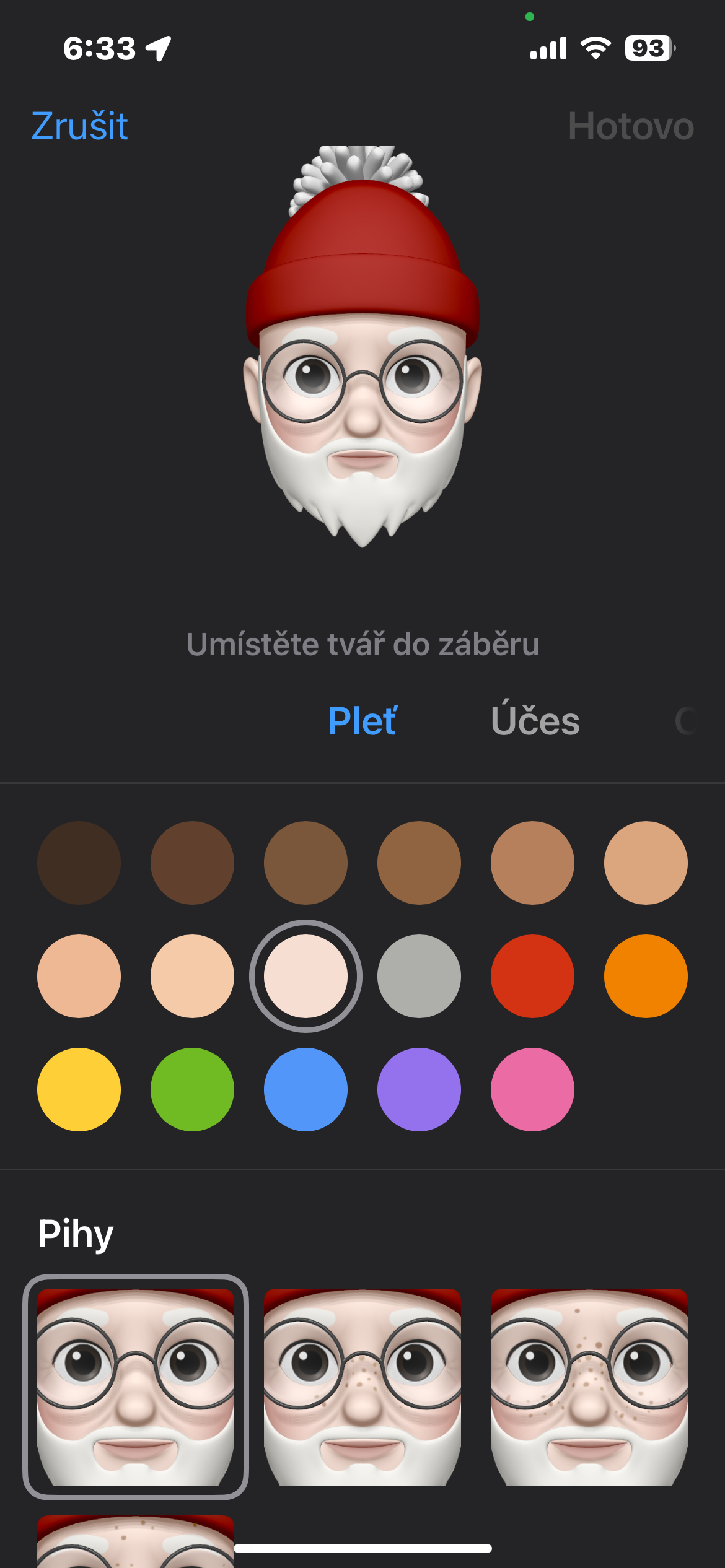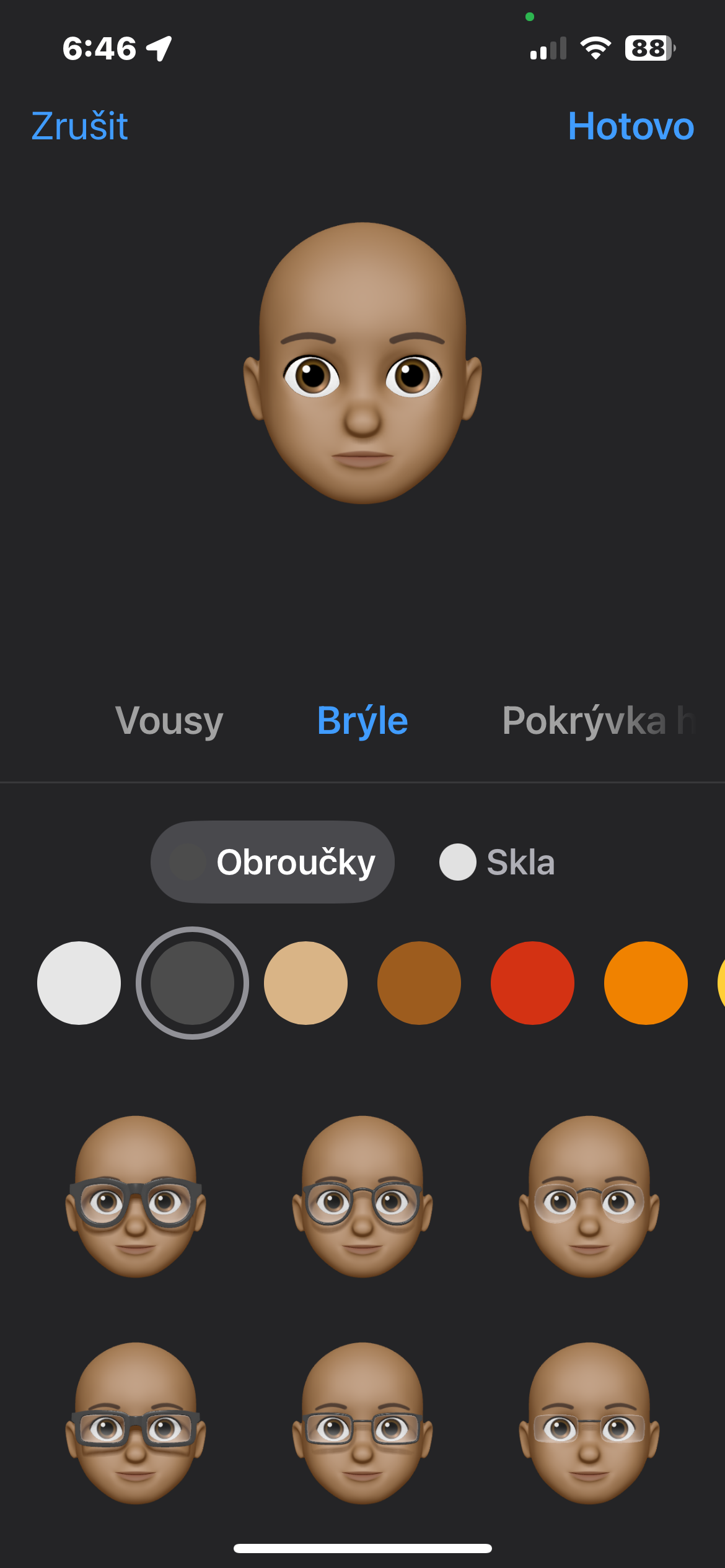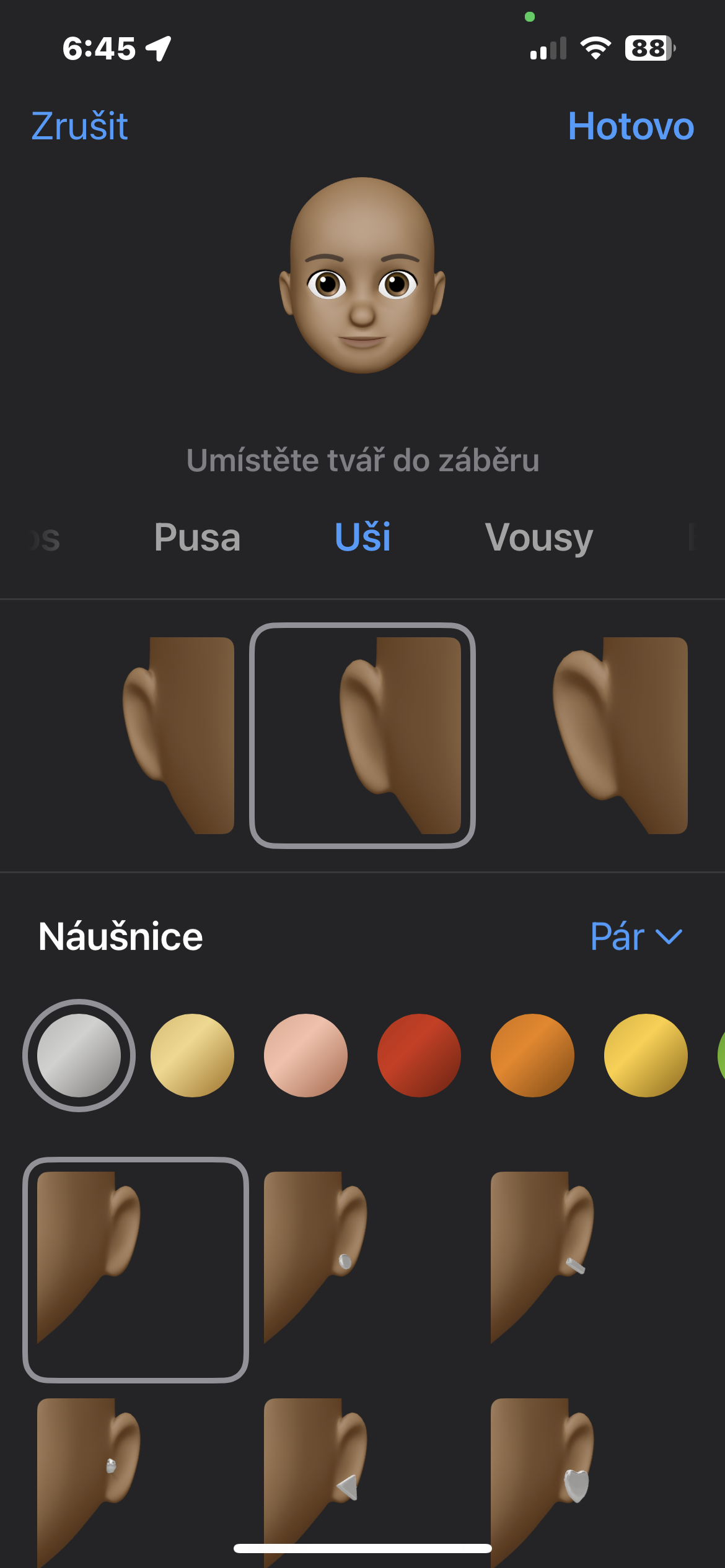 - Nyní stačí už jen procházet jednotlivé kategorie a přizpůsobit, co je potřeba. Věnujte pozornost detailům – Apple v tomto směru nabízí často pozoruhodné množství možností přizpůsobení, takže si můžete u vašeho Memoji přidat například melíry, náušnice, zvolit nejrůznější pokrývky hlavy, vybrat si brýle i oblečení.