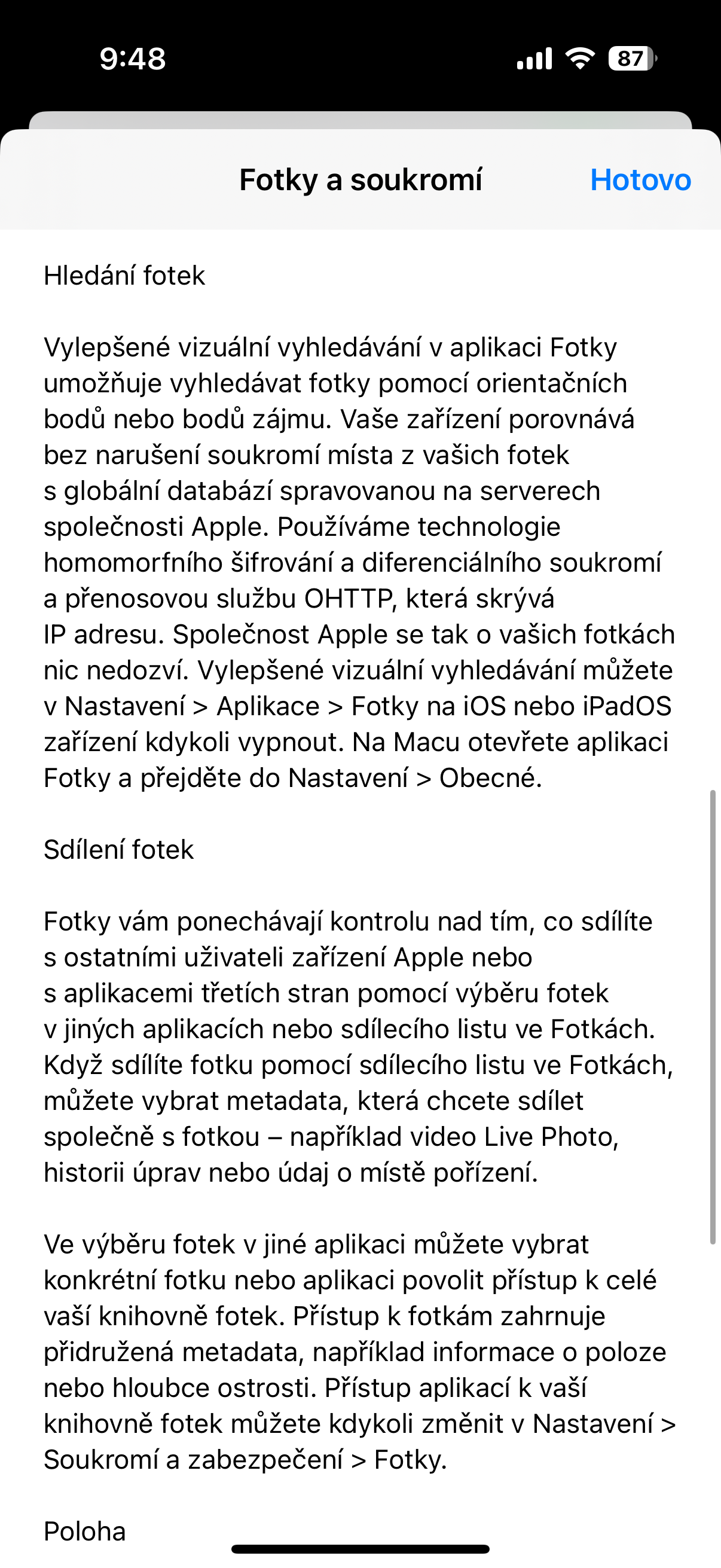 „Vylepšené vizuální vyhledávání v aplikaci Fotky umožňuje vyhledávat fotky pomocí orientačních bodů nebo bodů zájmu. Vaše zařízení porovnává bez narušení soukromí místa z vašich fotek s globální databází spravovanou na serverech společnosti Apple. Používáme technologie homomorfního šifrování a diferenciálního soukromí a přenosovou službu OHTTP, která skrývá IP adresu. Společnost Apple se tak o vašich fotkách nic nedozví. Vylepšené vizuální vyhledávání můžete v Nastavení > Aplikace > Fotky na iOS nebo iPadOS zařízení kdykoli vypnout. Na Macu otevřete aplikaci Fotky a přejděte do Nastavení > Obecné.“