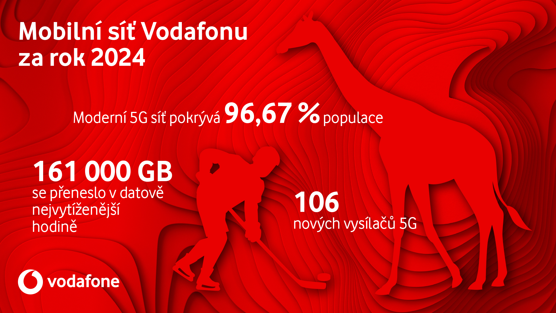 V dosahu mobilní 5G sítě od Vodafonu už je 96,67 % populace a loni se dostalo nového pokrytí třeba nemocnici v Kutné Hoře nebo zoologické zahradě ve Dvoře Králové nad Labem. Nejvíce z celého roku 2024 si lidé volali během povodní a vůbec nejvytíženější hodina z hlediska přenosu mobilních dat připadla na vítězné hokejové semifinále Čechů se Švédy během domácího šampionátu. Pokud jde o pevný internet, je Vodafone podle francouzské společnosti nPerf vítězem testu s nejlepším internetem v ČR za rok 2024.