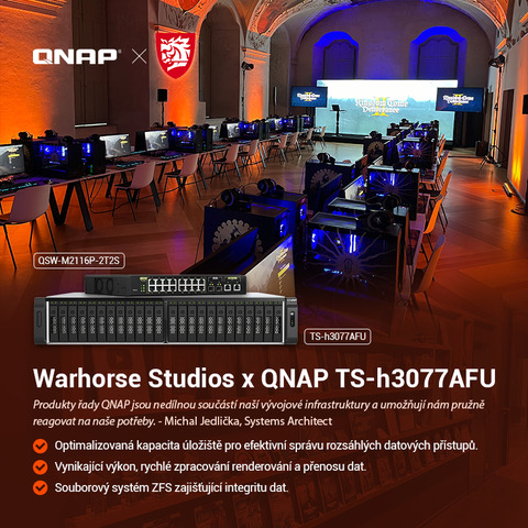 Warhorse Studios, které je součástí předního herního vydavatele PLAION, se při práci na pokračování Kingdom Come: Deliverance II potýkalo s výzvou efektivního zpracování obrovských objemů dat. Řešením se stala implementace rackového úložiště QNAP TS-h3077AFU-R7-64G, které díky all-flash technologii, multigigabitovým připojením a kompaktnímu provedení umožňuje rychlé sestavování kódu a distribuci dat uživatelům.