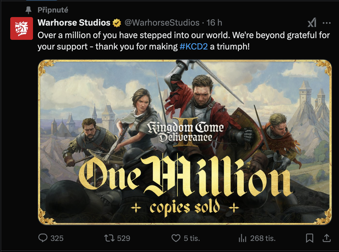 Kingdome Come Deliverance 2 od pražského studia Warhorse je hitem. Že jde pravděpodobně o jednu z nejlepších her letošního roku dokazují nejen skvělé recenze, ale i čísla. Vývojáři včera oznámili, že se prodalo už milion kopií. K tomuto oznámení došlo necelých 24 hodin po oficiálním spuštění hry.