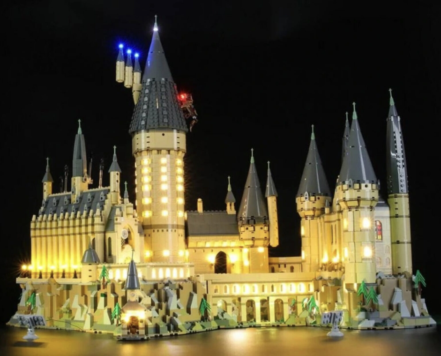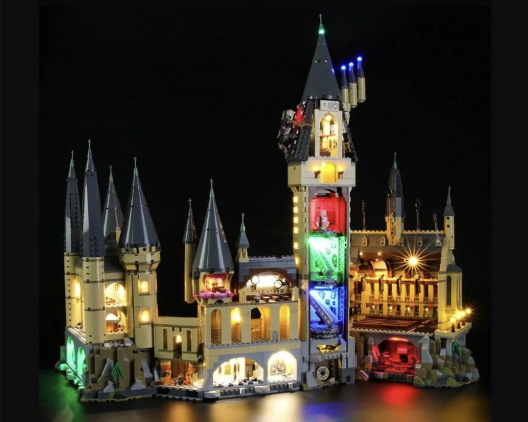 V případě Bradavického hradu je pak osvětlení řešení spoustou samostatných světelných řetězů, které směřují na společné místo, kde je ukryta svorkovnice (konkrétně pak do kopulí věží). Do té jsou následně kabely zapojeny, díky čemuž se ve výsledku z nutnosti napájet x kabelů stane nutnost dostat „šťávu“ jen do jednoho – konkrétně toho, který napájí svorkovnici. Ne vždy tomu tak ale samozřejmě je – záleží samozřejmě na konkrétním setu. Například LEGO Orient Express kamaráda a kolegy Romana má osvětlení řešeno jako jeden dlouhý kabel pro každý vagón, z čehož pramení i trochu jiný styl zapojování.