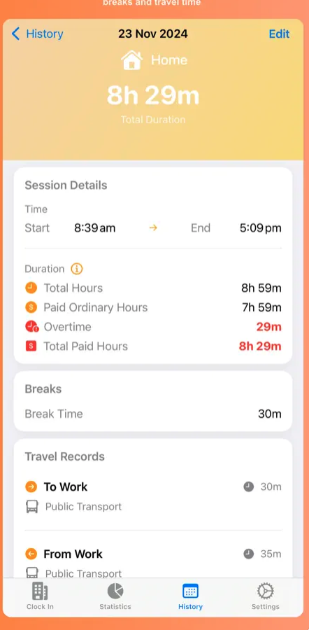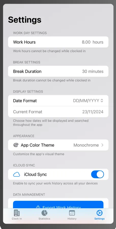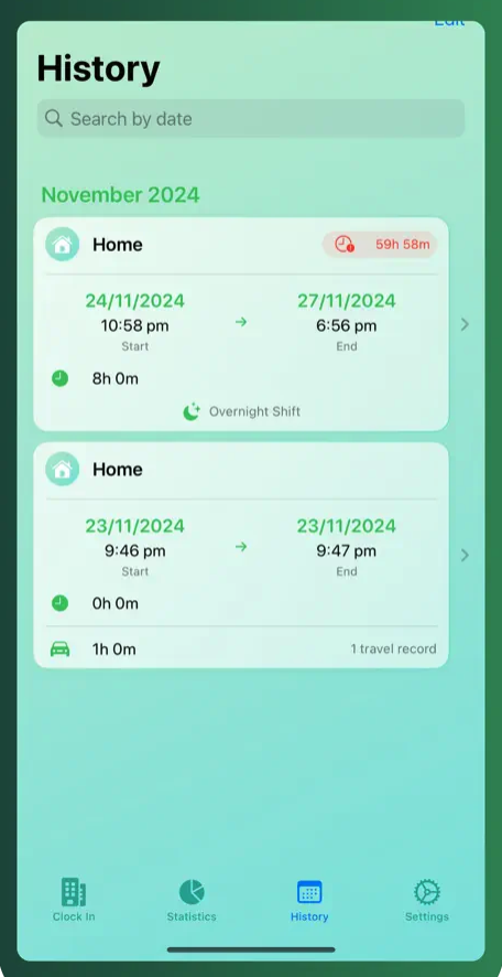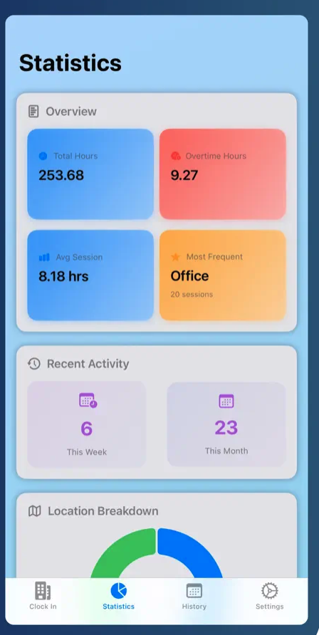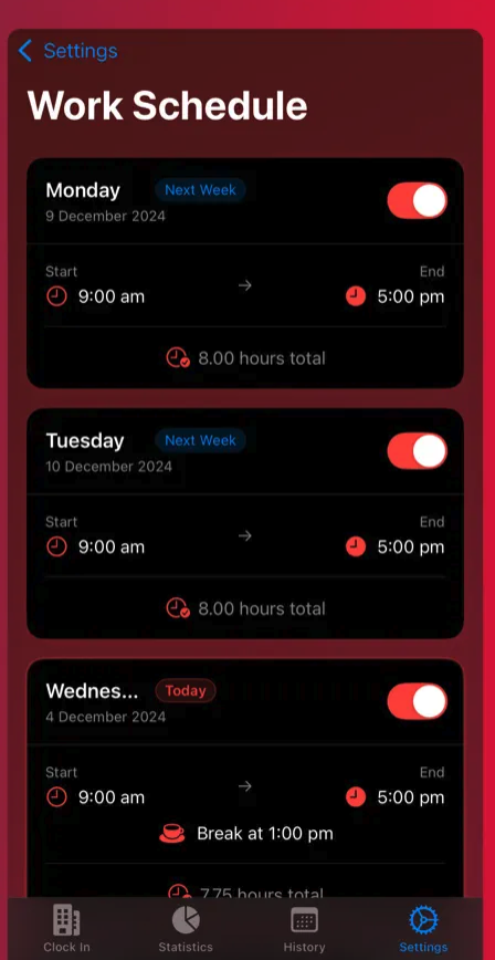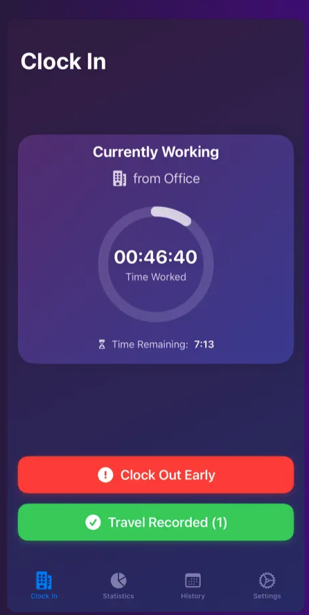 S aplikací WorkPlace Time Keeper budete mít správu svého pracovního času pevně v rukou. Umožní vám efektivně sledovat své pracovní hodiny, ať už pracujete na dálku, v kanceláři nebo v hybridním režimu. Díky inteligentnímu plánování směn, podpoře nočních směn a sledování času na cestách budete mít vždy přehled o své docházce. Můžete snadno zahájit a ukončit pracovní dobu z domova, kanceláře či jiného vlastního místa, automatizovat přestávky s chytrými připomínkami nebo analyzovat své pracovní vzorce. Aplikace nabízí detailní statistiky, včetně sledování přesčasů, analýzy docházky, přehledu o přestávkách či vyhodnocení času stráveného na cestách.