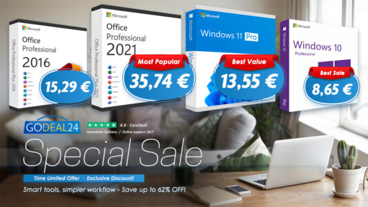 Na Godeal24 můžete ušetřit spoustu času a peněz díky zvýhodněným licencím Microsoft, ověřenému softwaru pro zabezpečení IT a dalším počítačovým nástrojům. Získejte operační systém Windows a kancelářský balík MS Office za bezkonkurenční cenu. Zažijte bezproblémové nakupování s digitálním doručením Godeal24, které vám zašle software přímo na váš e-mail během několika sekund po nákupu. Navíc díky 98% hodnocení TrustPilot Excellent a odborné technické podpoře 24/7 si můžete být jisti kvalitou kupovaného produktu.