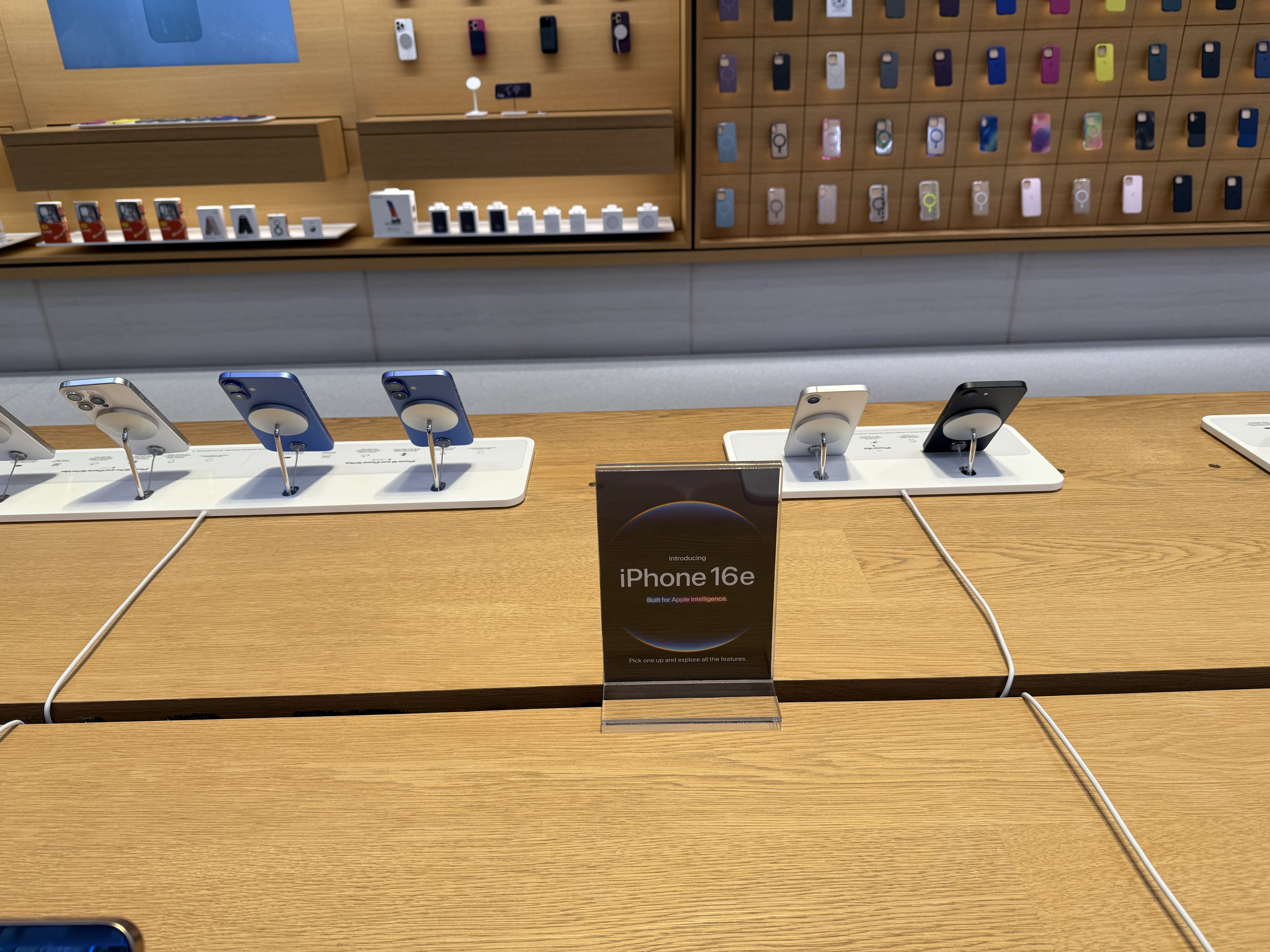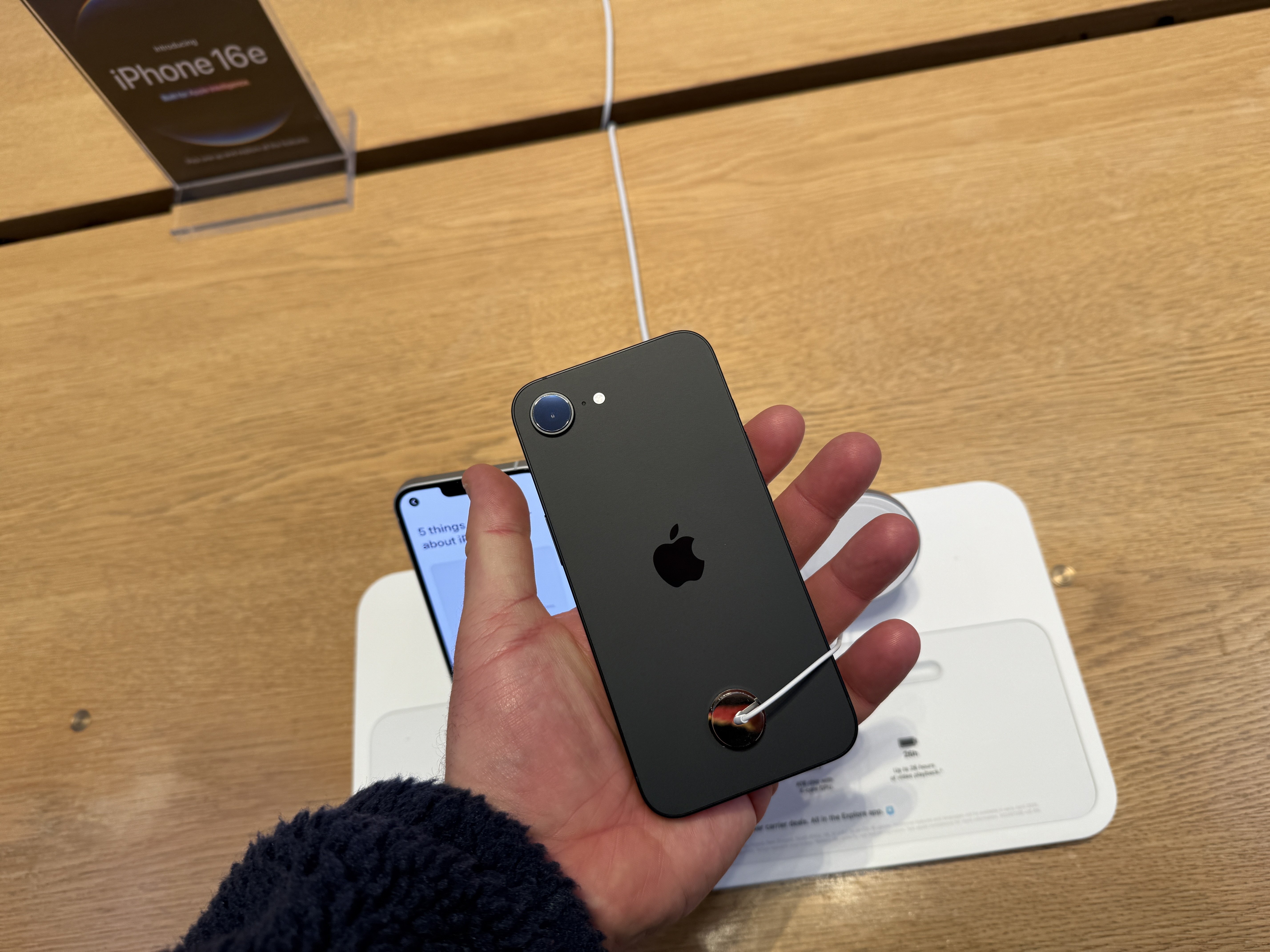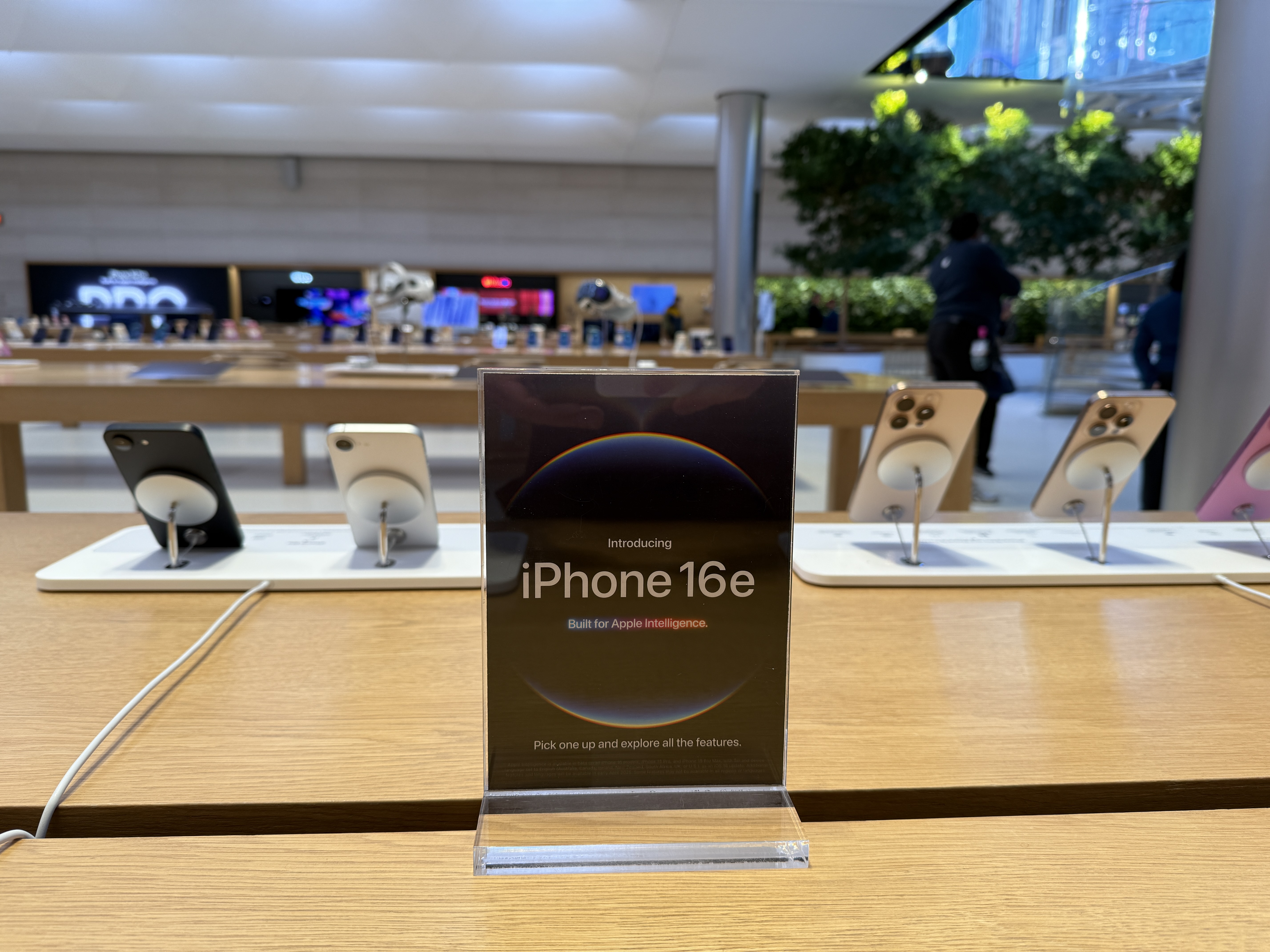 Telefon jako takový je pak skutečně vystaven ve stojáncích, o kterých jsme psali včera. Ty jsou do značné míry imitací klasických MagSafe stojánků, avšak vzhledem k tomu, že iPhony 16e nedisponují MagSafe konektorem, slouží „rameno“ jen coby opěrka a nikoliv vyloženě jako držák, který telefon drží ve vzduchu. Spodní hrana iPhonu je pak zaklesnuta v prohlubni, která zajišťuje, že z opěrky nespadne. Celkově ale nový iPhone v žádném případě hvězdou Apple Storu není, čemuž odpovídá vše, co se kolem ní (ne)točí. Cestu do tohoto ikonického Apple Storu si dnes dokonce nenašel ani Tim Cook, který přitom v minulosti právě v tomto obchodě Applu prodeje důležitých produktů „startoval“.