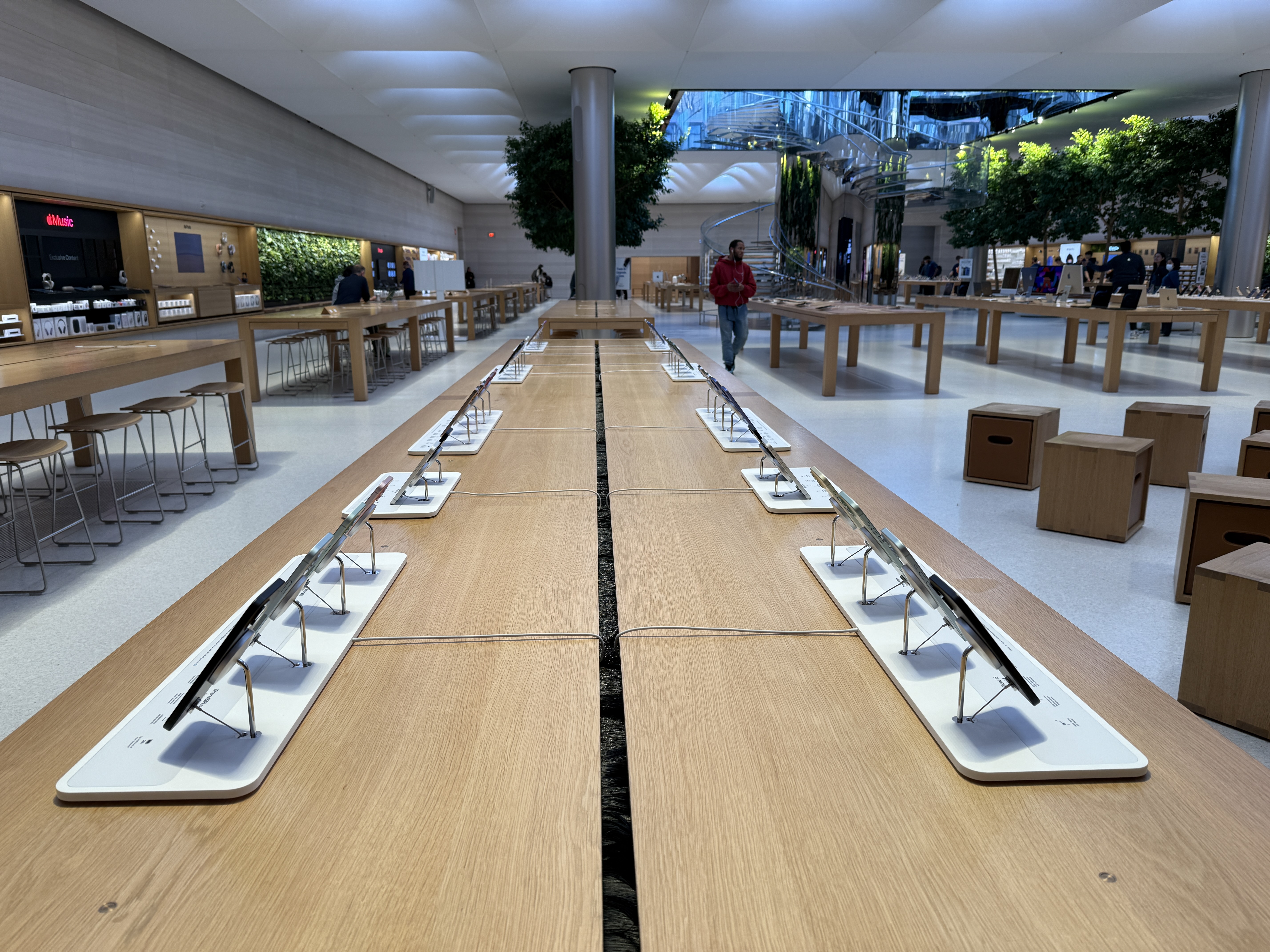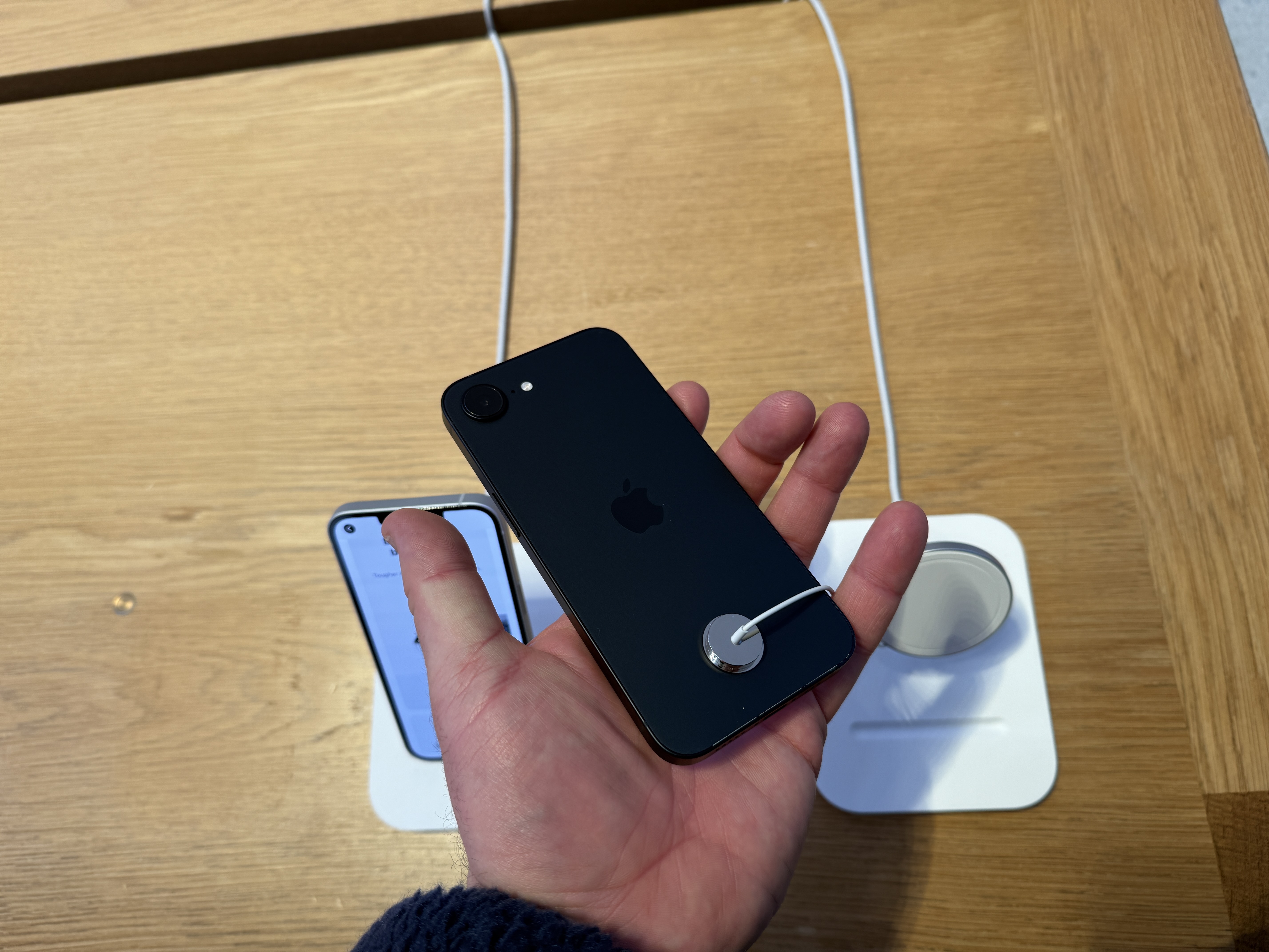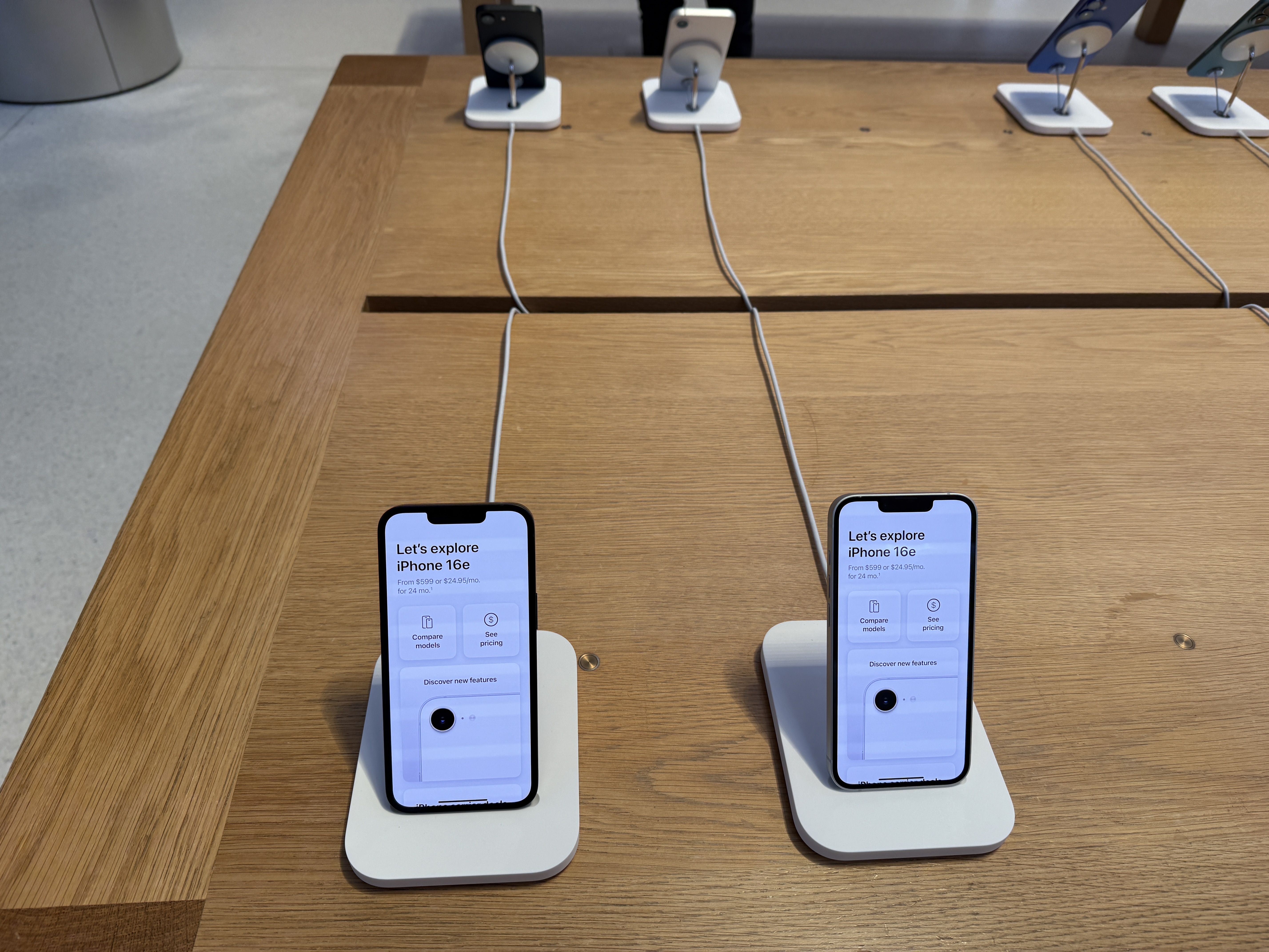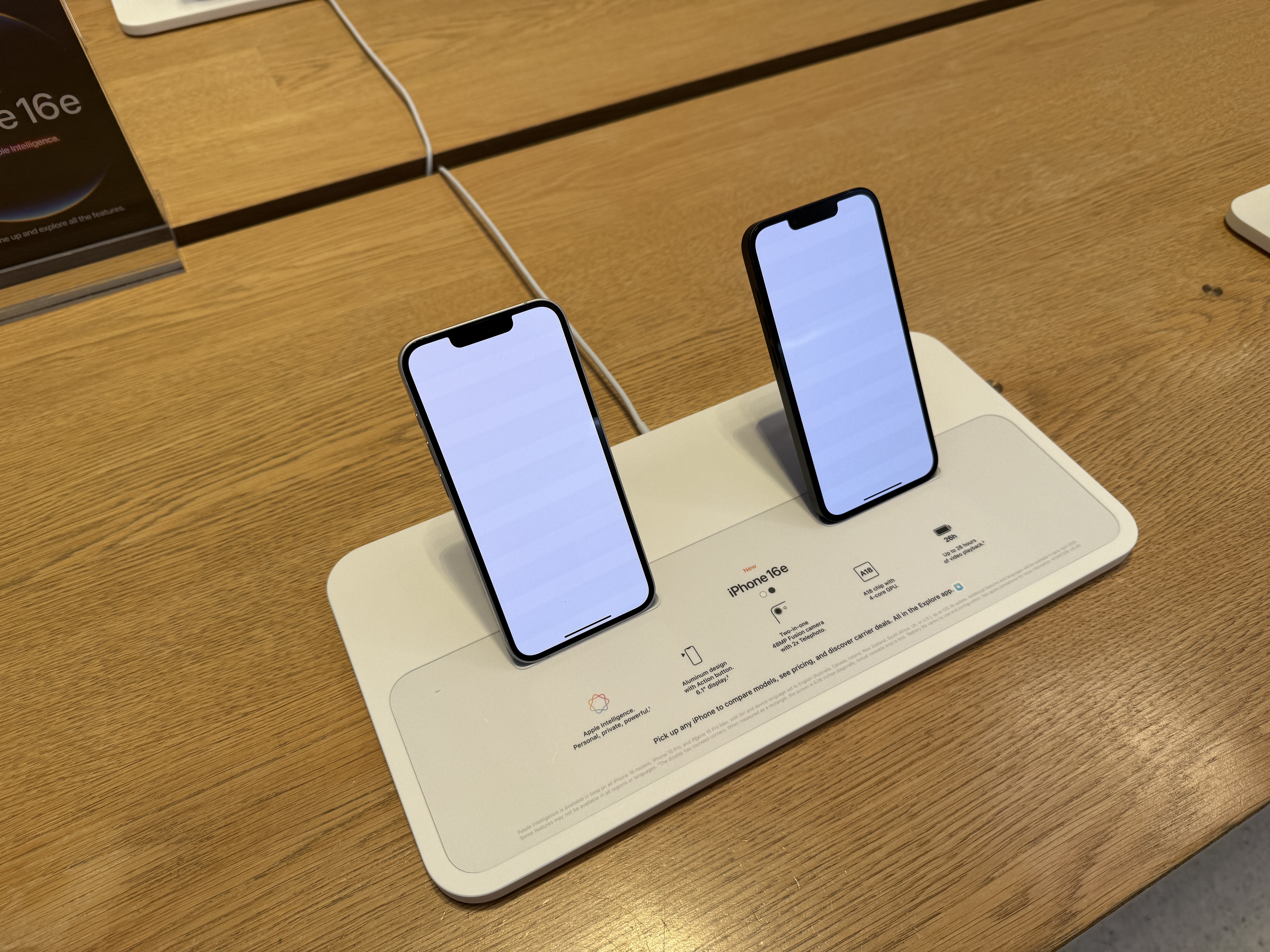 Telefon jako takový je pak skutečně vystaven ve stojáncích, o kterých jsme psali včera. Ty jsou do značné míry imitací klasických MagSafe stojánků, avšak vzhledem k tomu, že iPhony 16e nedisponují MagSafe konektorem, slouží „rameno“ jen coby opěrka a nikoliv vyloženě jako držák, který telefon drží ve vzduchu. Spodní hrana iPhonu je pak zaklesnuta v prohlubni, která zajišťuje, že z opěrky nespadne. Celkově ale nový iPhone v žádném případě hvězdou Apple Storu není, čemuž odpovídá vše, co se kolem ní (ne)točí. Cestu do tohoto ikonického Apple Storu si dnes dokonce nenašel ani Tim Cook, který přitom v minulosti právě v tomto obchodě Applu prodeje důležitých produktů „startoval“.