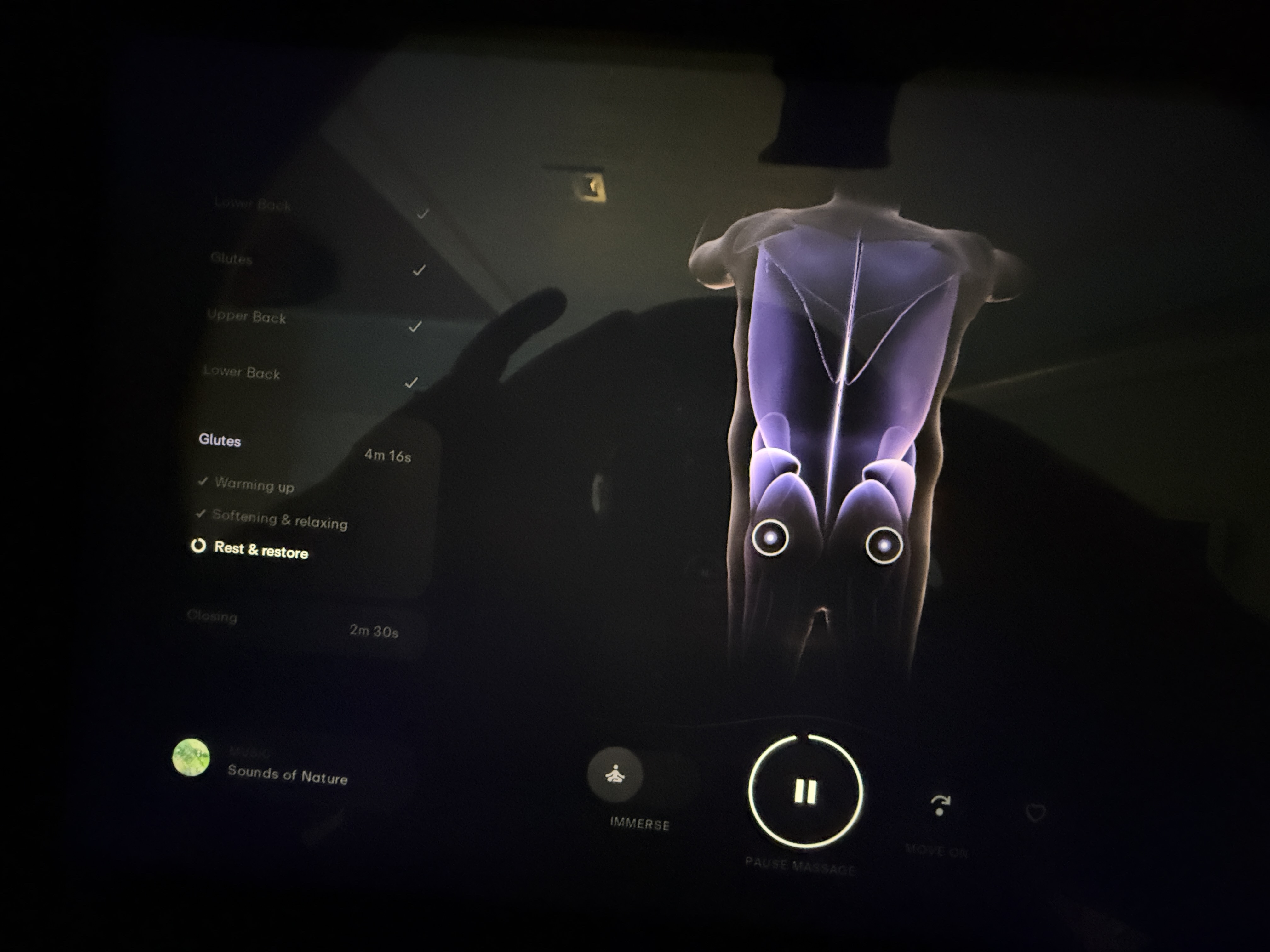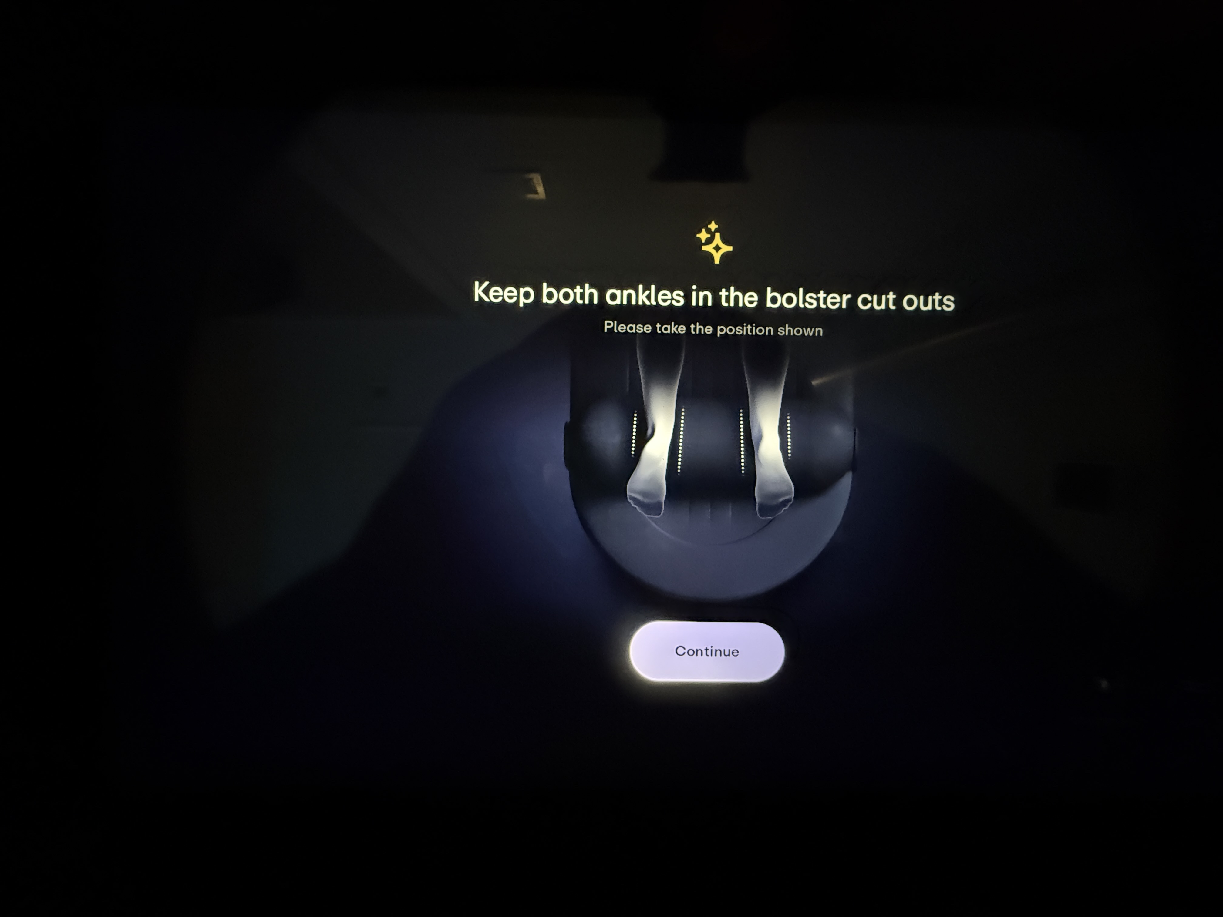 Jakmile dáte holeně do měkkých opěrek, pomocí displeje si nastavíte kam se mají opěrky posunout aby bylo vaše tělo narovnané. Už v ten moment zjistíte, že tneto storj není hračka. Rychlost s jakou se po dotyku displeje pohybuje podložka jen euvěřitelná. Nic tak responzivního jsem snad nikdy nezažil. Jakmile máte vše nastaveno, vyzve vás displej abyste se nehýbali a začne scanovat celé vaše tělo. Po zhruba 20 vteřinách se objevíte na displeji tak, jak vás vidí stroj a můžete se pustiti do masáže. Během cleé masáže si můžete volit intenzitu s tím, že ta největší intenzita je tak silná, že nevěřím, že ji někdo dokáže vydržet celých 60 minut. Pokud tedy máte rádi opravdu silnou masáž, tak zde máte jistotu, že po celých 60 minut bude masáž intenzivnější, než jak to dokáže jakýkoli masér na světě. Pokud máte rádi naopak jemnou masáž, můžete intenzitu kdykoli měnit.