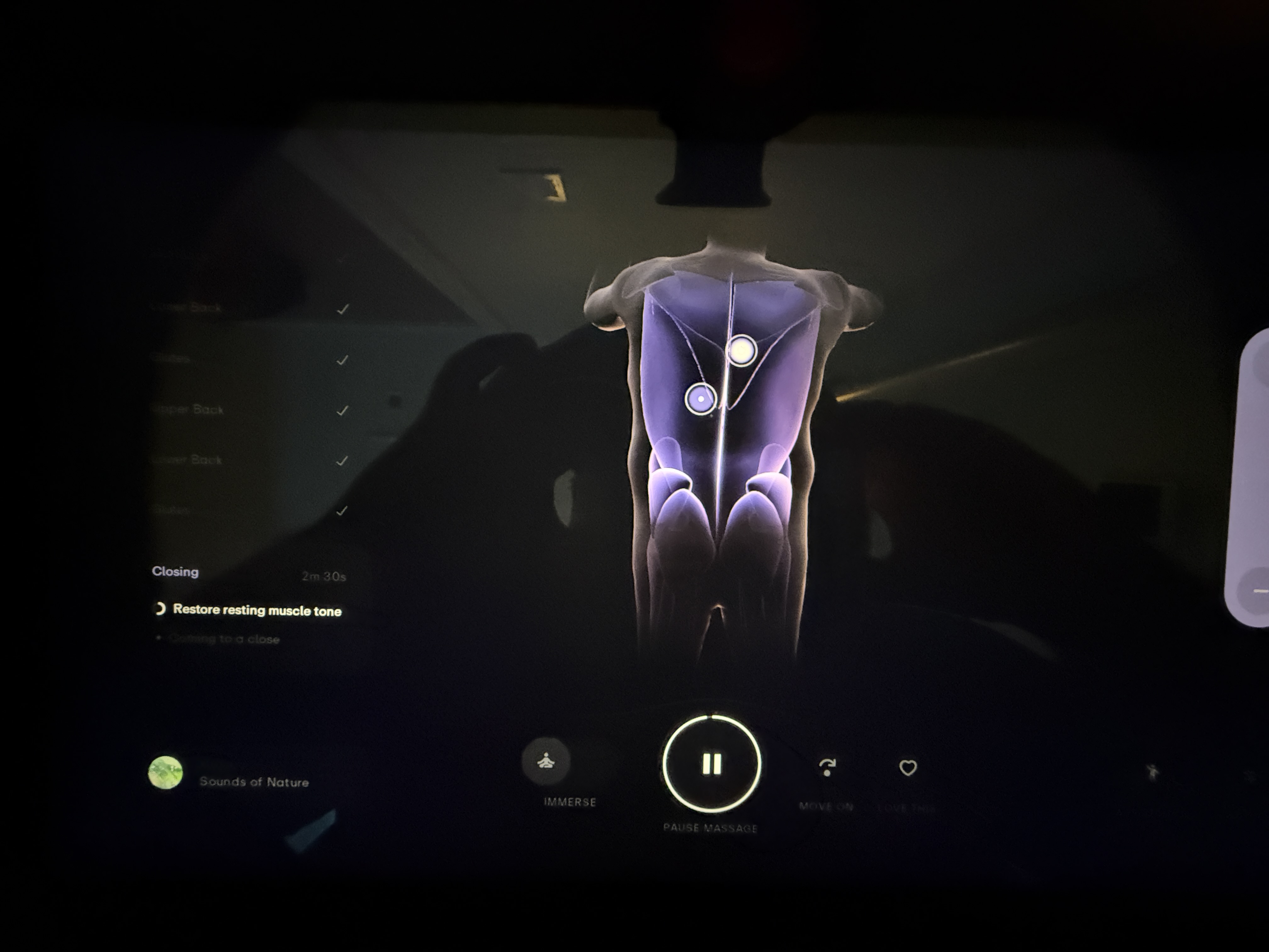 Jakmile dáte holeně do měkkých opěrek, pomocí displeje si nastavíte kam se mají opěrky posunout aby bylo vaše tělo narovnané. Už v ten moment zjistíte, že tneto storj není hračka. Rychlost s jakou se po dotyku displeje pohybuje podložka jen euvěřitelná. Nic tak responzivního jsem snad nikdy nezažil. Jakmile máte vše nastaveno, vyzve vás displej abyste se nehýbali a začne scanovat celé vaše tělo. Po zhruba 20 vteřinách se objevíte na displeji tak, jak vás vidí stroj a můžete se pustiti do masáže.  Během cleé masáže si můžete volit intenzitu s tím, že ta největší intenzita je tak silná, že nevěřím, že ji někdo dokáže vydržet celých 60 minut. Pokud tedy máte rádi opravdu silnou masáž, tak zde máte jistotu, že po celých 60 minut bude masáž intenzivnější, než jak to dokáže jakýkoli masér na světě. Pokud máte rádi naopak jemnou masáž, můžete intenzitu kdykoli měnit.
