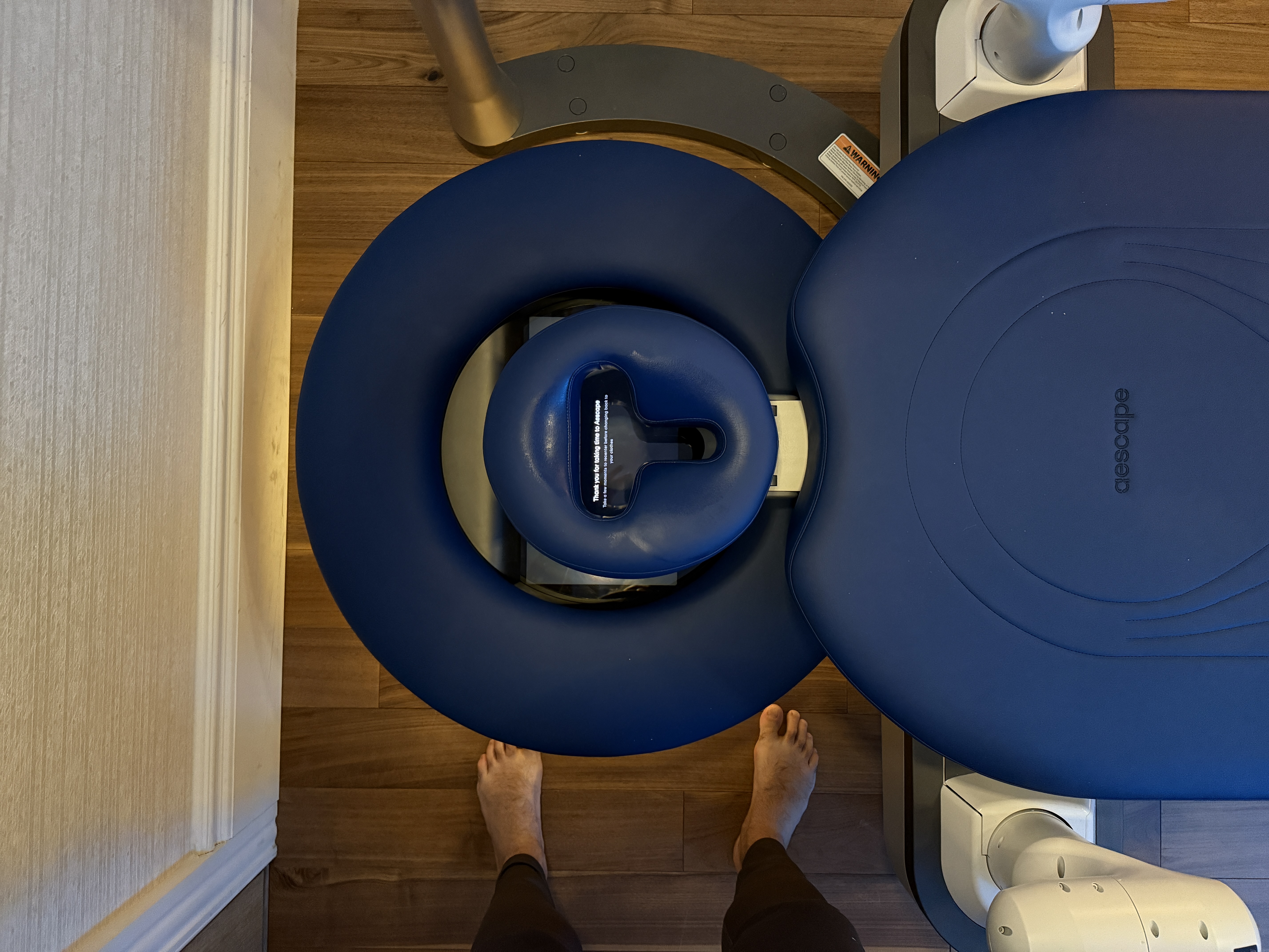 Jakmile dorazíte na repci, nejprve vás uvedou do oddychové mísnosti, kde máte k dispozici občerstvení, klid a zejména pak jedinečný výhled na katedrálu Svatého Patrika. Místnost ve které je samotný masážní stroj se po každém klinetovi dezinfikuje a stoj je samozřejmě před každou masáží vyčištěn. Navíc vás nemasíruje nahého, ale v oblečení, což je clekem netradiční a musím říct, že zajímavé. Při bookování masáže si zvolíte vleikost oblečení a ta je přímo v místnosti nachystána. Jedná se o vlemi příjemné uplé tričko a kalhoty, vše samozřejmě s dlouhým rukávem. Přirovnal bych to k základním vrstvám od Xbionic nebo Under Armor. Jakmile se převlečete, stačí si lehnout na masážní stůl. Pod polštářkem na hlavu je displej, který vás vítá vašim jménem a pokud chodíte na masáže pravidelně, pamatuje si vaše preference.Nejprve začnete tím, že si nastavíte pozici nohou a rukou.