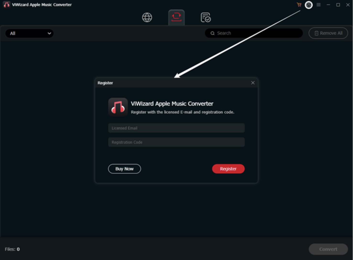 Otevřete software ViWizard a automaticky se otevře integrovaný webový přehrávač Apple Music. Poprvé klikněte v pravém horním rohu na lištu s nabídkami > Zaregistrovat se a zaregistrujte se ve službě ViWizard. Poté v pravém horním rohu v sekci Sign In (Přihlásit se) zadejte své přihlašovací údaje do služby Apple Music a přihlaste se.