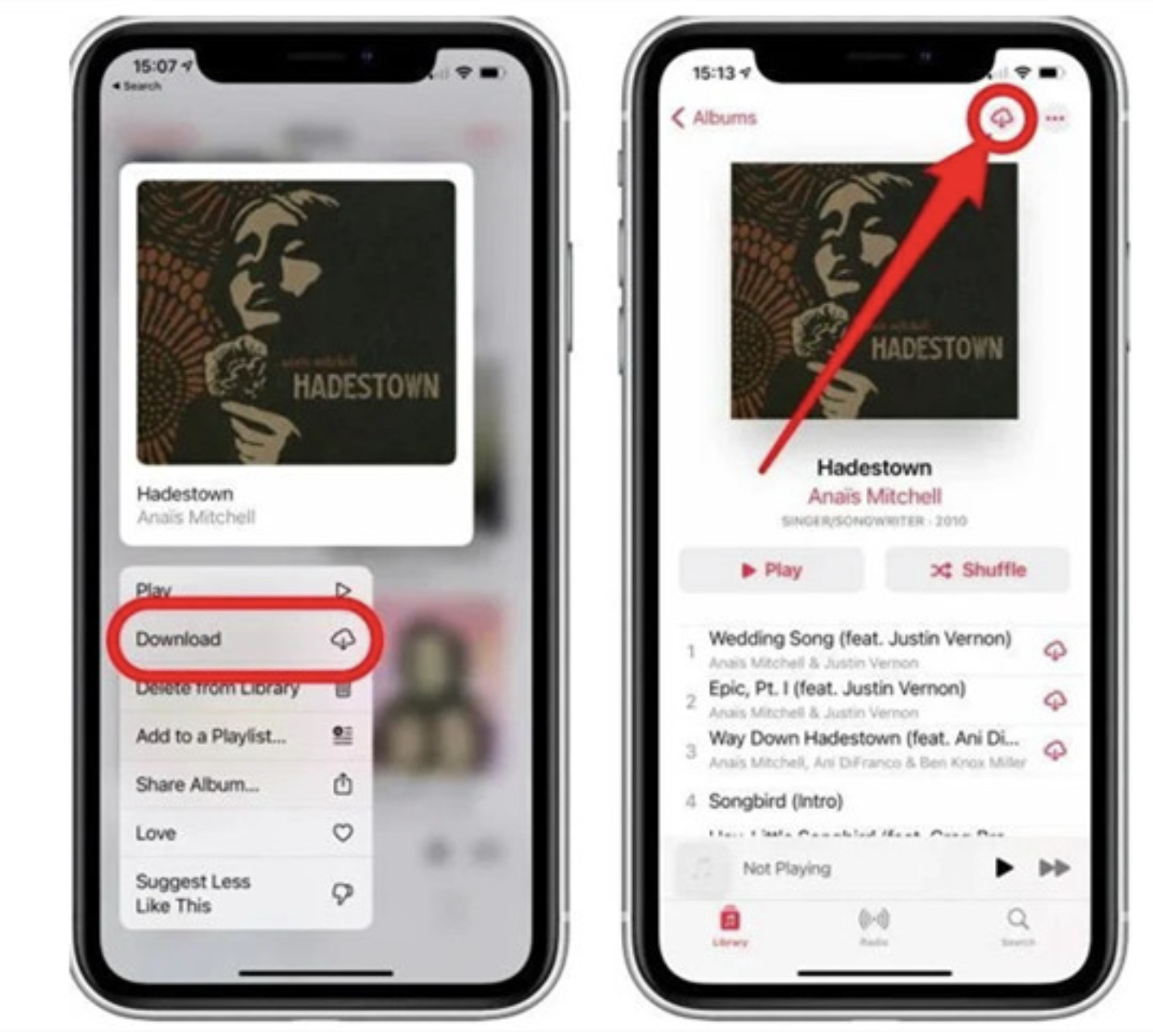 5. V iPhonu nebo iPadu můžete klepnout na „Stáhnout“ také pro celá alba nebo seznamy skladeb.