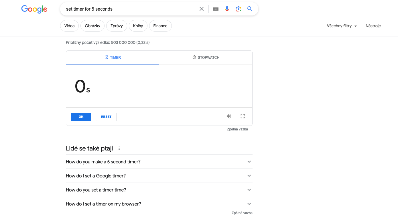 Google nabízí také integrované stopky a minutku. Ať už chcete vědět, jak dlouho trvá uvařit vaše oblíbené jídlo, nebo si chcete nastavit připomenutí na důležitou událost, Google vám s tím rád pomůže. Stačí do vyhledávače zadat „set timer for…“ a doplnit, na jak dlouho chcete časovač nastavit. Ihned se vám v horní části stránky zobrazí odpočítávání. A pokud potřebujete měřit čas, který něco trvá, jednoduše klikněte na záložku „Stopwatch“ a můžete začít.