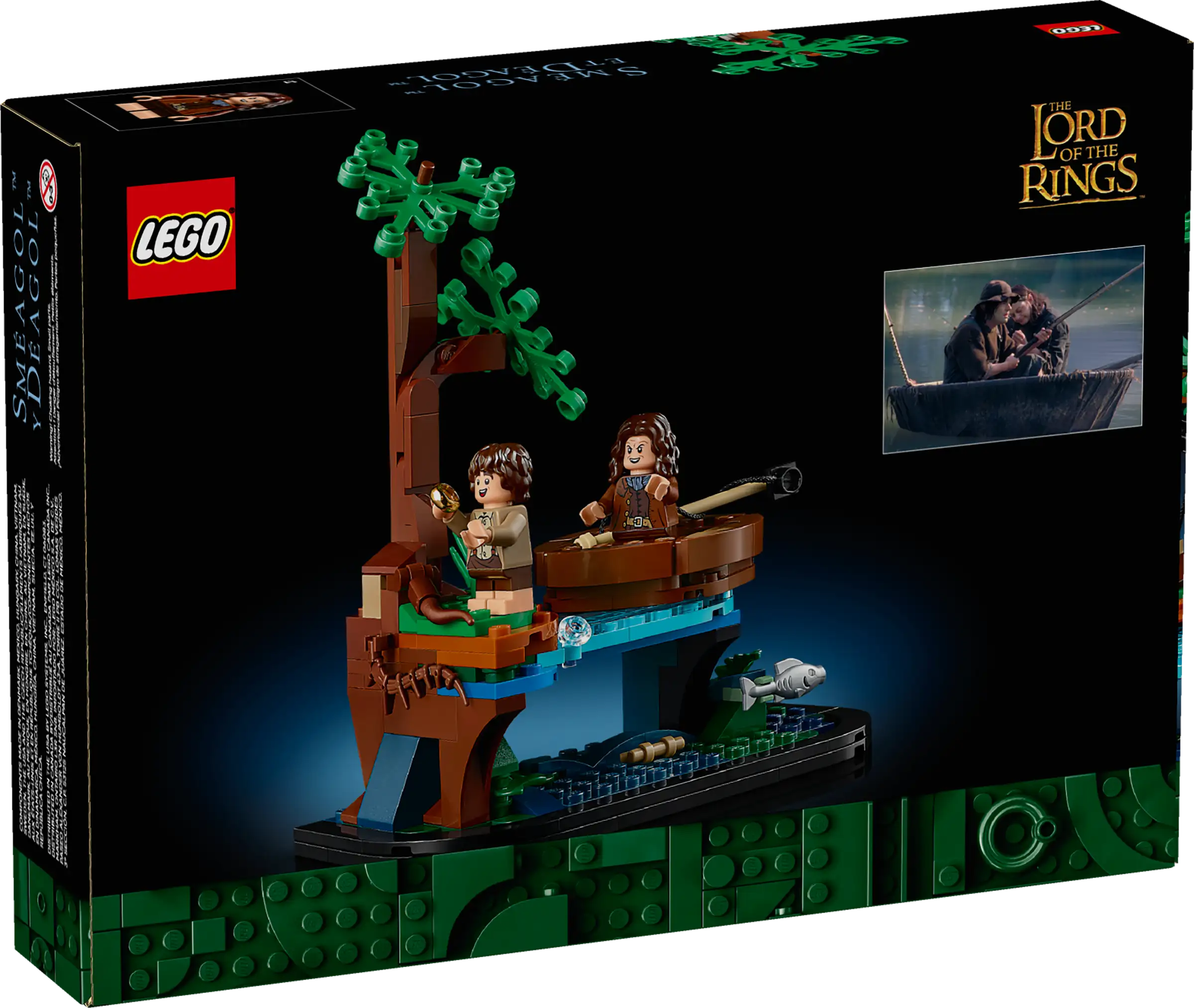 Celá scéna je koncipována jako výstavní model s bohatými detaily. Najdete zde sestavitelnou říční scenérii s rostlinami a stromem, ale i otočnou loďku, která přidává na interaktivitě. Dvě minifigurky – Sméagol a Déagol – jsou vybaveny filmovými doplňky, jako je rybářské náčiní nebo ikonická zlatá replika Prstenu moci. Právě díky těmto prvkům je možné celou scénu znovu oživit a přehrát si osudový moment přesně tak, jak jej známe z filmů.