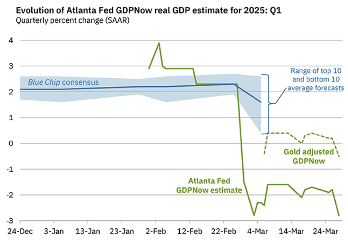 Také Atlanta Fed (jedna z poboček americké centrální banky) zveřejnil odhad, že americké HDP v prvním čtvrtletí poklesne o 2,8 %, což potvrzuje zhoršující se výhled pro americkou ekonomiku. Na oficiální údaje si ještě počkáme, ale již samotný odhad indikuje výrazné ochlazení.