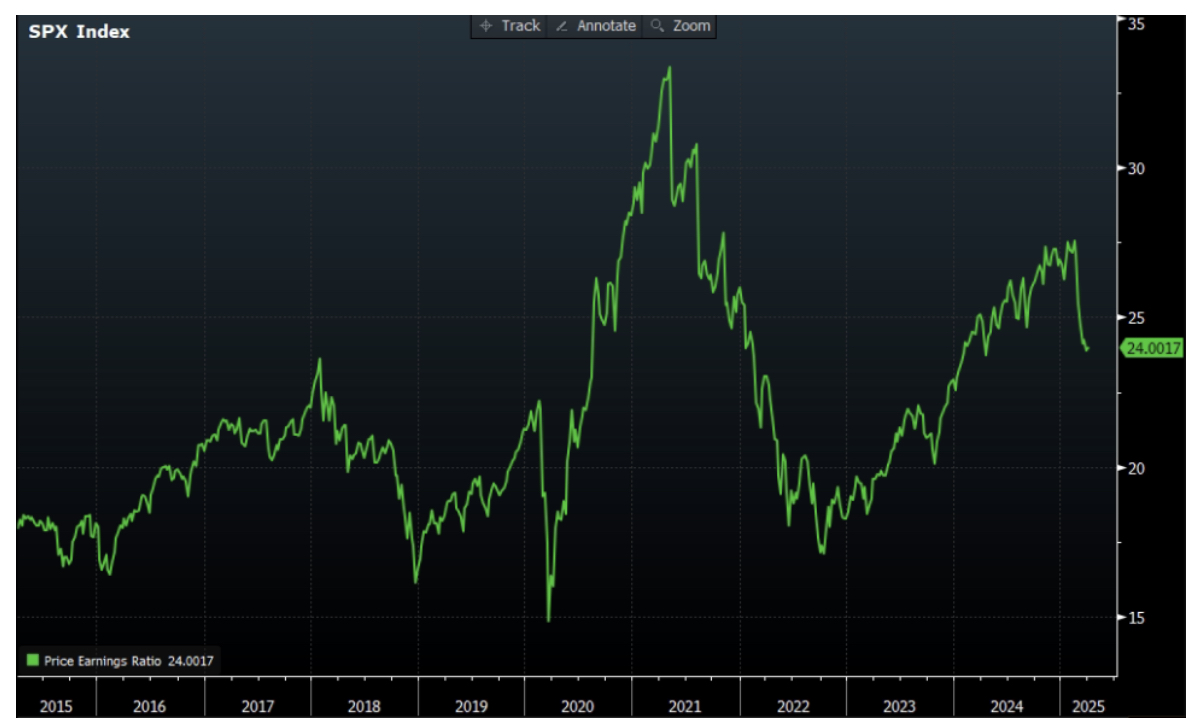 Příkladem je index S&P 500, který se i po nedávné 10% korekci obchoduje za 24násobek zisků. Takto vysoké valuace zvyšují zranitelnost trhu vůči jakémukoli negativnímu překvapení – a těch v poslední době nebylo málo.