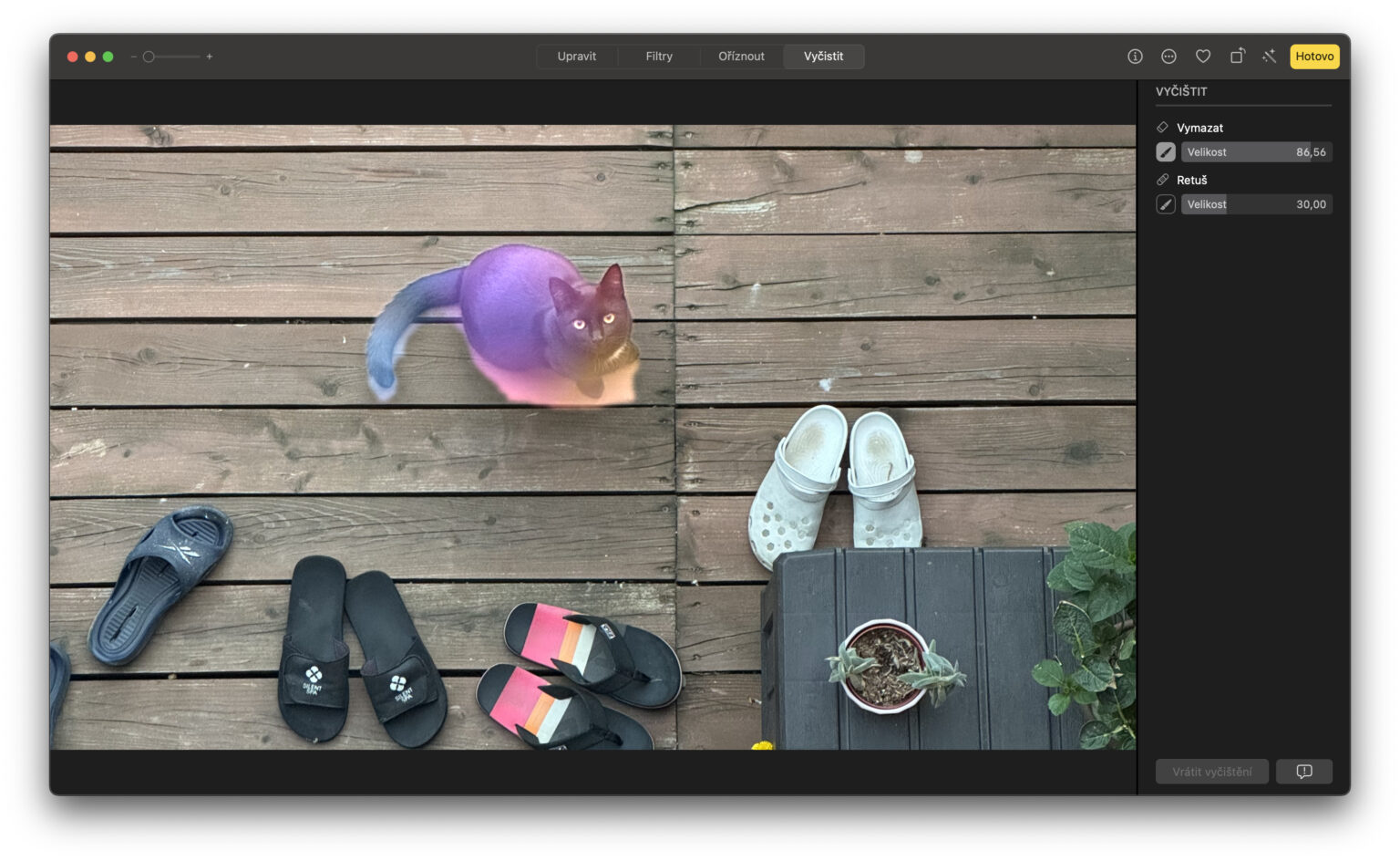 Styl mazání objektů u Vyčistit z Apple Intelligence se od toho, který používá Photoshop, liší primárně v tom, že zatímco Apple Intelligence se snaží za každou cenu smazat objekt ze snímku a to leckdy i na úkor kvality, Photoshop nikoliv. Pokud si totiž ten „neví rady“, namísto smazání objektu na jeho místo doplní objekt, který by se tam dle jeho analýzy hodil. Kvůli tomu tak třeba nesmazal kočku z prken terasy, ale na její místo doplnil hrnek s kávou. To sice ve výsledku úplně nechcete, na druhou stranu tam ale hrnek s kávou vypadá lépe než jakýsi tmavý flek, který vyprodukovala Apple Intelligence.