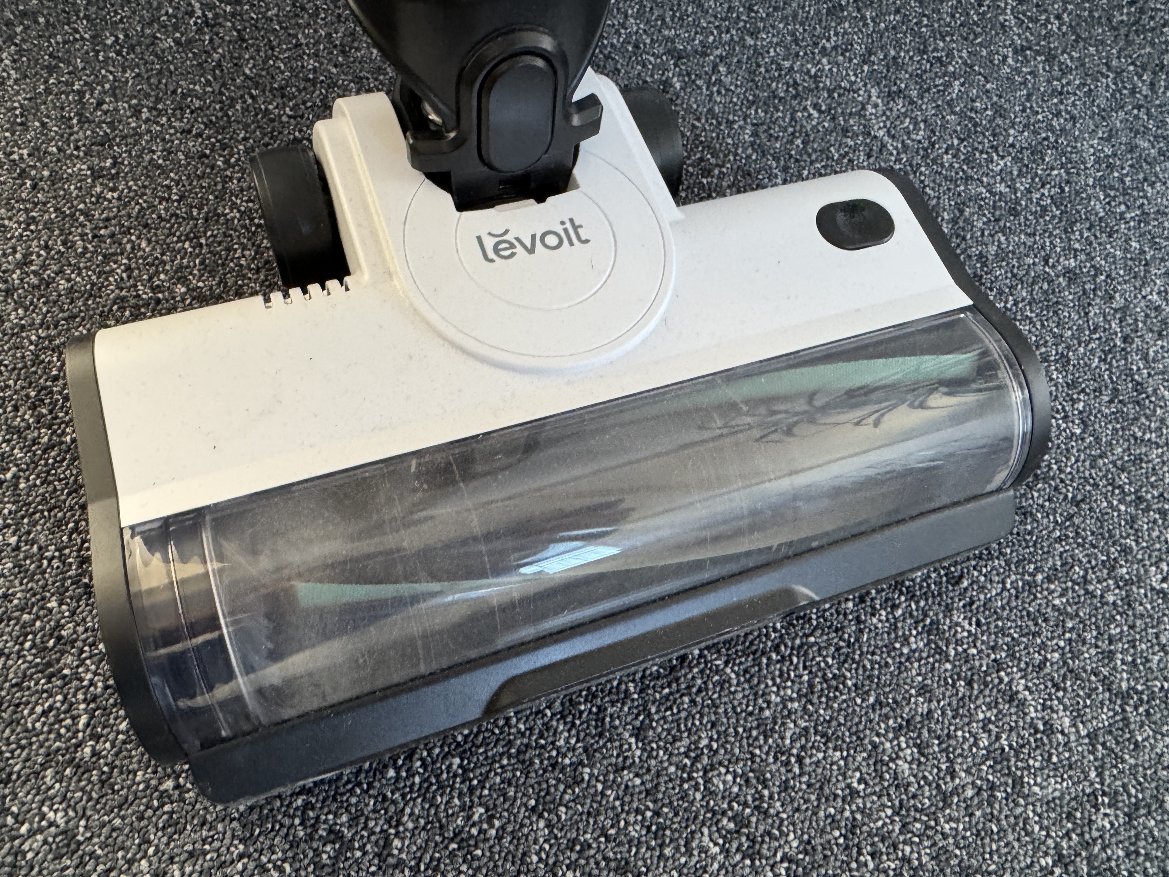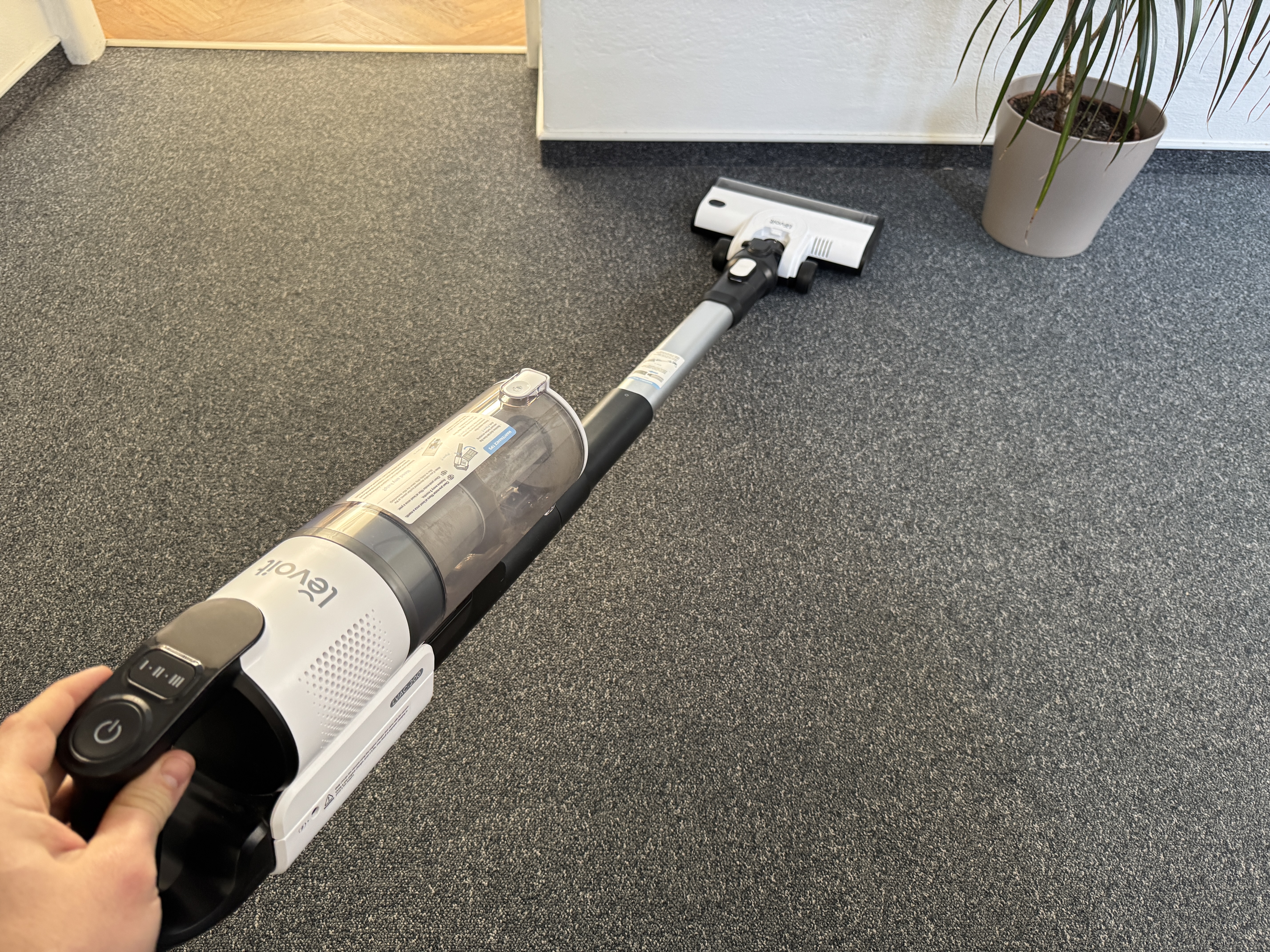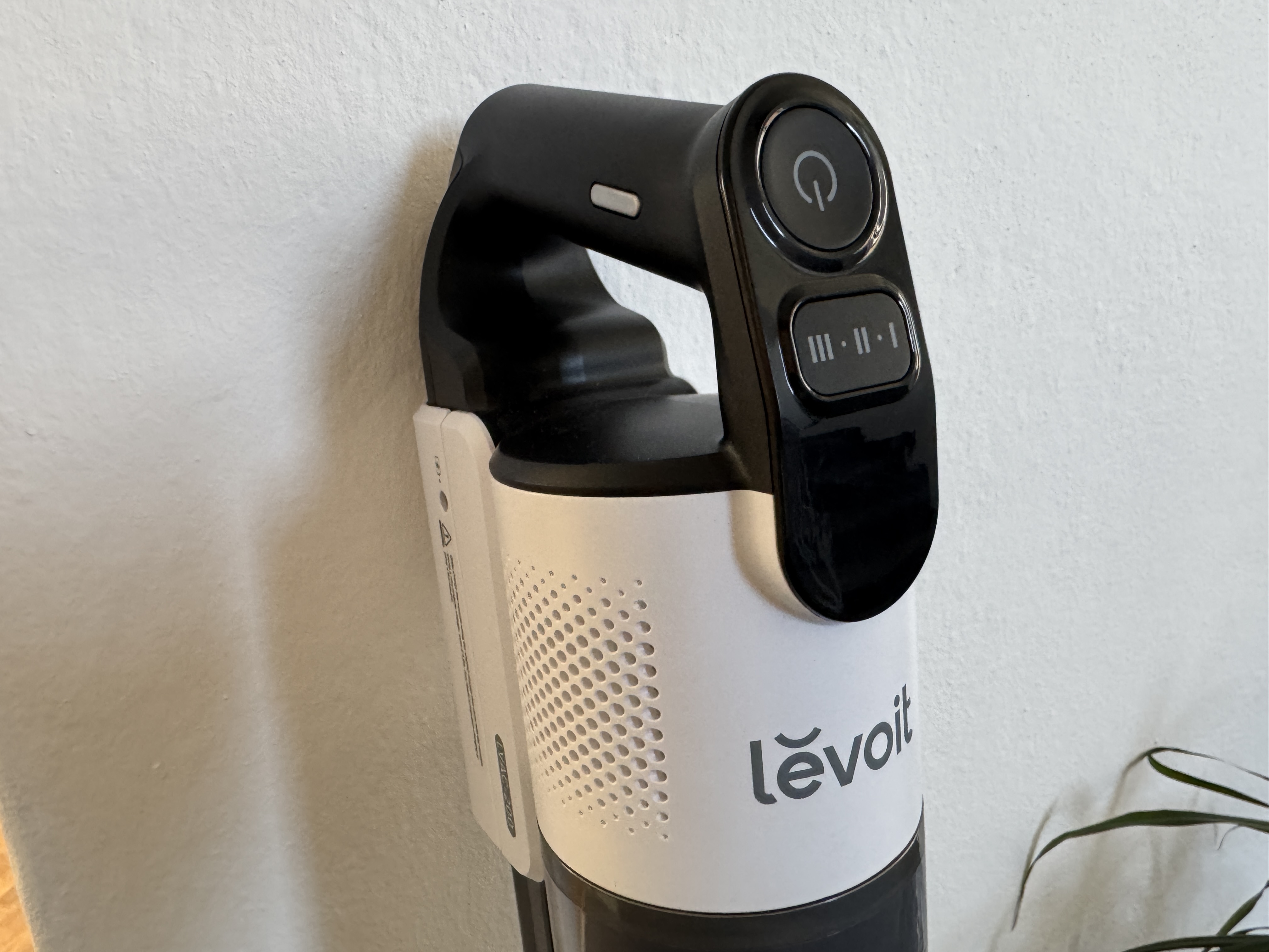 Levoit vsadil na lehkou konstrukci. Vysavač, jak stojí výše, má hmotnost zhruba 1,45 kg, takže jej snadno uzvednete i jednou rukou. Tělo kombinuje bílé plastové části s kovovou prodlužovací trubicí, což na první pohled působí moderně a prakticky. Nad rukojetí najdete indikační diody baterie, tlačítko On/Off a samostatné tlačítko pro přepínání mezi režimy Eco a Turbo.