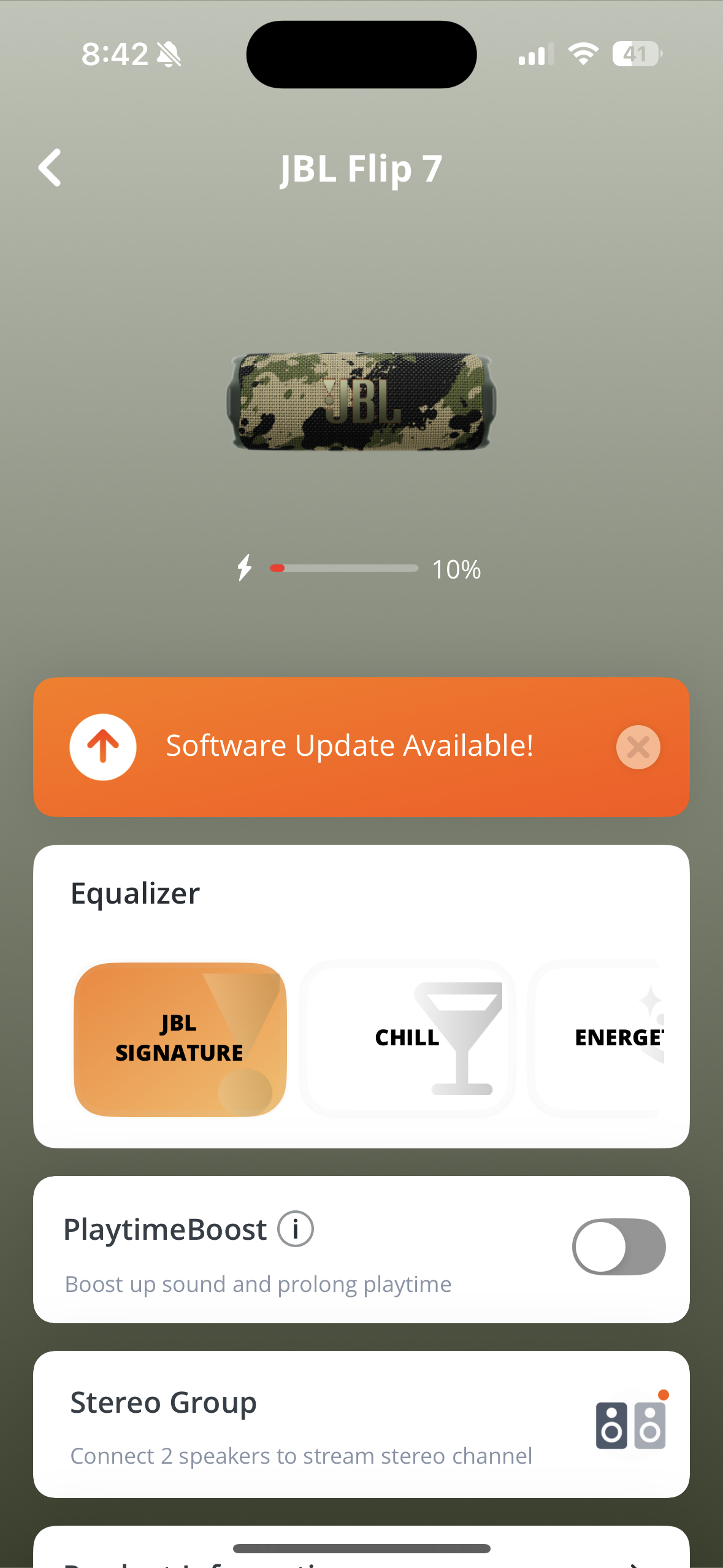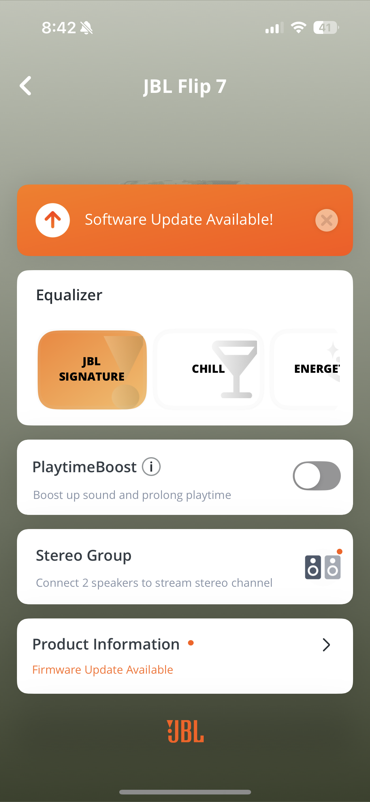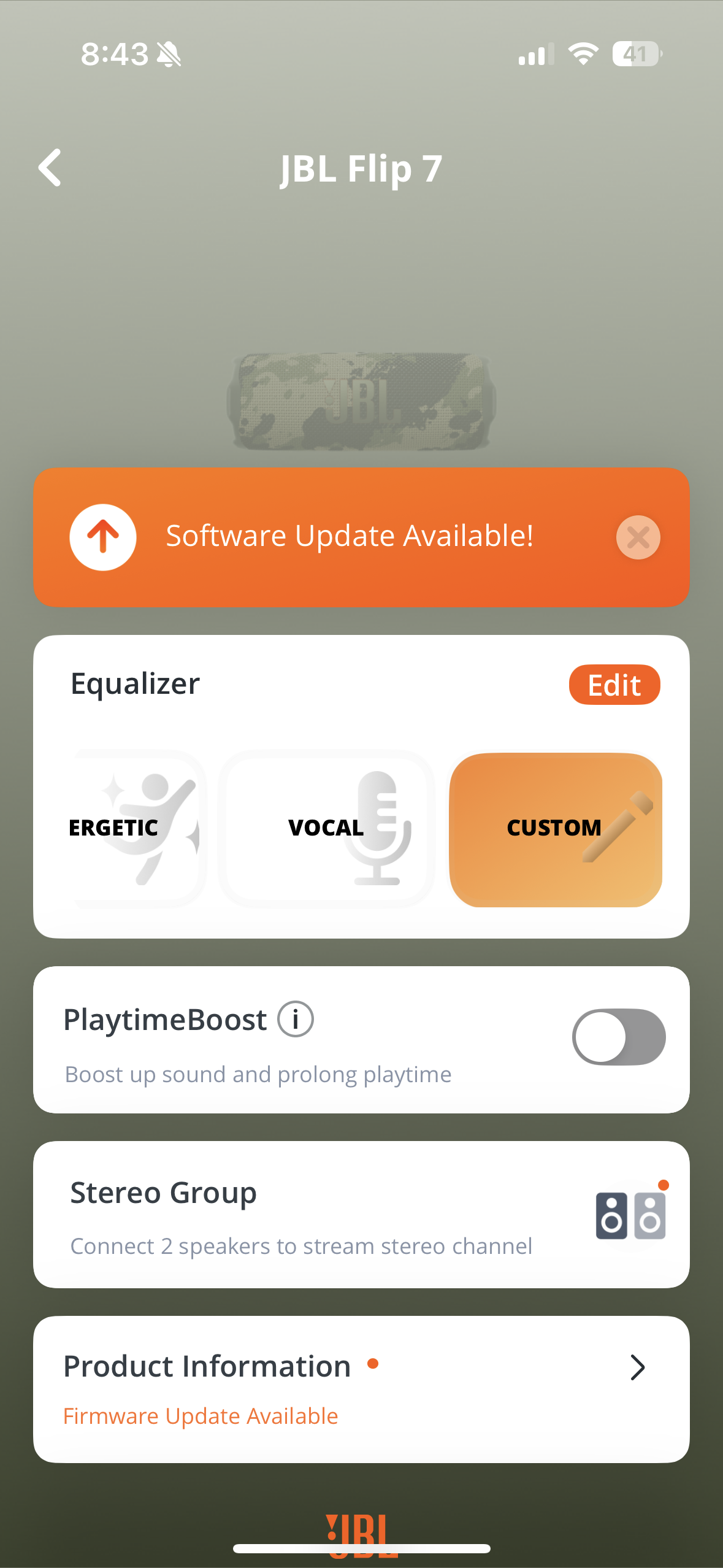 Pro úplnou kontrolu nad nastavením a aktualizacemi firmwaru je tu aplikace JBL Portable, kterou stáhnete zdarma v App Store či Google Play. Díky ní můžete aktualizovat software reproduktoru, ladit zvukové profily nebo spravovat připojení Auracast. Aplikace je intuitivní a v případě potíží (či hledání dalších tipů a triků) tu najdete i podrobnou podporu. Je sice v angličtině, ale vyzná se v ní naprosto každý. Také se zde nachází ekvalizér, v němž budete moci upravovat výšky, středy a hloubky. Pokud si s hodnotami trochu pohrajete, přizpůsobíte hudební projev JBL Flip 7 skutečně každému stylu. Plusem také je, že nemusíte provádět žádnou registraci.