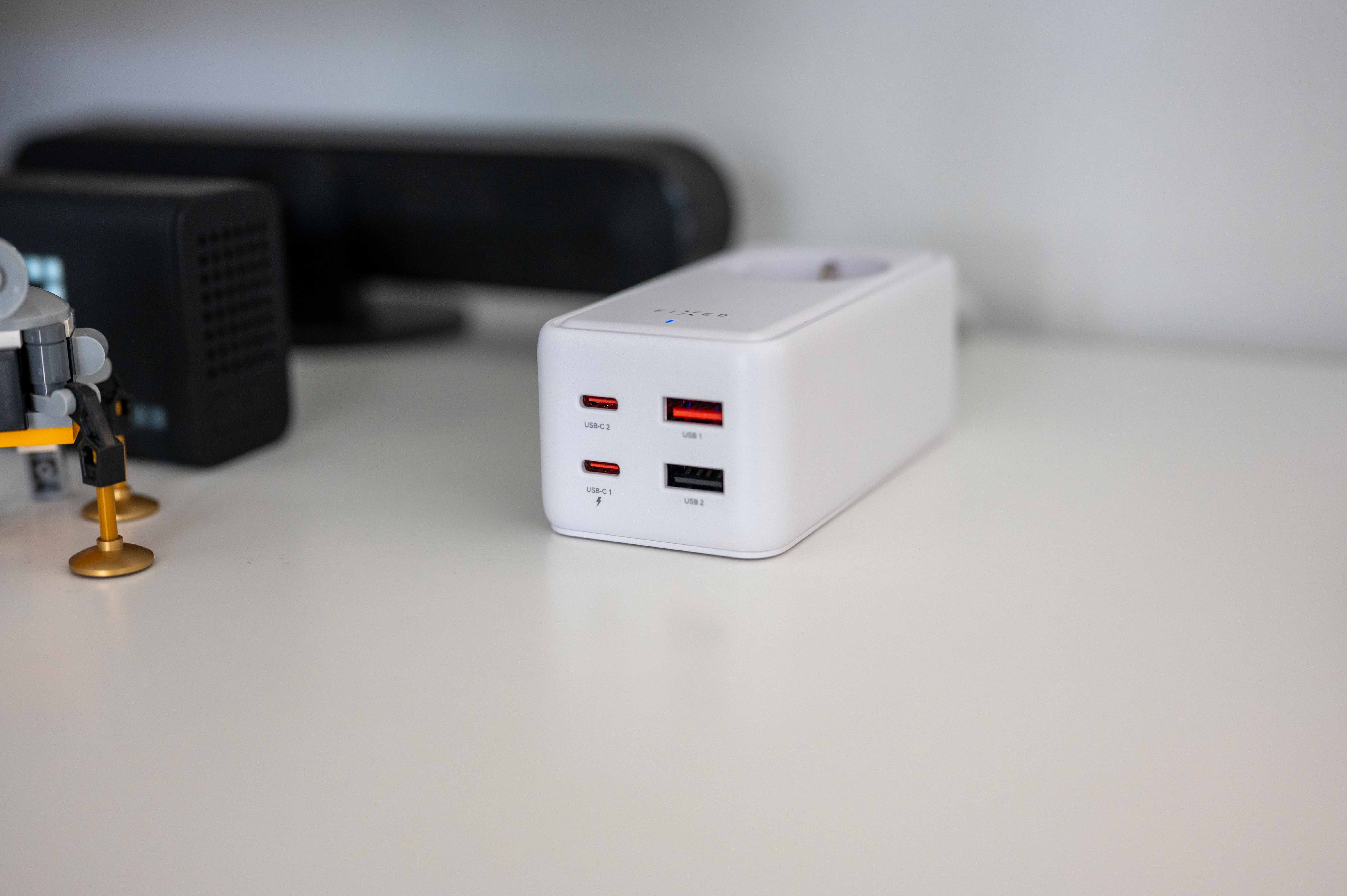 Díky integrovanému 1,5m napájecímu kabelu není problém adaptér umístit i v místech s hůře dostupnými zásuvkami, potažmo třeba na pracovní stůl, jak jsem to udělal já. Nabízí kombinaci klasické zásuvky pro zařízení do 2500 W a čtyř USB portů – dvou USB-C a dvou USB-A – což výrazně rozšiřuje jeho využitelnost. O stavu napájení informuje nenápadná LED dioda.
