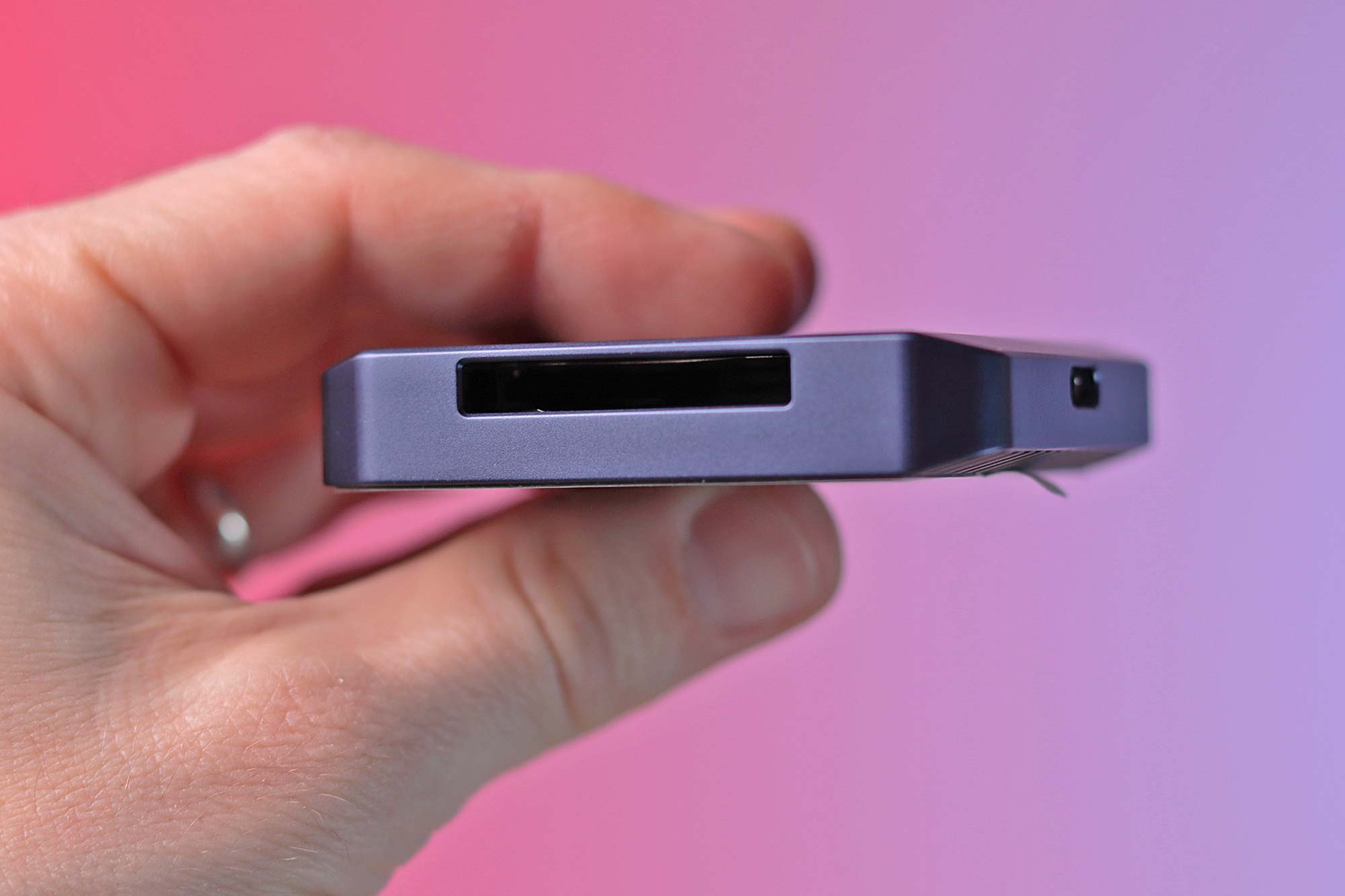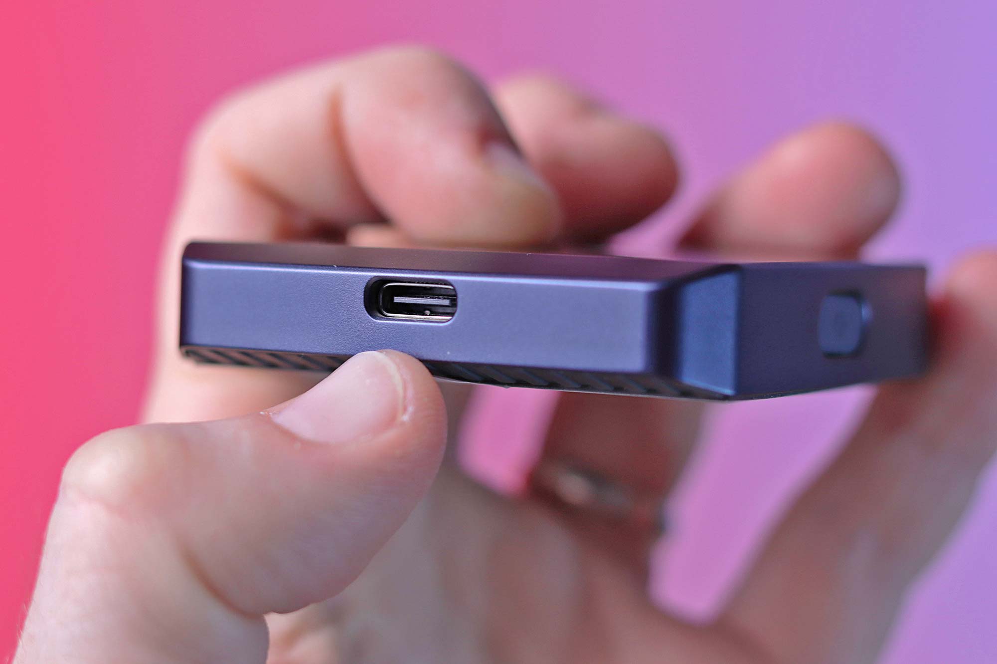 Z jedné strany je k dispozici slot na paměťovou kartu, do kterého jí zasunete a zacvaknete. Další strana nabízí USB-C port na zastrčení kabelu a pak je tu také zapínací tlačítko. To se hodí vždy, když chcete šetřit energii. Čtečka je totiž napájená přímo z iPhonu, takže je více než přínosné, když celý den filmujete, čtečku vypínat a šetřit energií telefonu.