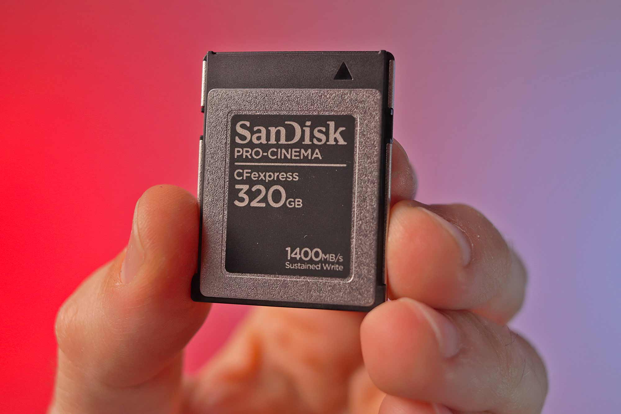 Je důležité poznamenat, že pro dosažení optimálního výkonu je nezbytné používat kvalitní a rychlé paměťové karty CFexpress Type B. SanDisk nabízí vlastní řadu těchto karet s názvem Pro-CINEMA, které jsou navrženy tak, aby poskytovaly vysokou rychlost zápisu a čtení, což je nezbytné pro práci s videem ve formátu ProRes. Nabízí se v kapacitách 256, 320 a 640 GB. Já tu mám 320GB verzi a vězte, že s takovou uložíte maximálně 16 minut videa v té největší možné kvalitě. Na druhou stranu, málokdo bude natáčet 4K video při 120 fps. Při snížení na 60 fps je pak tato kapacita vhodná pro uložení až 53 minut, což už je rozhodně lepší.