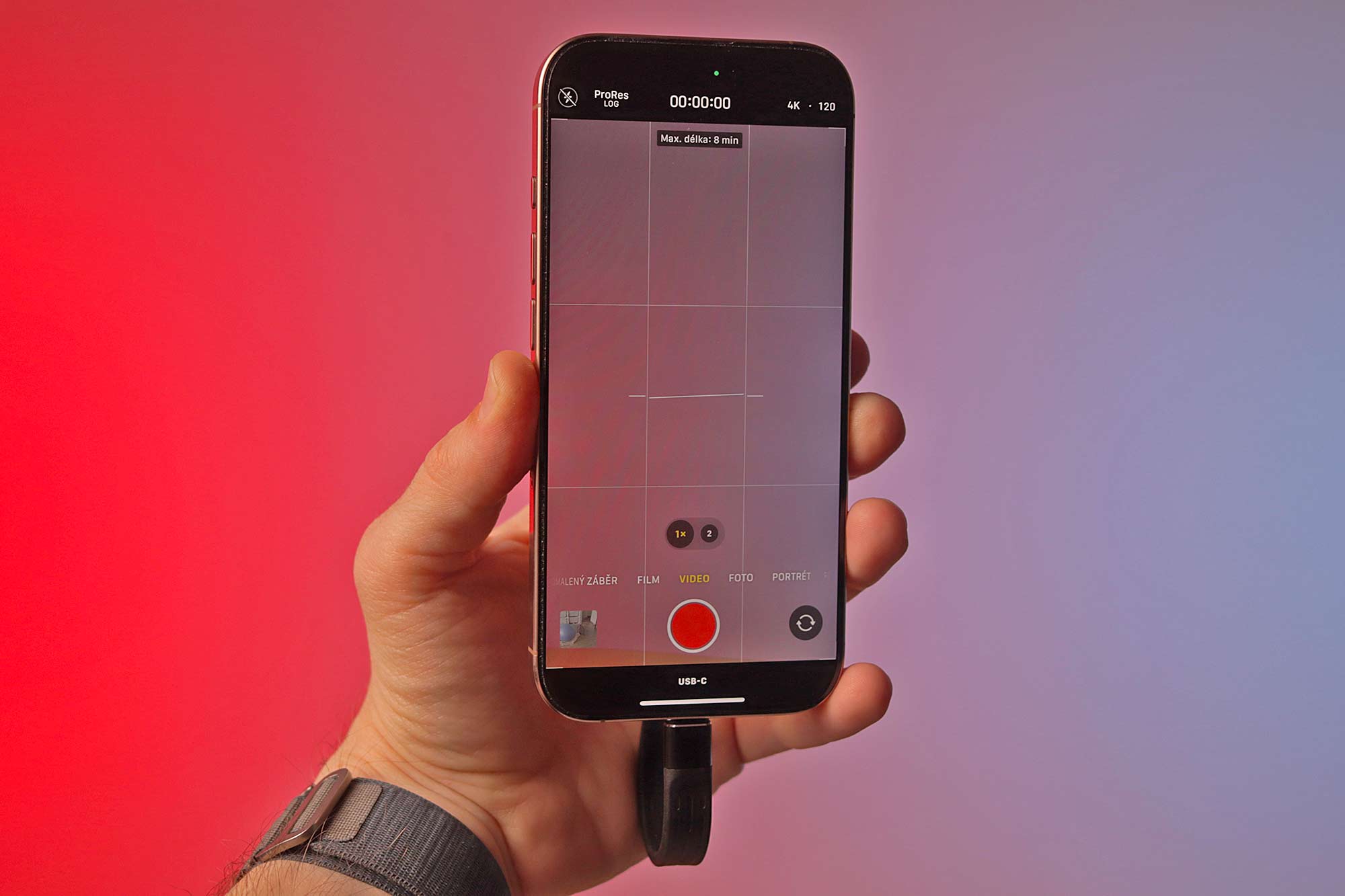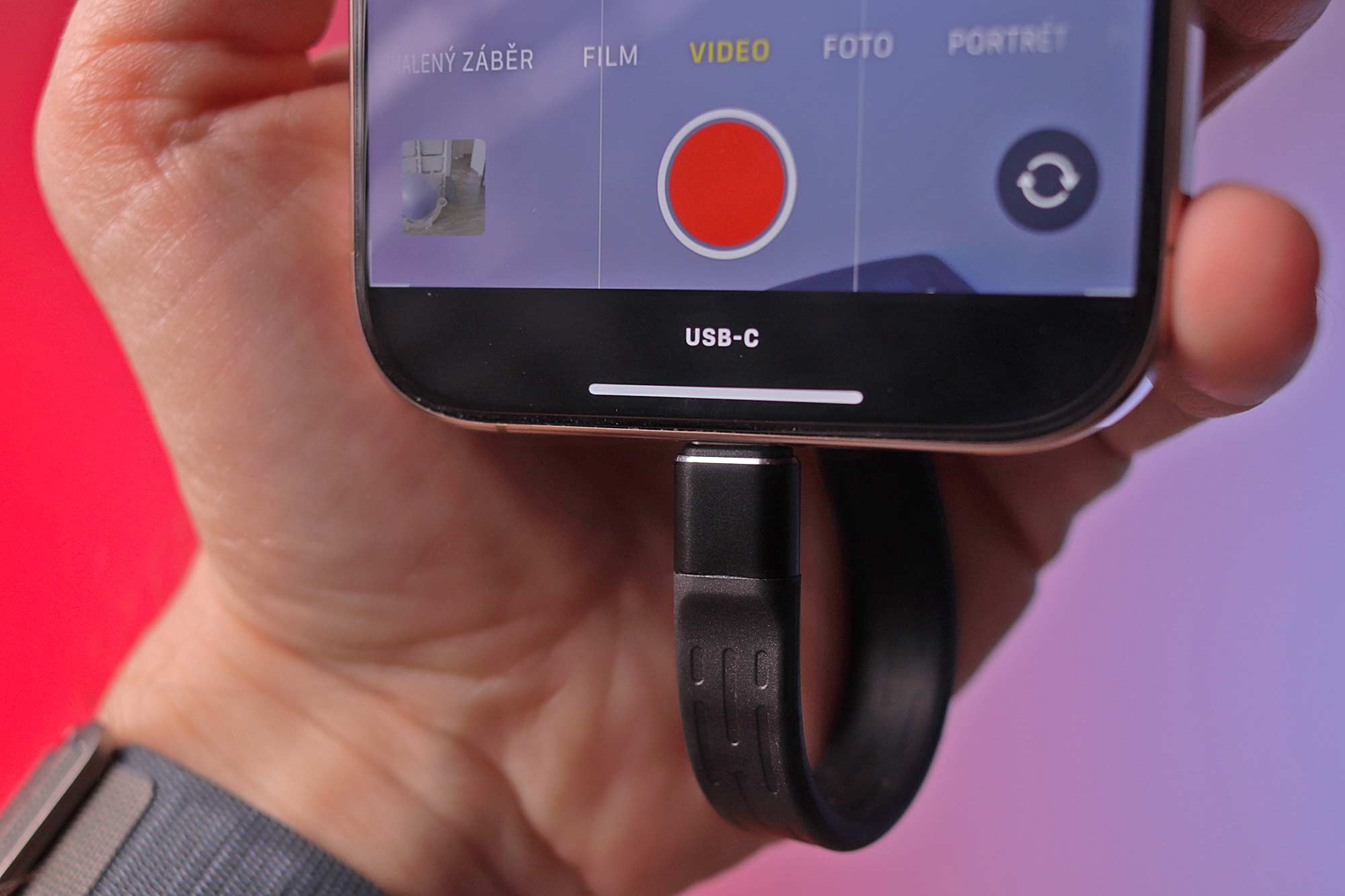 V balení dostanete se čtečkou ještě rychlý USB-C kabel, který je tak akorát dlouhý, aby nepřekážel při natáčení, ale pohodlně se zapojoval. Kabel můžete využít samozřejmě i vlastní, ale dejte si pozor, aby podporoval vysoké rychlosti. Levnější jsou totiž pomalé, takže byste poté iPhonem nemohli natáčet do ProRes formátu a Log prostoru.