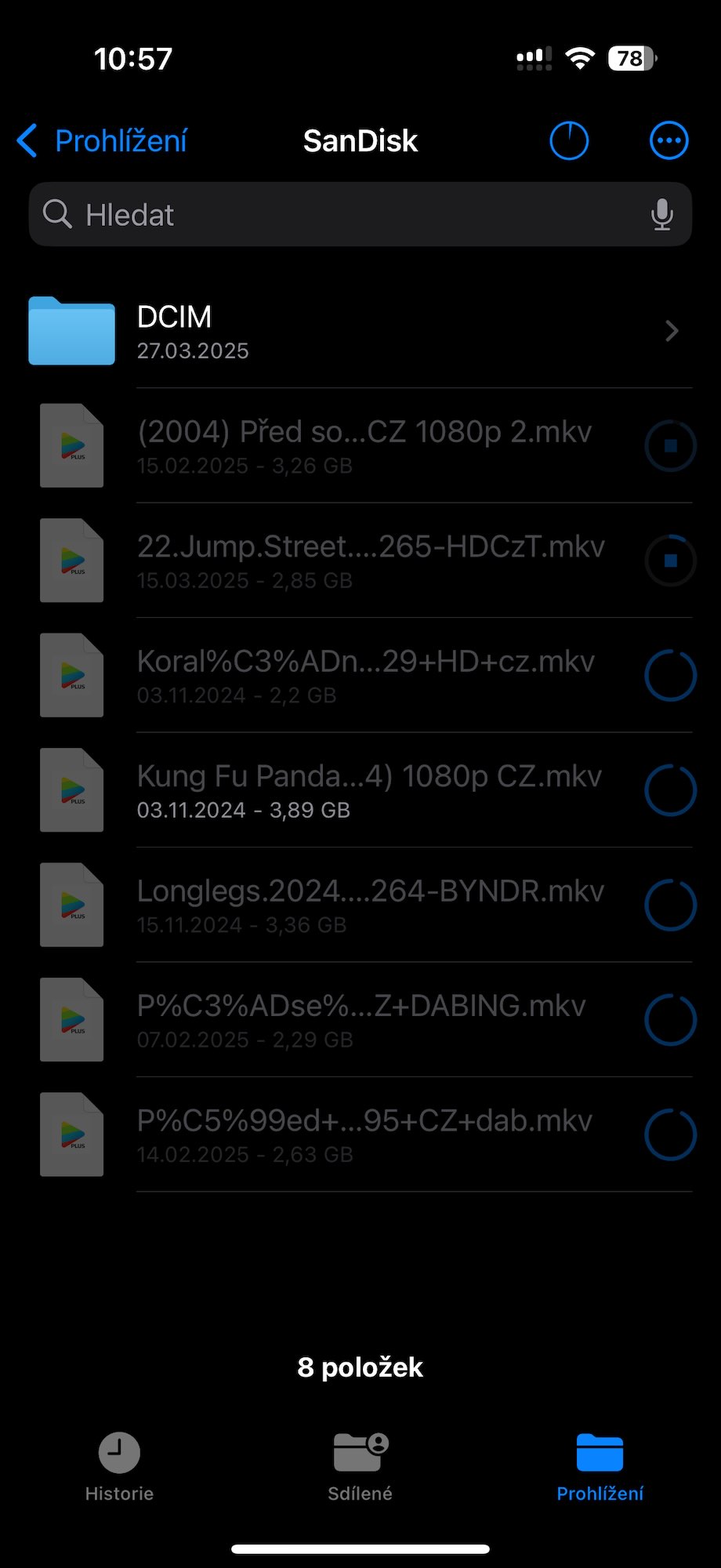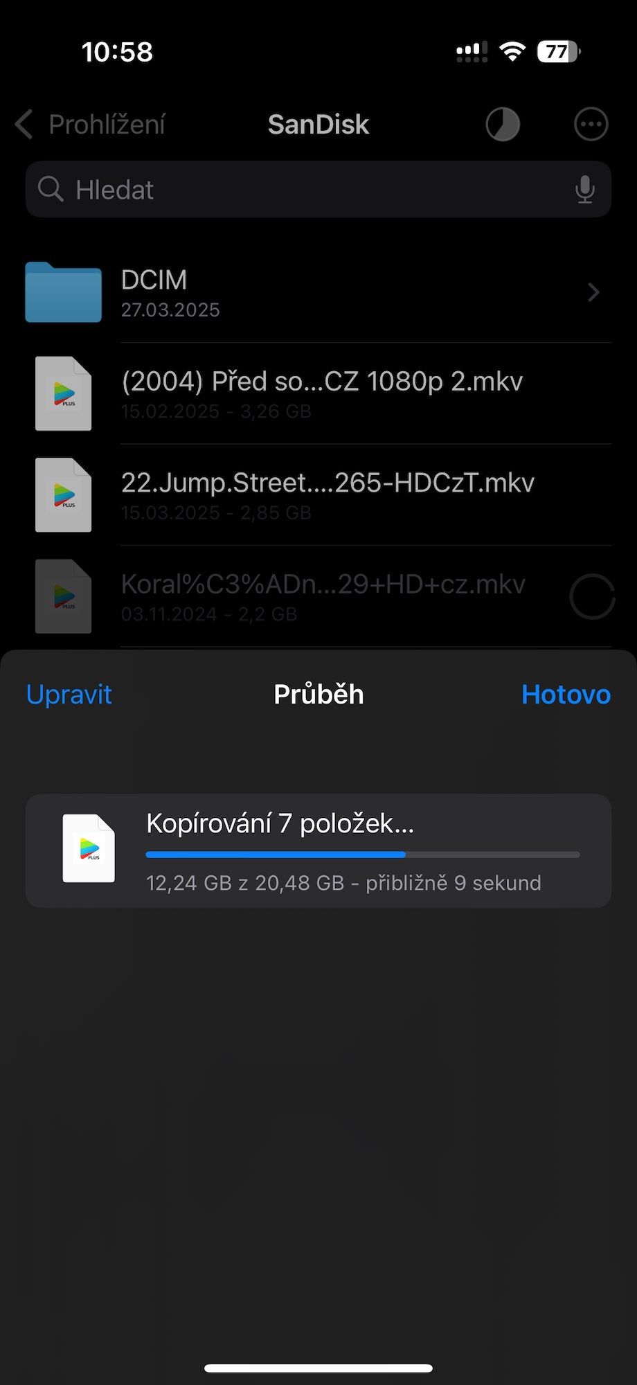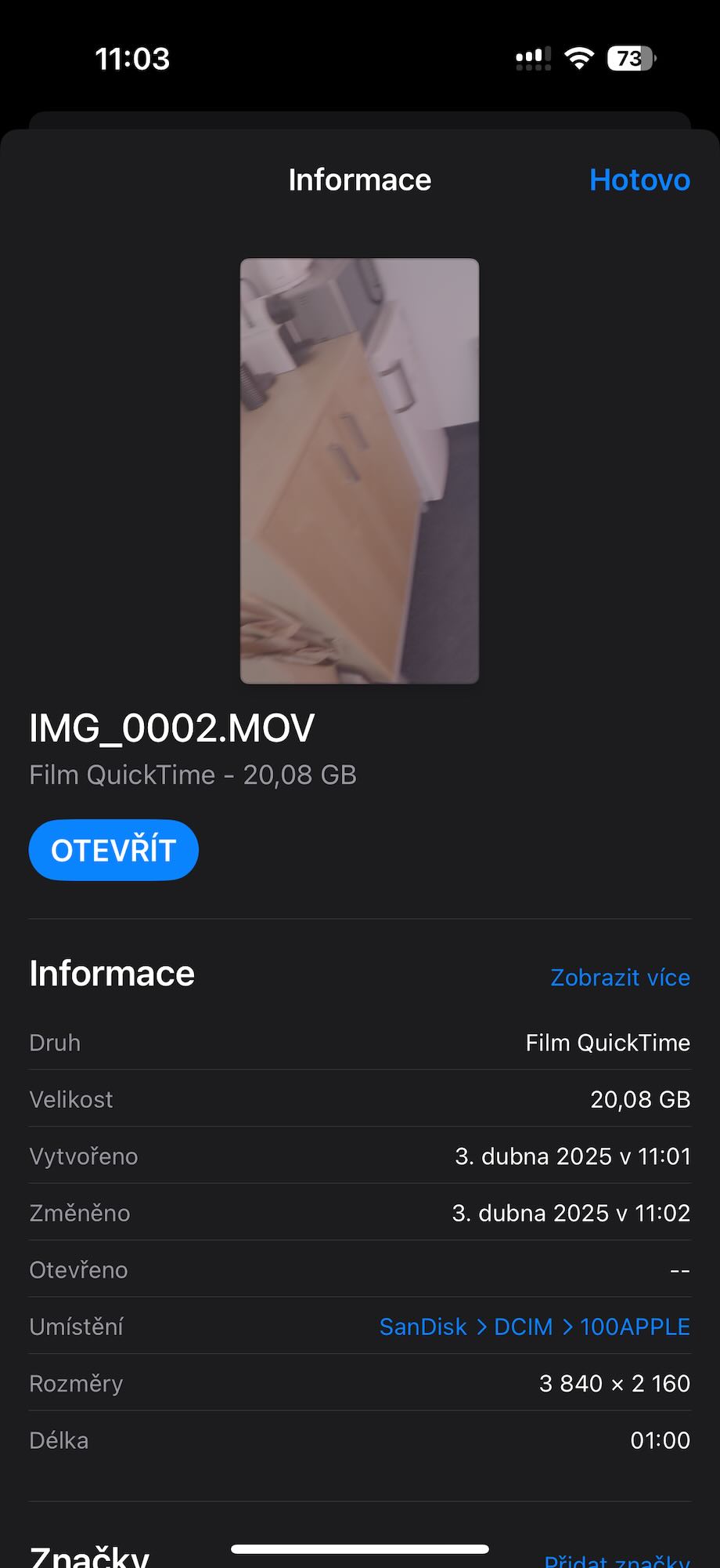 Při zapojení čtečky a vložení karty se u zapnutí aplikace Fotoaparát a režimu video ukazuje ve spodní části informace, že máte připojené USB-C zařízení. Po povolení natáčení do ProRes formátu se bude video ukládat do připojené paměťové karty. Po natočení se k videu dostanete snadno z aplikace Soubory, kde je možné si video prohlédnout nebo si ho poslat. V případě vysoké kvality je ale vhodnější čtečku s kartou odpojit a připojit k Macu, kam video soubory nahrajete. Přes AirDrop byste čekali dlouho.
