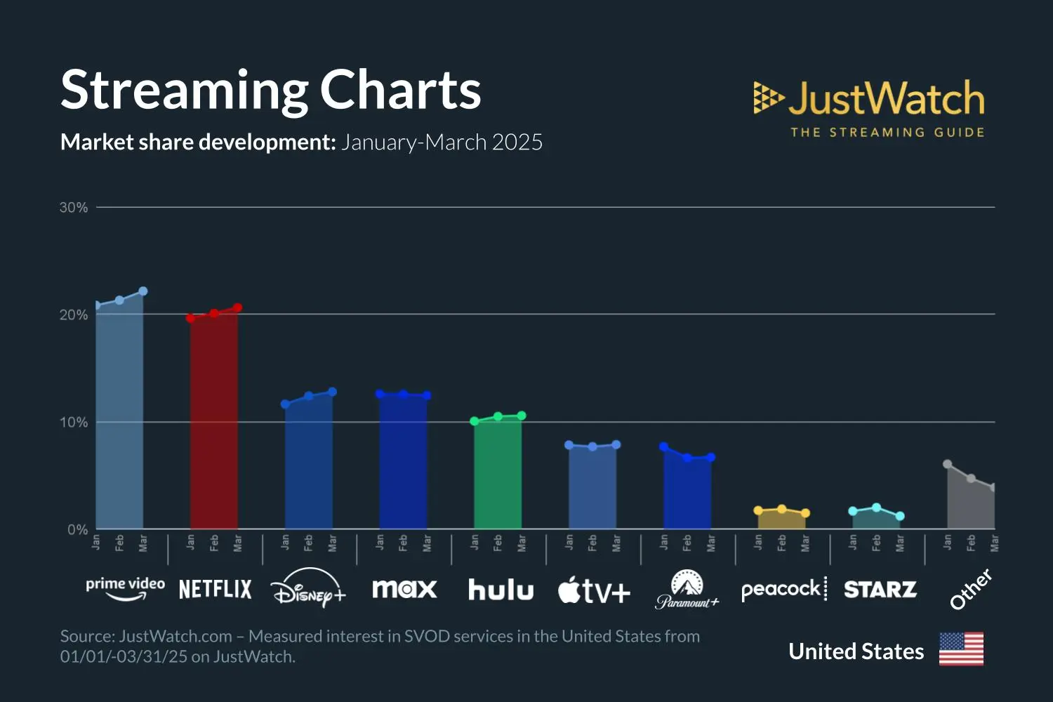 Podle zprávy JustWatch o podílu streamovacích platforem v USA za první čtvrtletí 2025 si Apple TV+ s 8 % stále drží pozici pod většinou hlavních konkurentů: