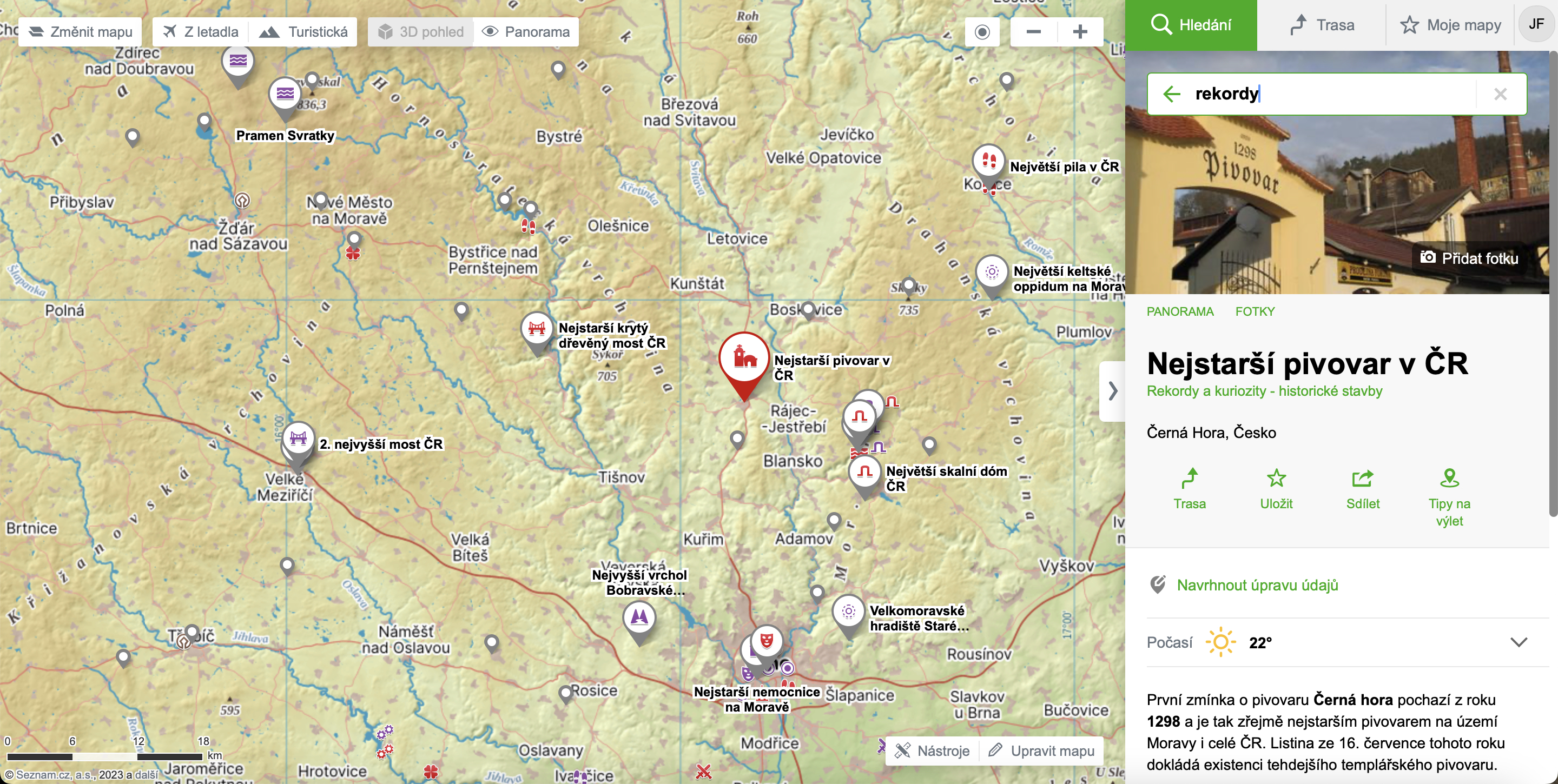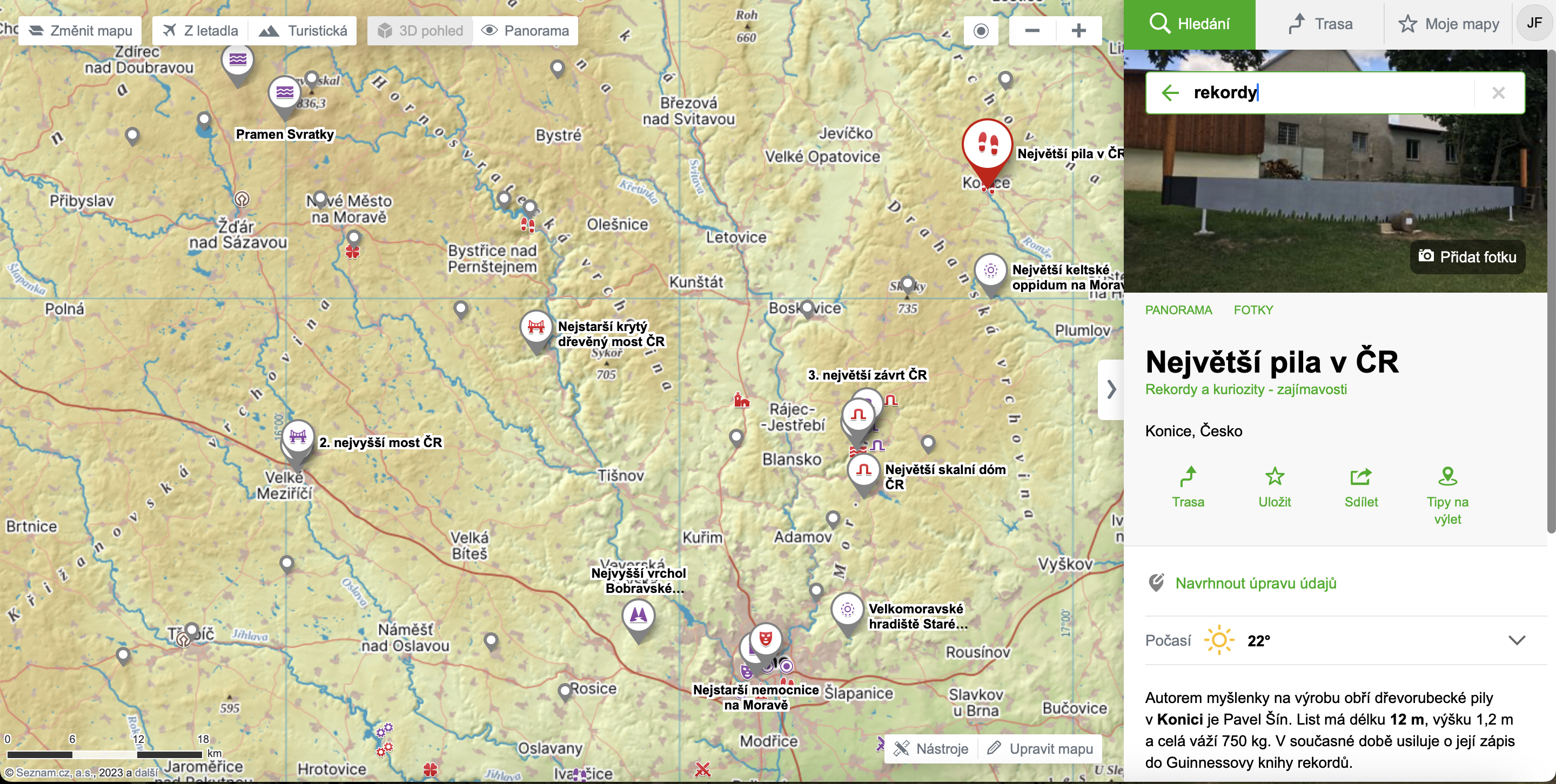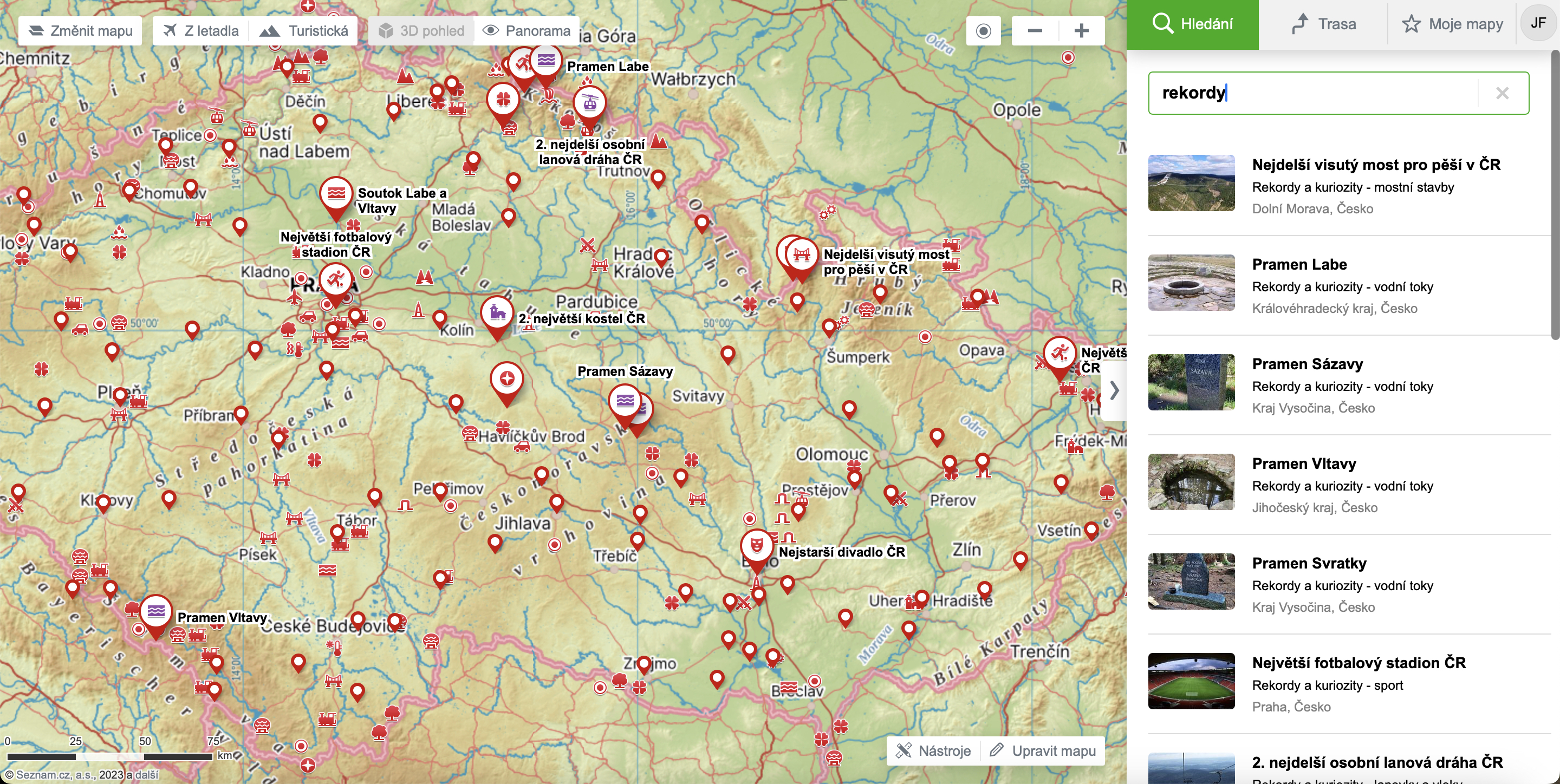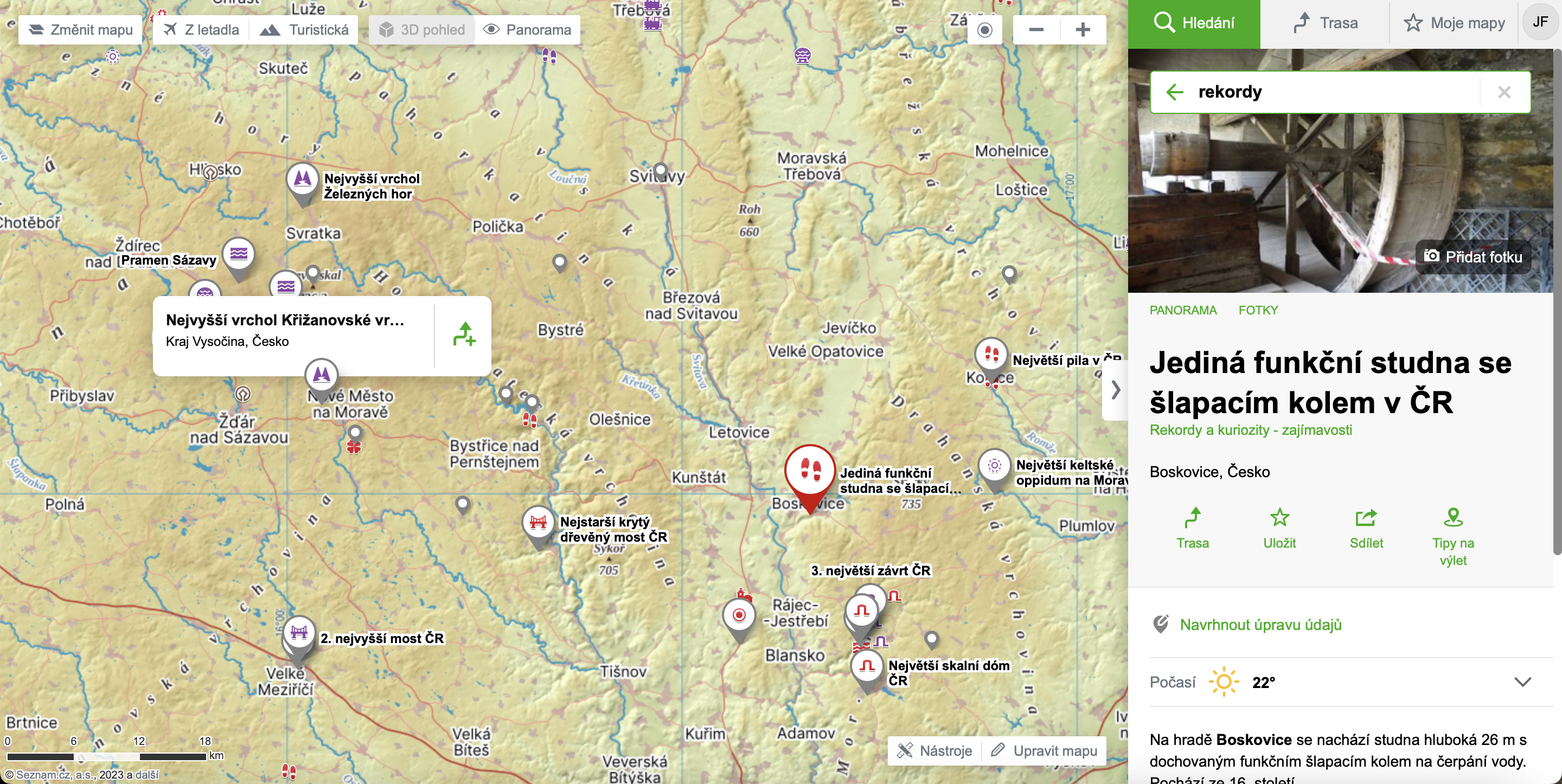 Jakmile zadáte do pole pro vyhledávání frázi „rekordy a kuriozity“, na mapě Česka vám vyskočí spousta ikonek, které vám po rozkliknutí prozradí, jaký rekord je s daným místem spjat. Dozvíte se například to, kde je nejstarší pivovar v Česku, kde je největší fotbalový stadion či skokanský můstek, ale taktéž kuriozity jako třeba kde naleznete největší pilu. Zkrátka a dobře, zajímavostí je habaděj a minimálně při dlouhých chvílích není špatné na ně mrknout a trochu se vzdělat či pobavit.