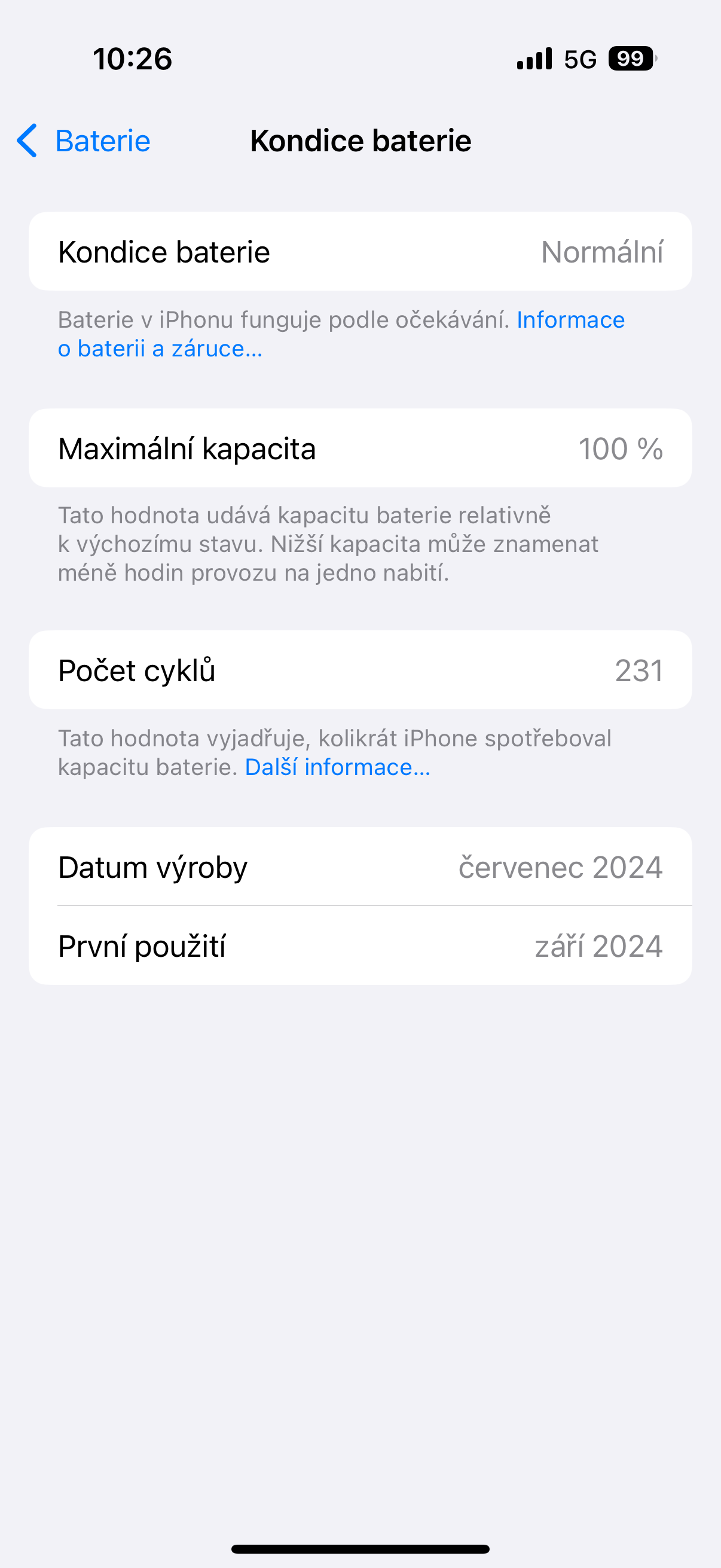 iPhone 16 Pro jsem dostal stejně jako každý předchozí model při zahájení jeho prodeje. To znamená, že jej nyní mám půl roku a baterie stále hlásí 100% kapacitu. U předchozích telefonů se mi přitom stávalo, že touto dobou byla baterie již okolo 95-98% a téměř nikdy jsem nezažil 100% kapacitu po půl roce. Nemyslím si, že by Apple nějak zásadně vylepšil baterii, ale já udělal jednu zásadní změnu. Dříve jsme nabíjel přes noc a ráno jsem se budil s telefonem, který byl sice nabitý na 100 %, ale zároveň byl celou noc na nabíječce. A i když má Appel přímo na svém webu články o tom, že to vlastně nevadí, má tam i články o tom, že je dobré jej po nabití z nabíječky odpojit. Můžete si tedy vybrat, co je lepší řešení. V mém případě se zdá, že lepší řešení je telefon nabíjet až během dne, kdy jej mohu po nabití odpojit z nabíječky.