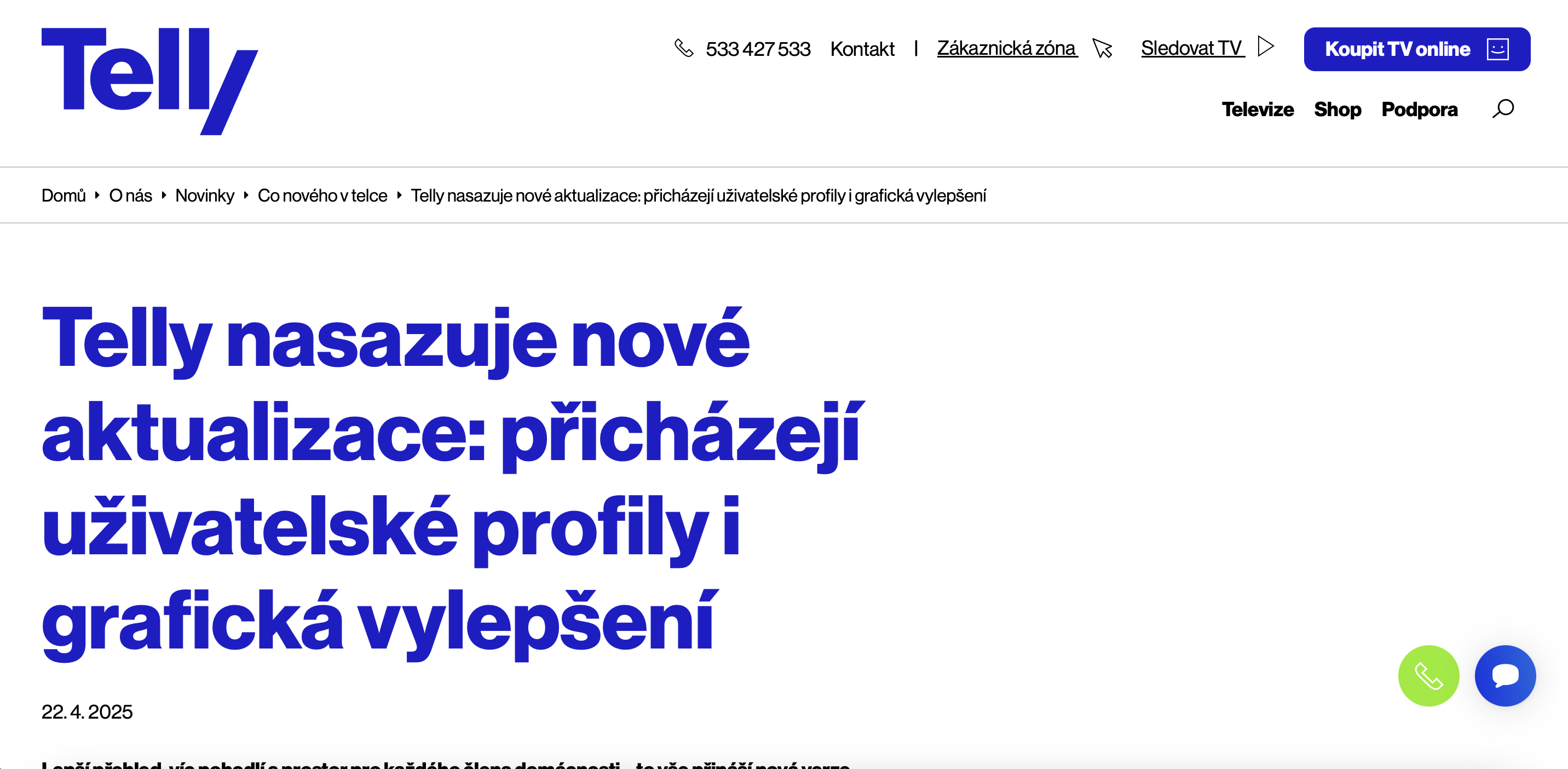 V poslední době taktéž dorazila zajímavá aktualizace, která do Telly přináší uživatelské profily. Nyní si tedy appku může pro každý člen domácnosti přizpůsobit dle svého uvážení. Aktualizace je dostupná na set-top boxy Arris 1113 a 4205, LG Smart TV a LG Android TV, Webových prohlížečích i na ostatních Android/iOS zařízeních.