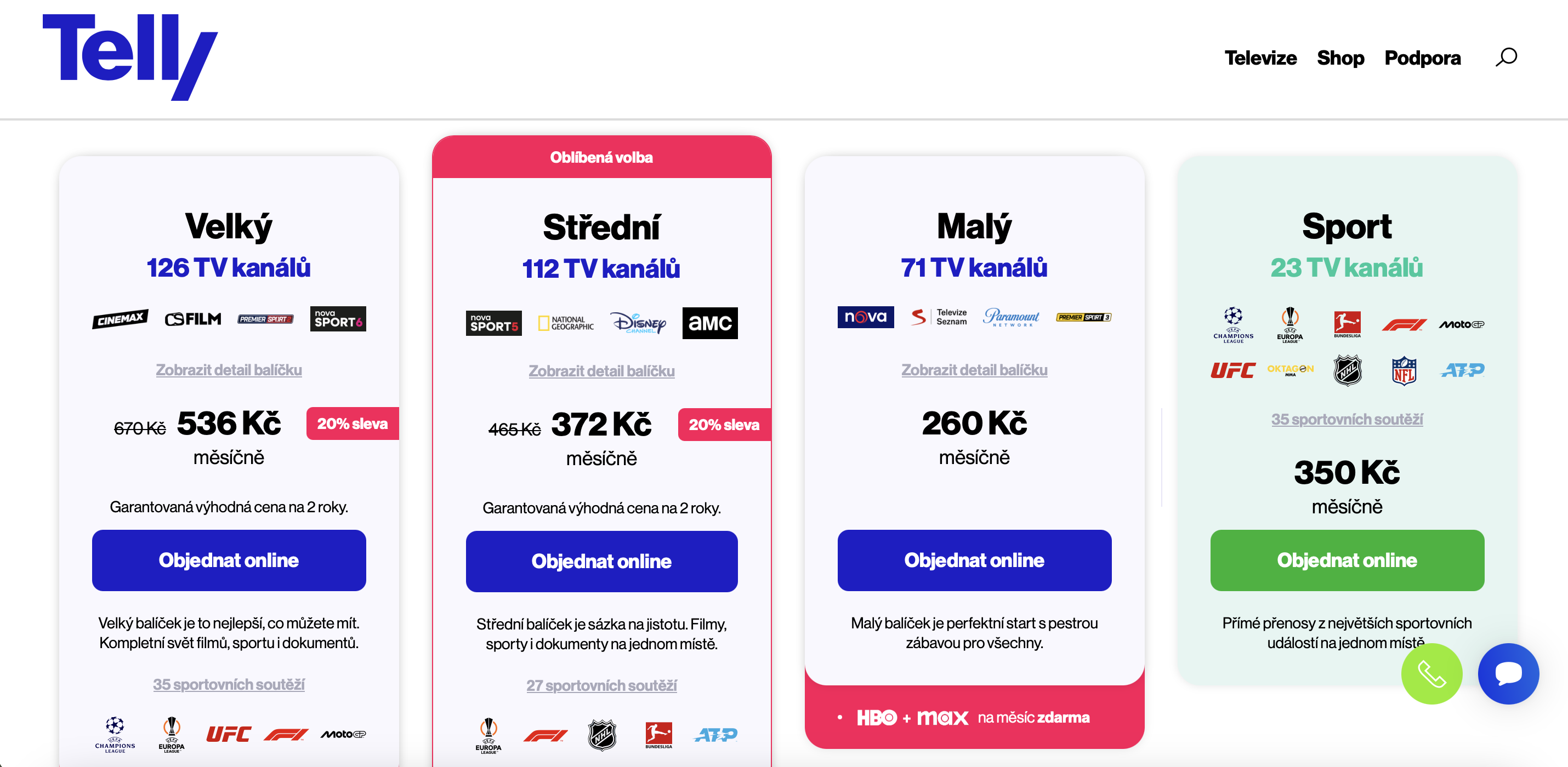Vyberete si z několika balíčků, a pokud vám stačí základ, zvolíte malý balíček se 71 kanály za 260 Kč. Milovníkům sportu Telly nabízí Sport balíček se 23 sportovními kanály. Pro filmové nadšence je zase k mání HBO balíček s HBO Max. Nahrávání pořadů, zpětné zhlédnutí či pozastavení vysílání už máte v ceně – bez dalších příplatků.