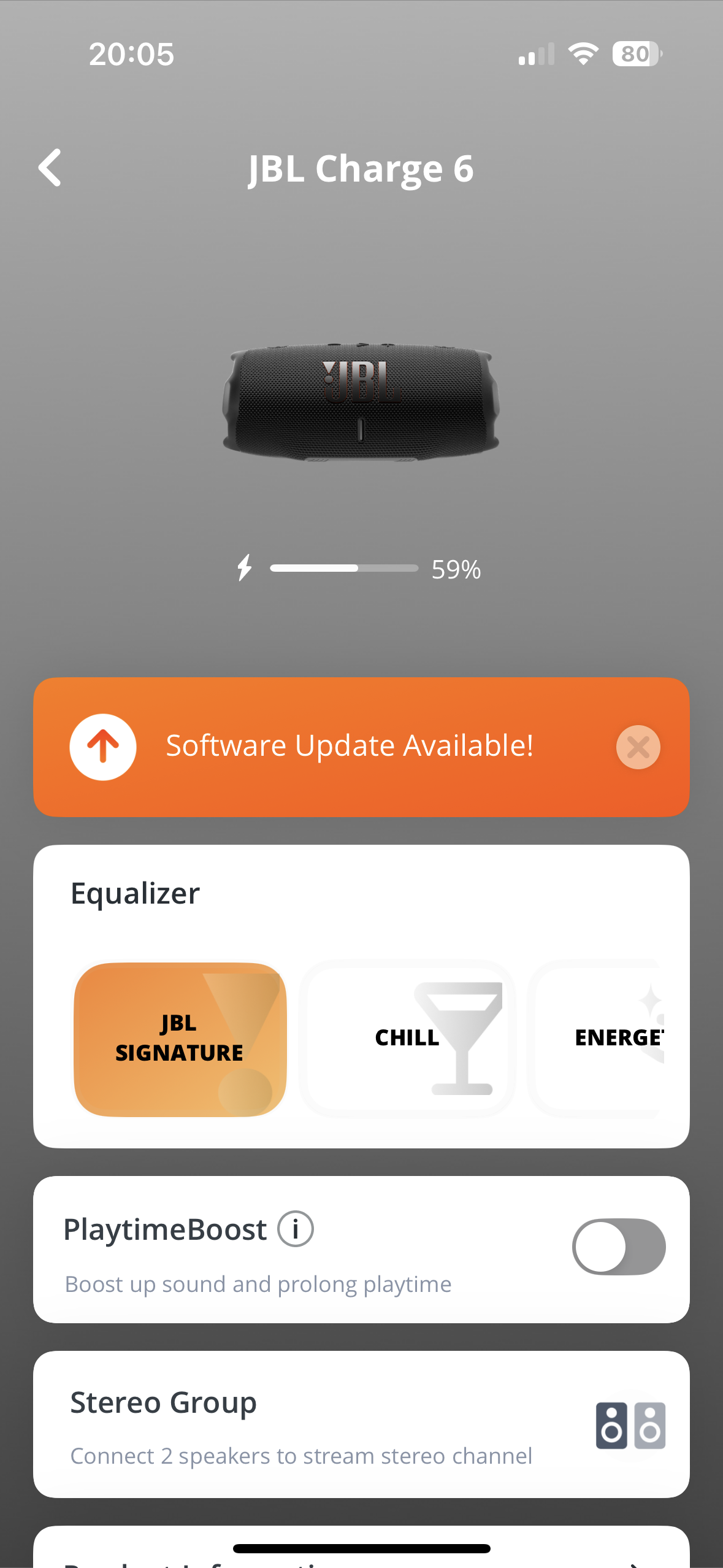 Stejně jako u ostatních produktů značky JBL i zde naleznete aplikaci, která vám pomůže z vašeho JBL Charge 6 vyždímat maximum. Kromě klasiky v podobě sledování stavu baterie zde rovněž naleznete ekvalizér. Volit můžete z přednastavených režimů, či si upravit zvuk manuálně dle svého gusta. Na každý pád pokud se nevyznáte, příliš bych se do toho nepouštěl. Já volil klasický režim nesoucí název JBL Signature, který má za mě nejlepší basy. V aplikaci rovněž můžete zapnout onen již zmíněný úsporný režim (Playtime Boost), zřídit stereo či aktualizovat software. Aplikace je k dostání zdarma jak v App Store, tak Google Play.